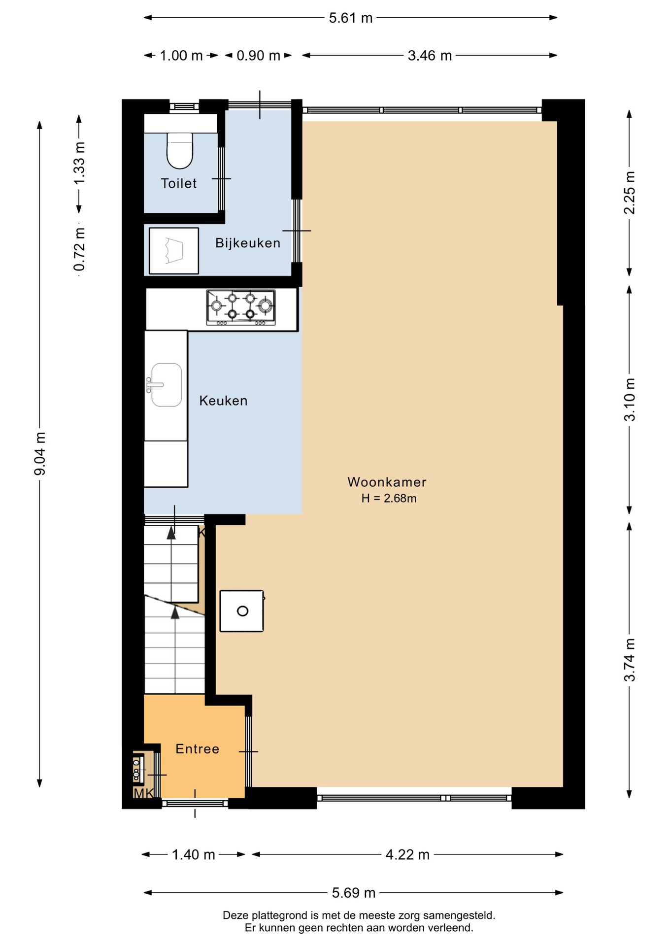 Vanuit de entreehal, met meterkast en trapopgang, zijn de woon-/eetkamer en de keuken bereikbaar. De woonkamer, aan de voorzijde van de woning gelegen, is voorzien van een laminaatvloer, inbouwspots en een sfeervolle houtkachel (ter overname). De grote ramen zorgen voor veel lichtinval. In het verlengde van de woonkamer is de eetkamer gesitueerd. Vanuit de eetkamer zijn de open keuken en de bijkeuken bereikbaar. De keuken is voorzien van opbergruimte en diverse apparatuur: gasfornuis, afzuigkap, koelkast, vaatwasser en Quooker. Vanuit de keuken is de kelder bereikbaar. De bijkeuken, met toilet en witgoedaansluitingen, geeft toegang tot de tuin.