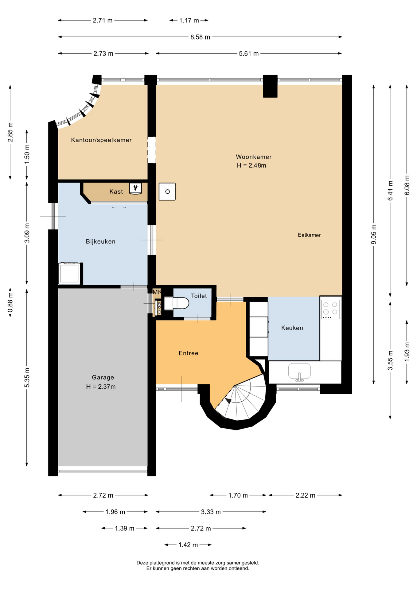 De entreehal, met toilet, geeft toegang tot de woonkamer met open keuken. De woonkamer, voorzien van een royale schuifpui aan de achterzijde, is licht en voorzien van een gezellige houtkachel. De open keuken bevindt zich aan de voorzijde en beschikt over diverse apparatuur, zoals kookplaat, afzuigkap, oven, koelkast, vriezer, vaatwasser en Quooker. Vanuit de woonkamer is middels de schuifpui toegang tot de achtertuin en via de bijkeuken (met witgoedaansluitingen) kun je ook naar buiten. Grenzend aan de woonkamer is een kantoor/speelkamer gesitueerd. Vloerverwarming is op de benedenverdieping aanwezig.