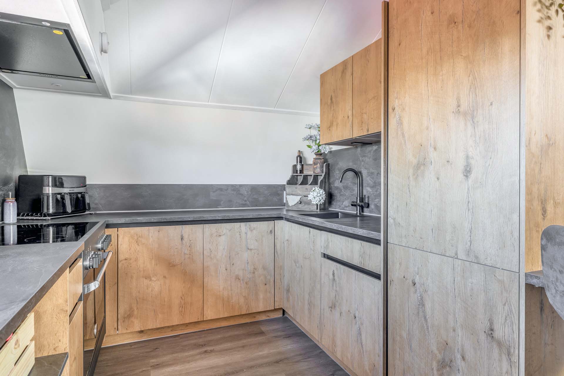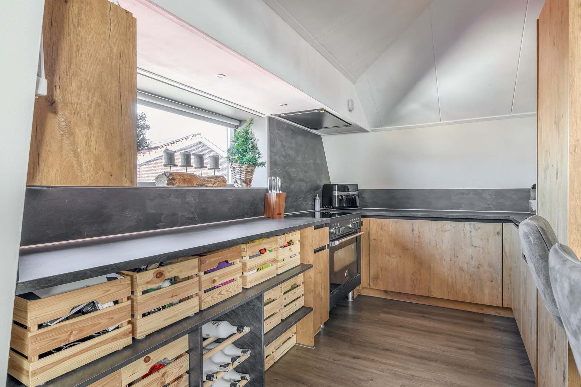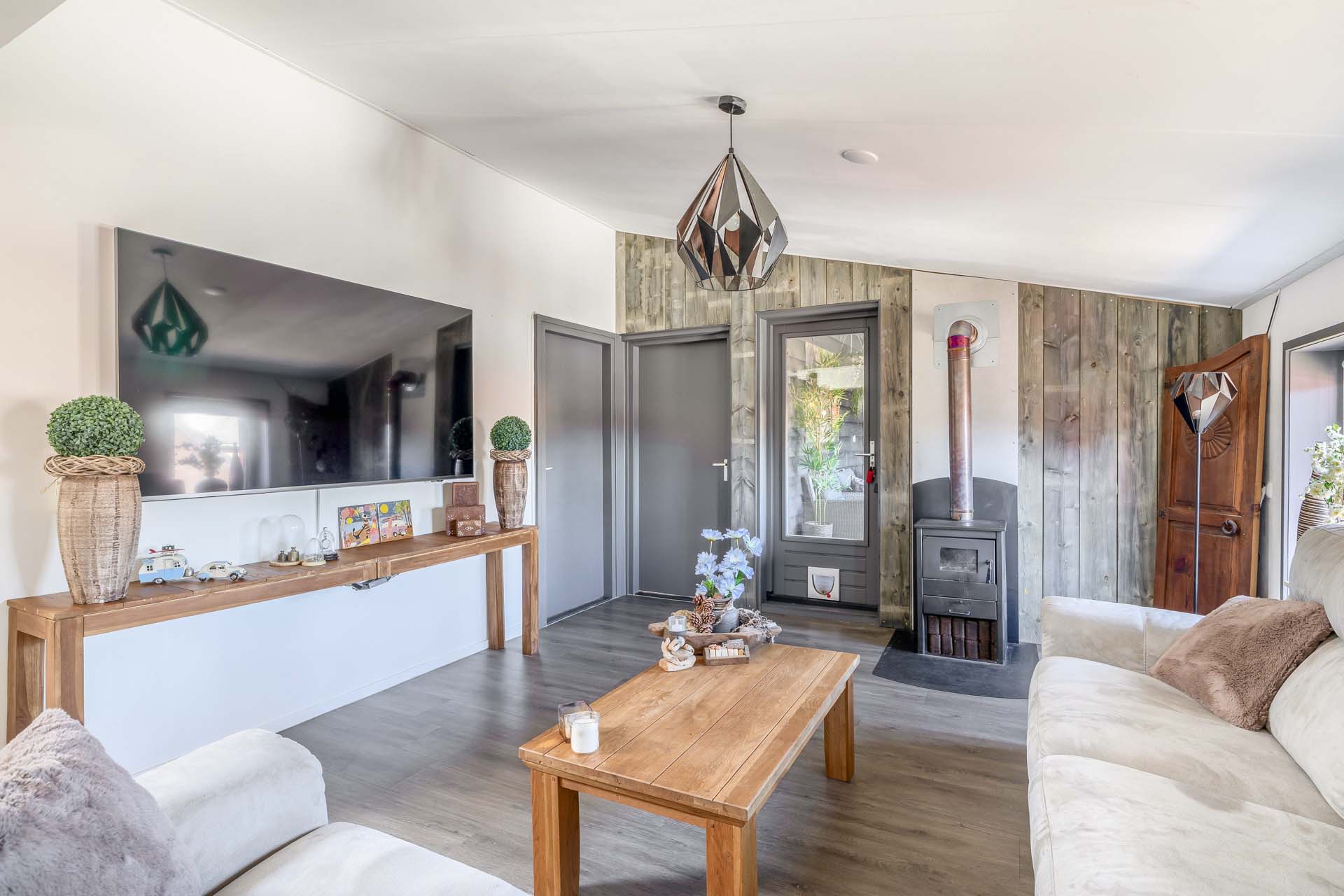 Op de eerste verdieping bevindt zich de sfeervolle woonlaag. De royale woonkamer voelt direct warm en uitnodigend aan, mede dankzij de houtkachel. Hier geniet je van lange avonden, gezelligheid en een prettige lichtinval. De open keuken sluit mooi aan op de woonkamer en is voorzien van inbouwapparatuur en een heetwaterkraan. Praktisch en stijlvol, precies wat je nodig hebt voor dagelijks comfort. Daarnaast zijn er drie fijne slaapkamers aanwezig, stuk voor stuk goed in te delen naar jouw wensen. De badkamer is compleet en comfortabel ingericht met een inloopdouche voorzien van regendouche, een whirlpool, toilet, wastafelmeubel en een designradiator. Een verzorgde ruimte waar je de dag ontspannen begint of juist afsluit.