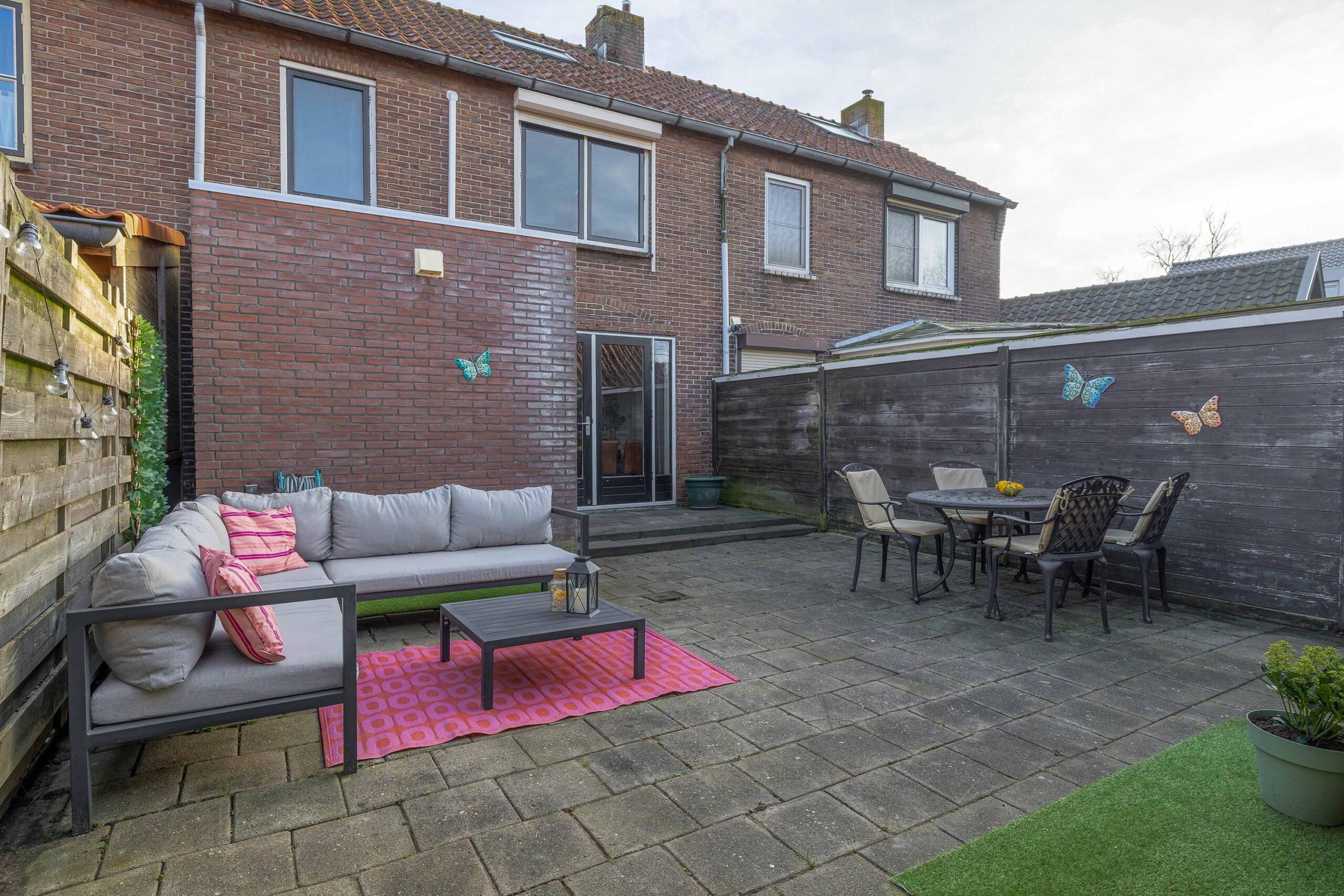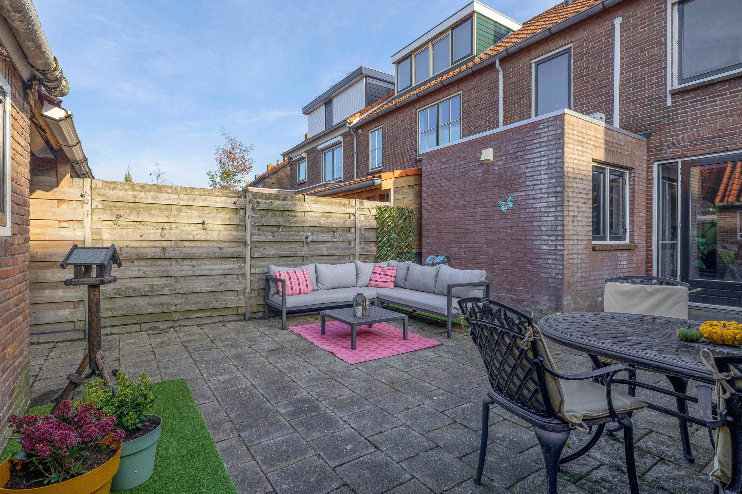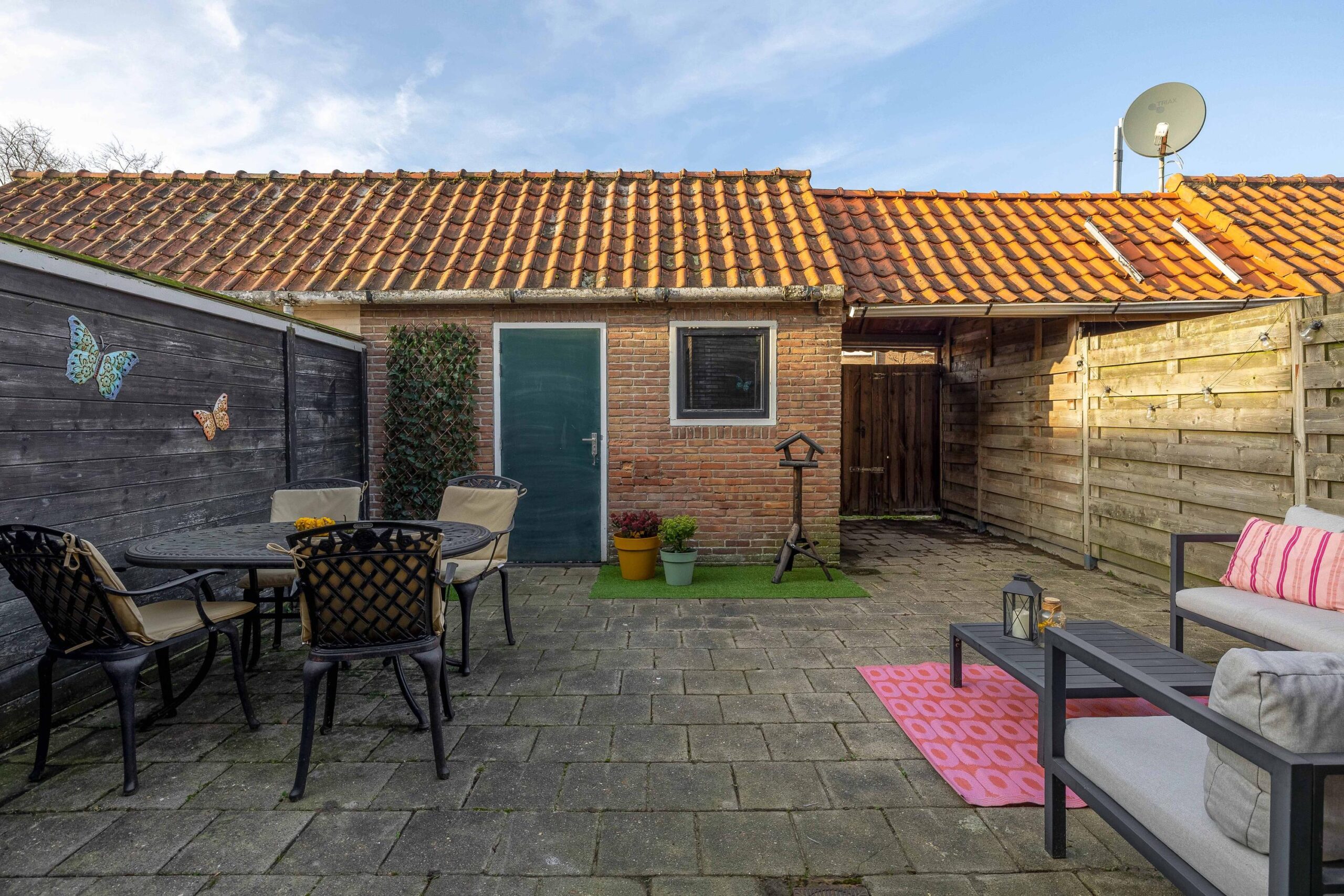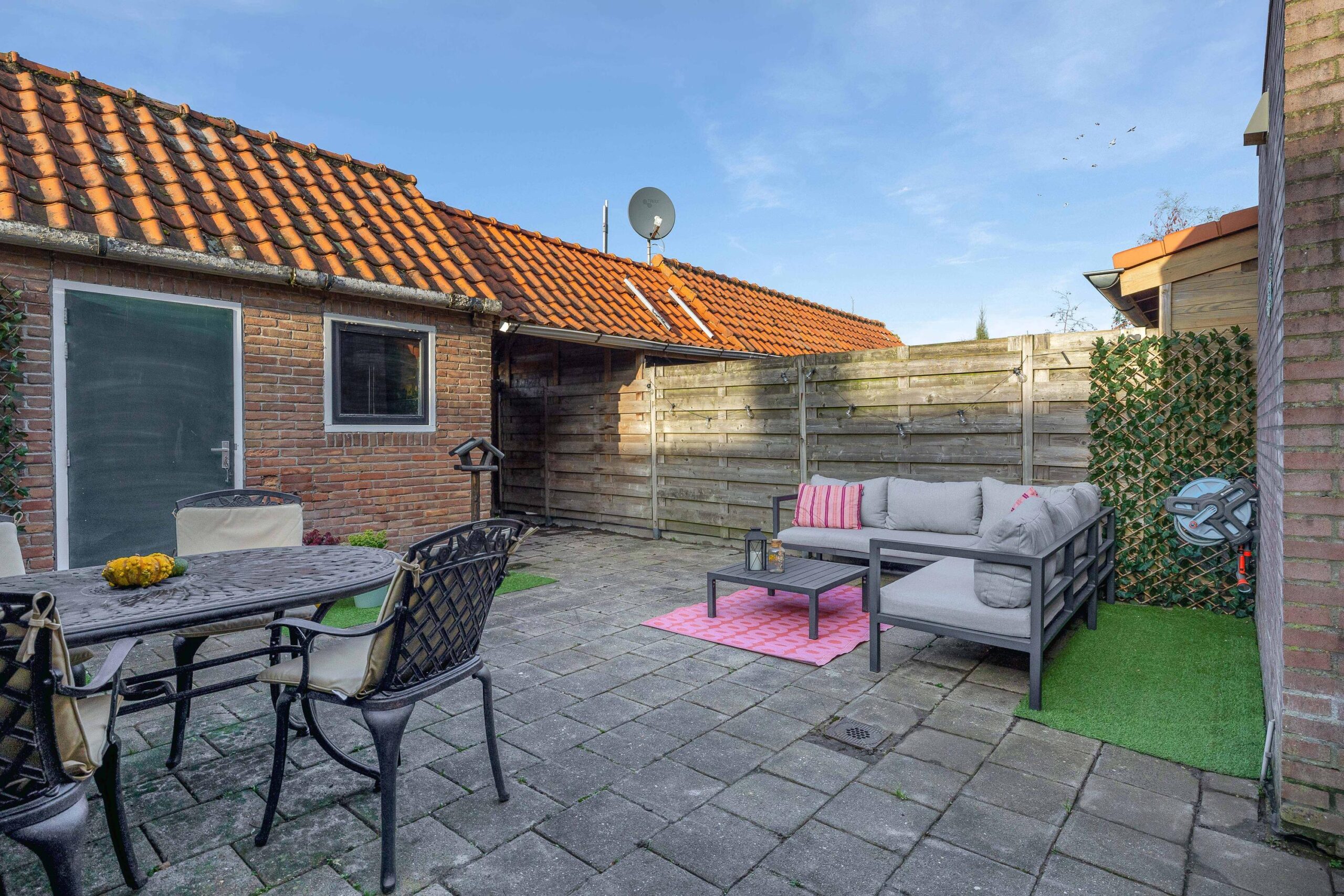 De achtertuin ligt op het westen en is bereikbaar via een achterom. Een knusse buitenruimte waar je tot in de avond van de zon kunt genieten. De vrijstaande stenen berging met elektriciteit biedt praktische extra opslagruimte.