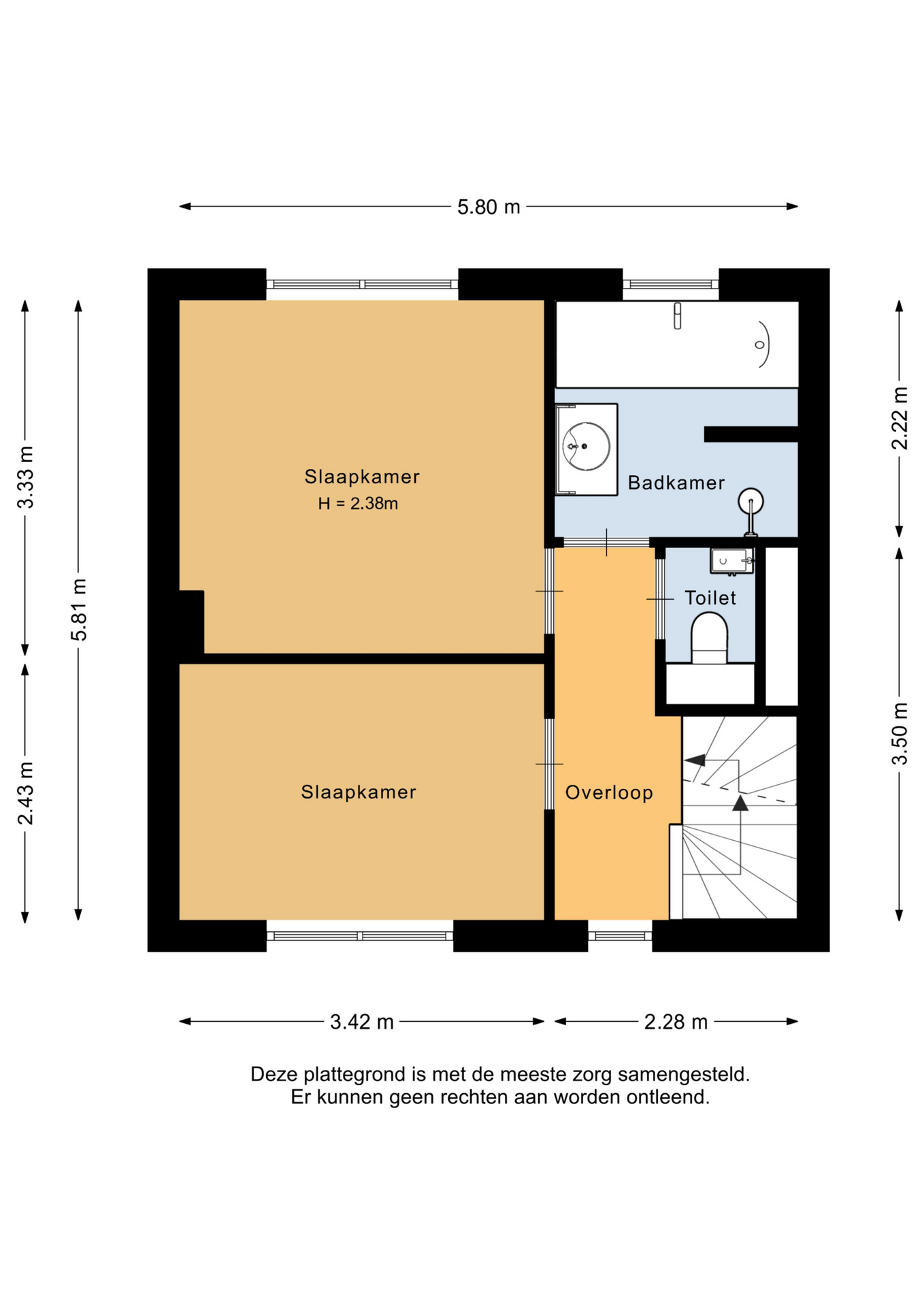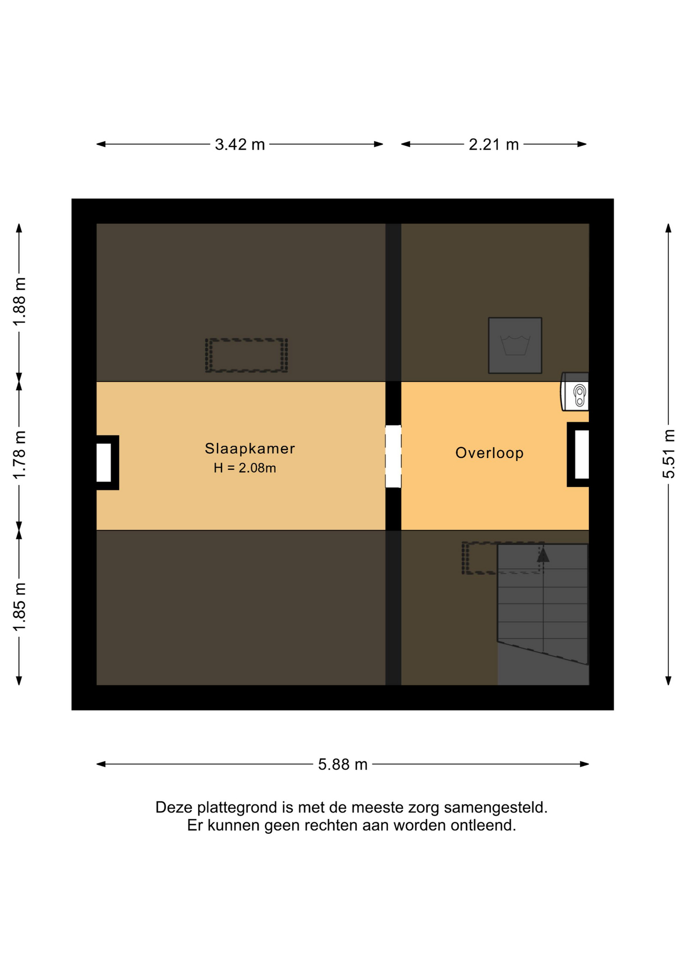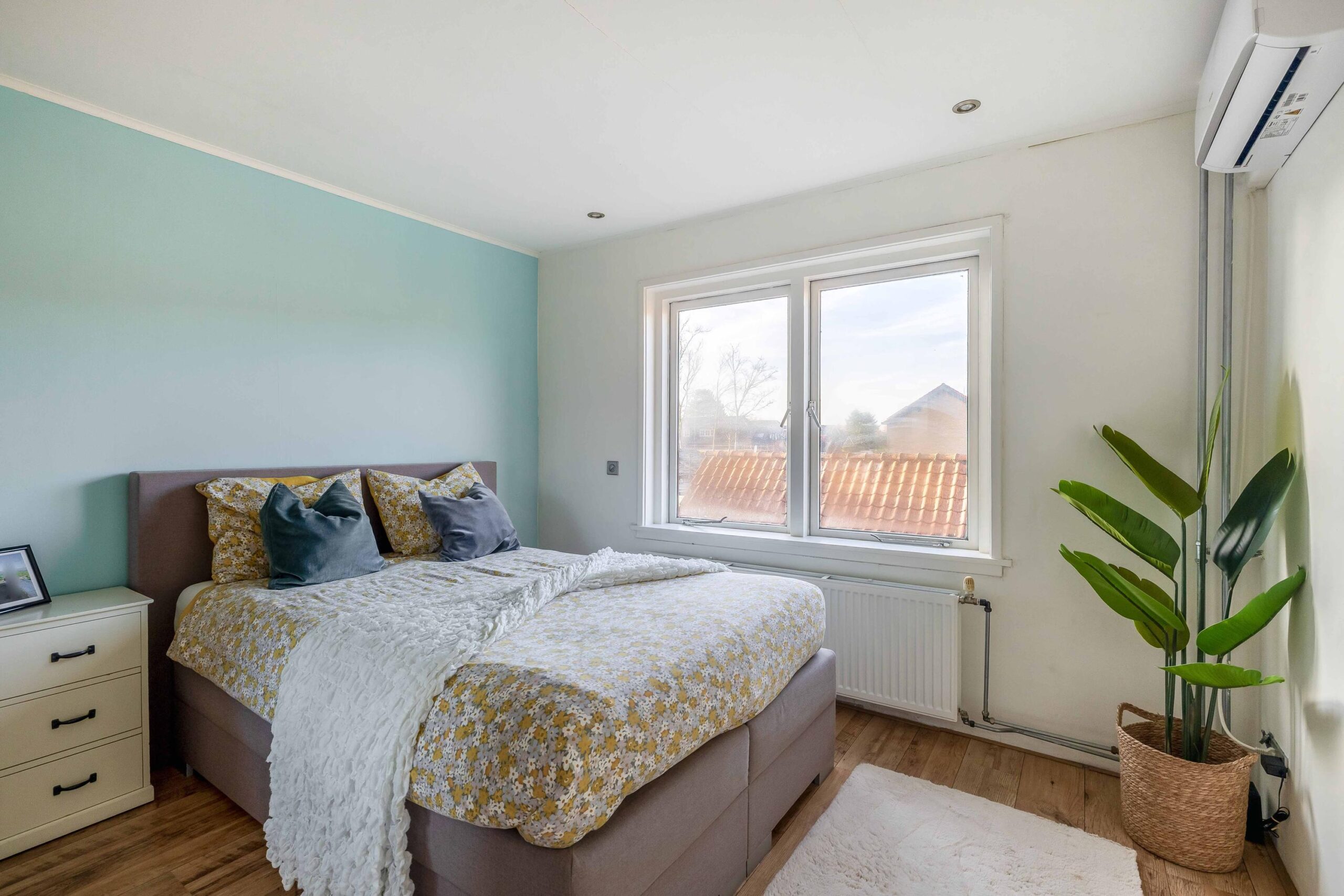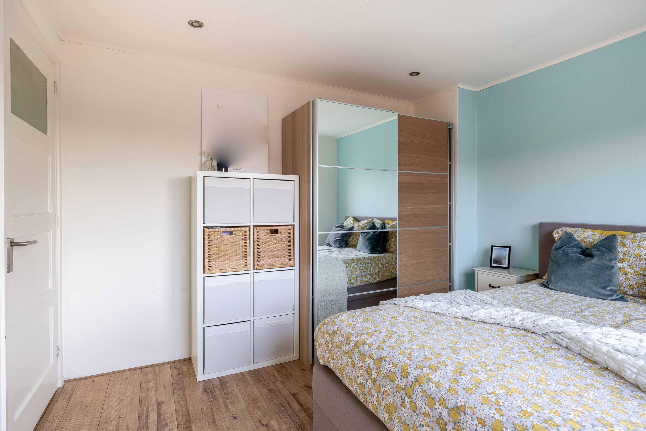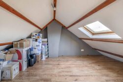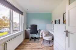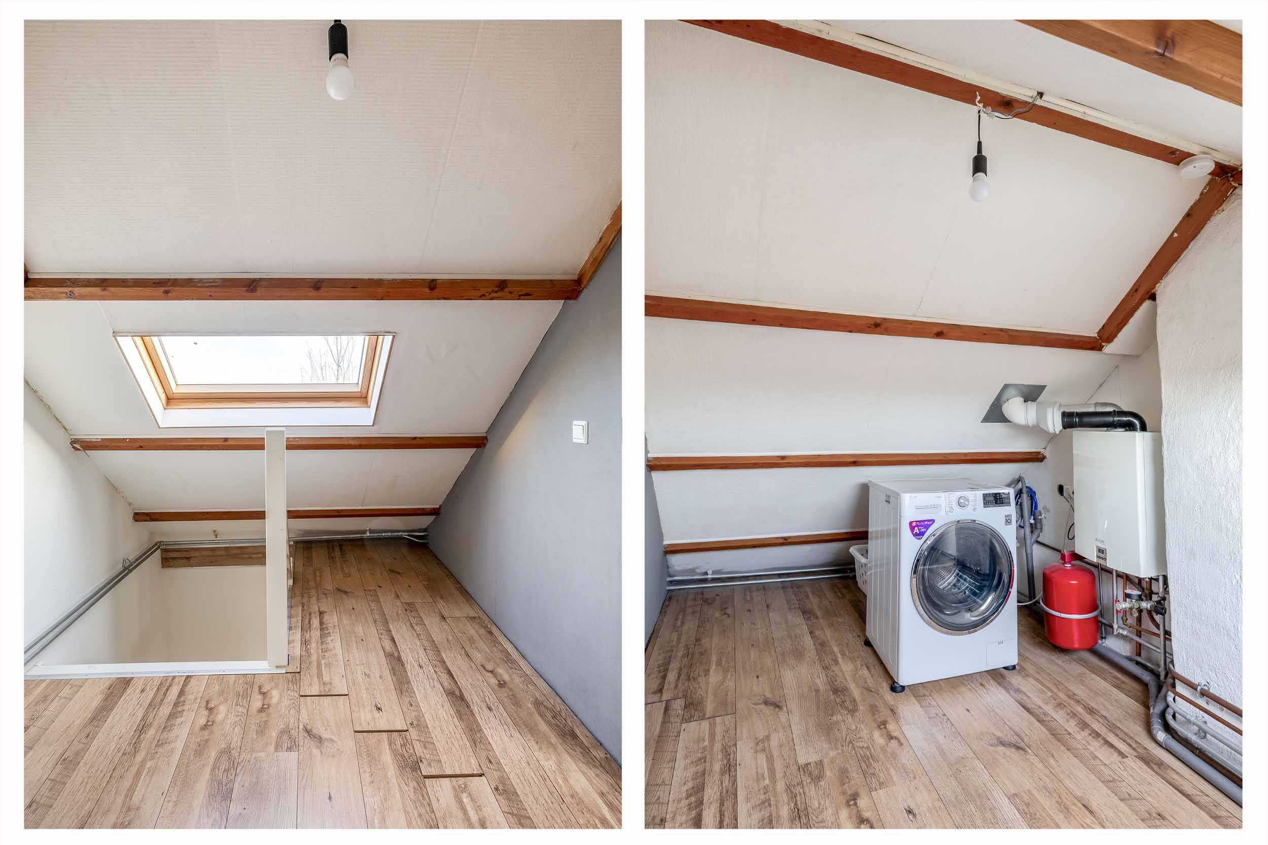 Via een vaste trap bereik je de tweede verdieping. De overloop biedt plaats aan de witgoedaansluitingen en de CV ketel. Daarnaast bevindt zich hier de derde slaapkamer, een prettige ruimte met Velux dakraam. Perfect als werkplek, hobbyruimte of logeerkamer.
