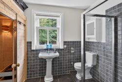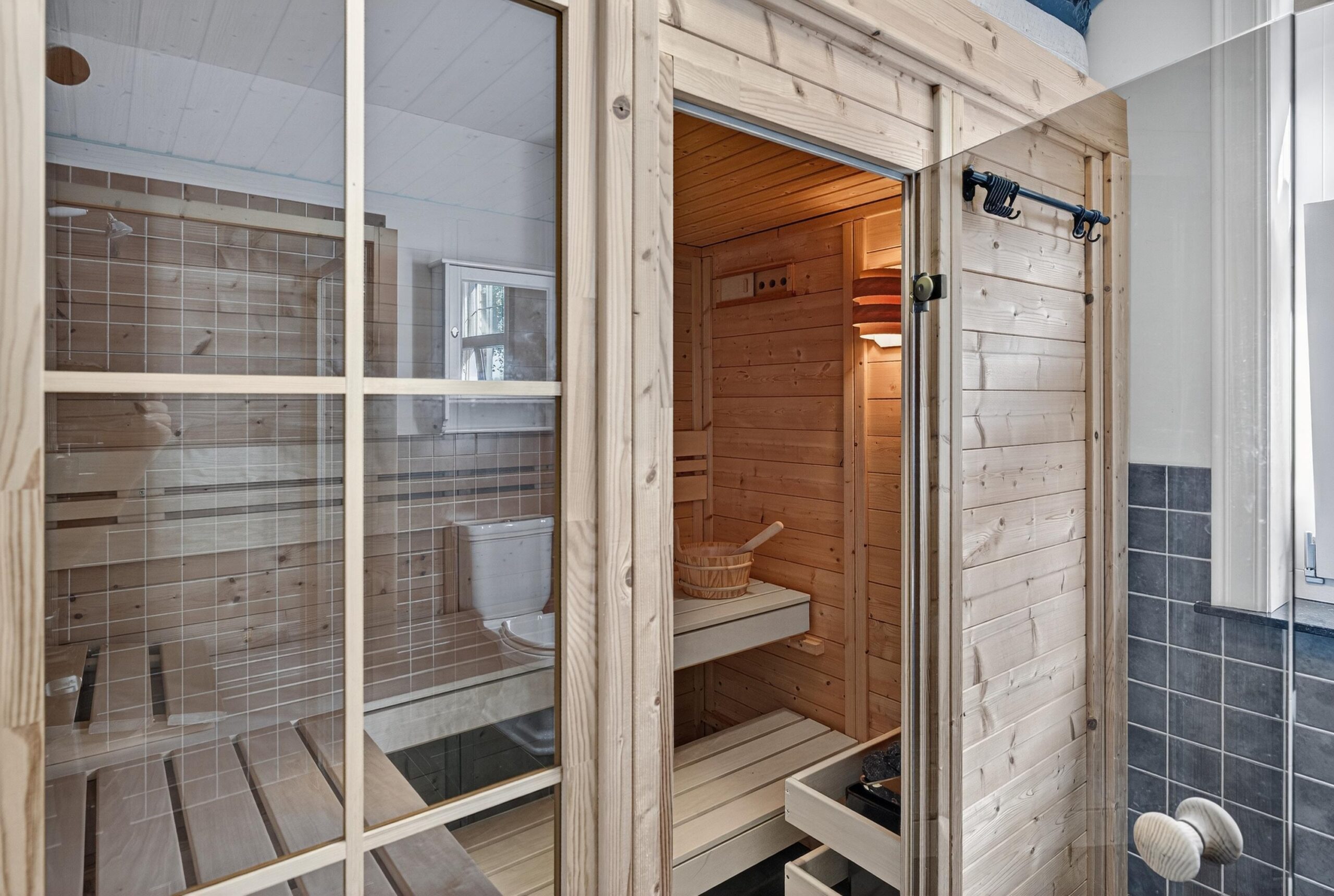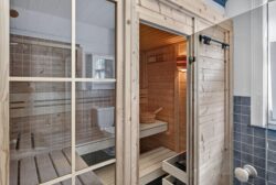 Het kantoor, met knusse haard en een zitje, biedt een rustige werkplek, grenzend aan de badkamer met sauna. Hier vindt u een eigen plek voor ontspanning en welzijn, waar u de drukte van alledag moeiteloos achter u laat.