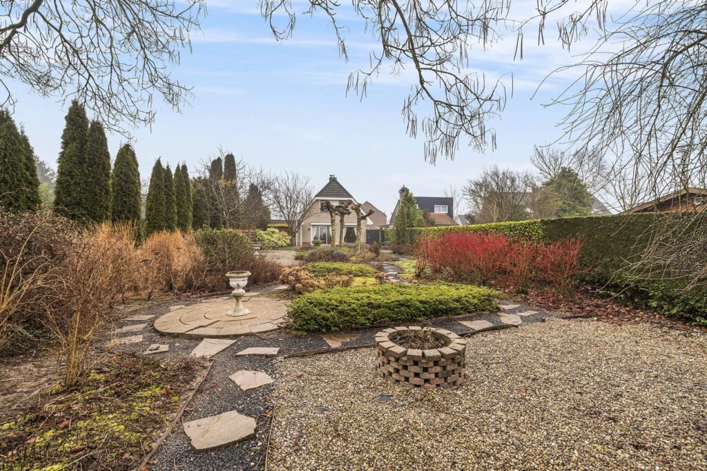 De heerlijk ruime achtertuin, op het noordwesten gelegen, is voorzien van diverse terrassen, een tuinhuis en heel veel borders met planten, struiken en bomen. De zeer ruime tuin is circa 100 meter diep. Echte tuinliefhebbers kunnen hier hun hart ophalen! Rechts van de woning heeft u via openslaande deuren toegang tot de fietsenstalling en berging. De oprit biedt voldoende parkeergelegenheid voor meerdere auto’s.
