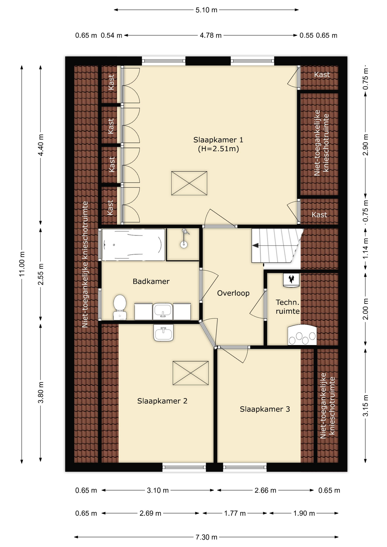 De overloop geeft toegang tot de drie slaapkamers, de badkamer en de technische ruimte. De ruime slaapkamers zijn voorzien vloerbedekking. De slaapkamer links voor heeft een wastafel. De slaapkamer aan de achterzijde is voorzien van een airco en veel vaste kasten. De badkamer is geheel betegeld en voorzien van een ligbad, een douche, een wastafel met badmeubel en een toilet.