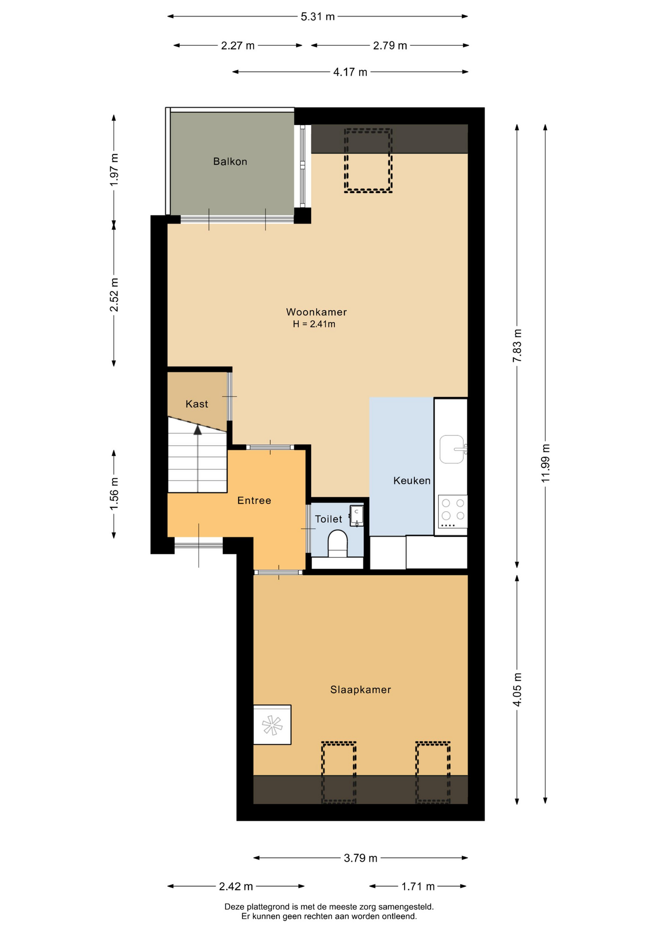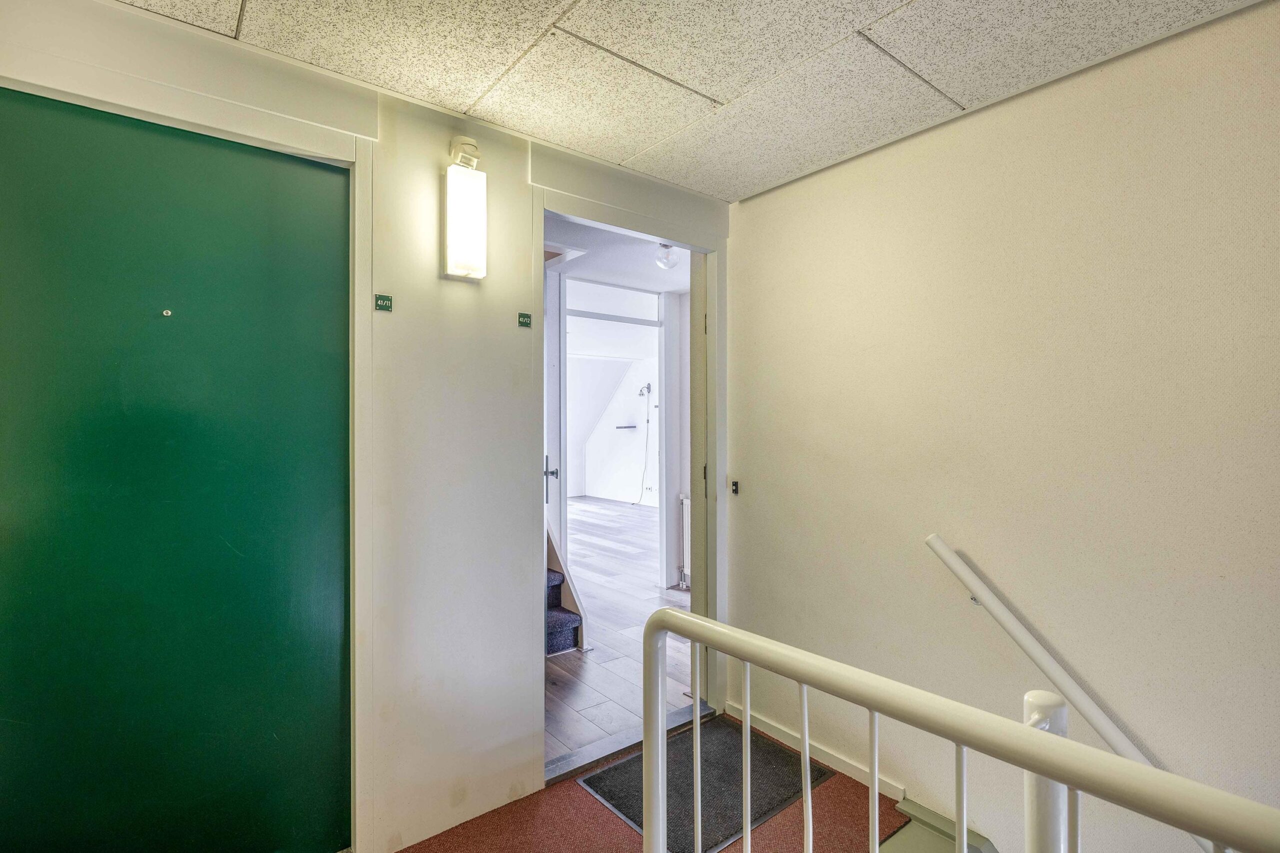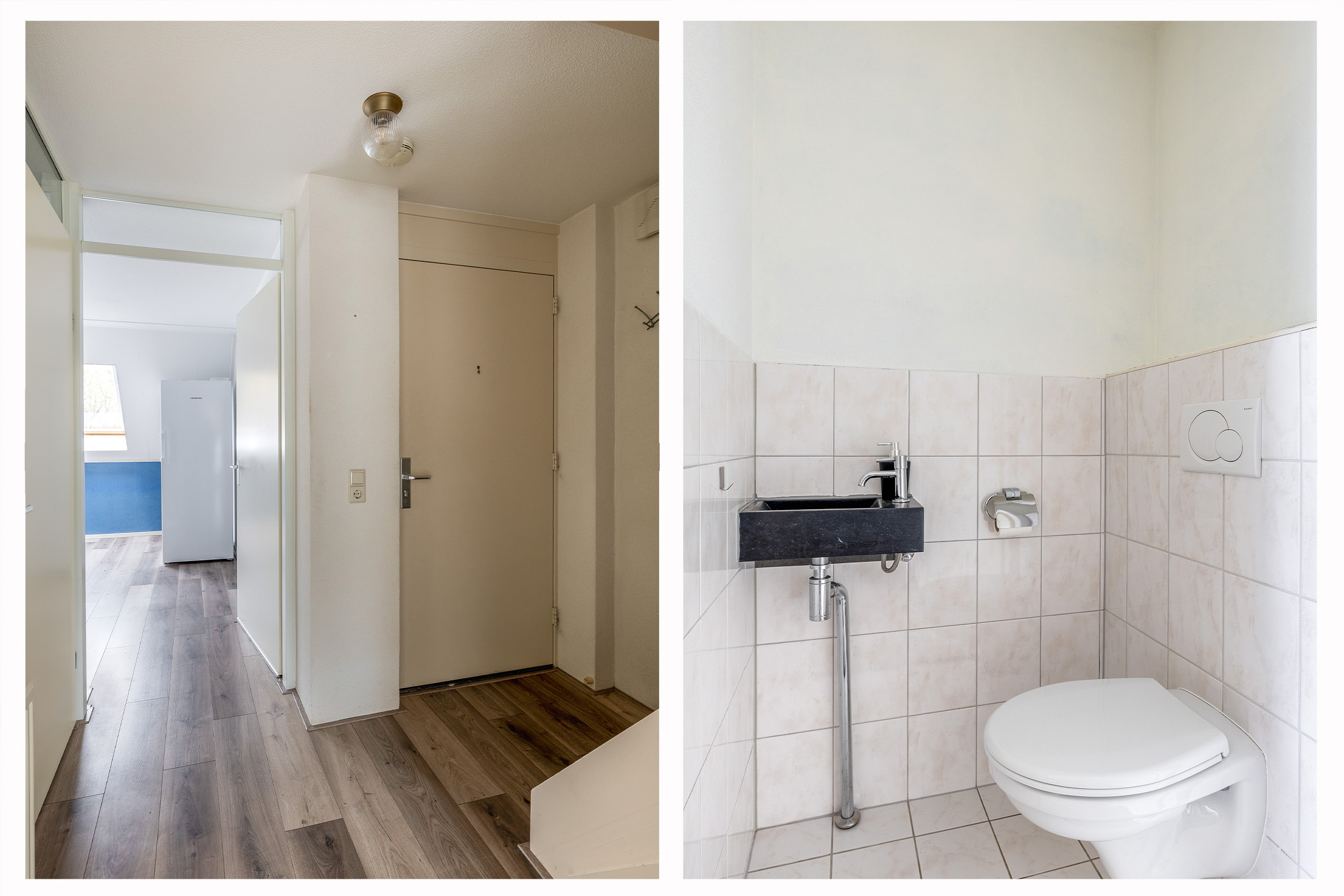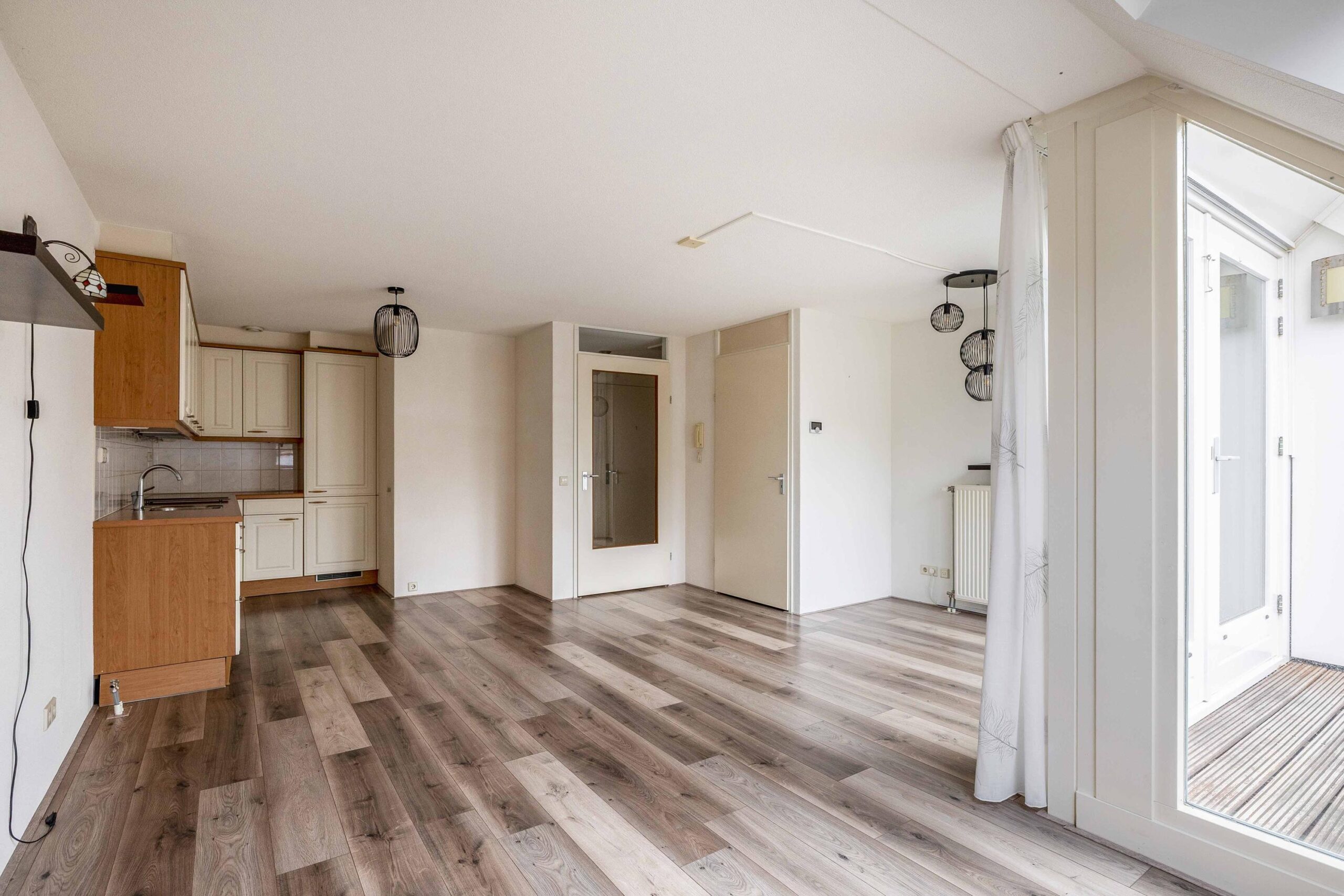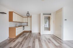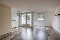 Via de trap in de gezamenlijke hal bereik je het appartement op de eerste verdieping. De entree met trapopgang leidt je naar de woon-/eetkamer, open keuken, een slaapkamer en het toilet. De woon-/eetkamer aan de achterzijde is voorzien van een nette laminaatvloer, praktische trapkast en een dakraam. Dankzij de openslaande deuren naar het balkon en de grote raampartijen geniet je hier van een fijne hoeveelheid daglicht.