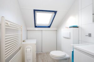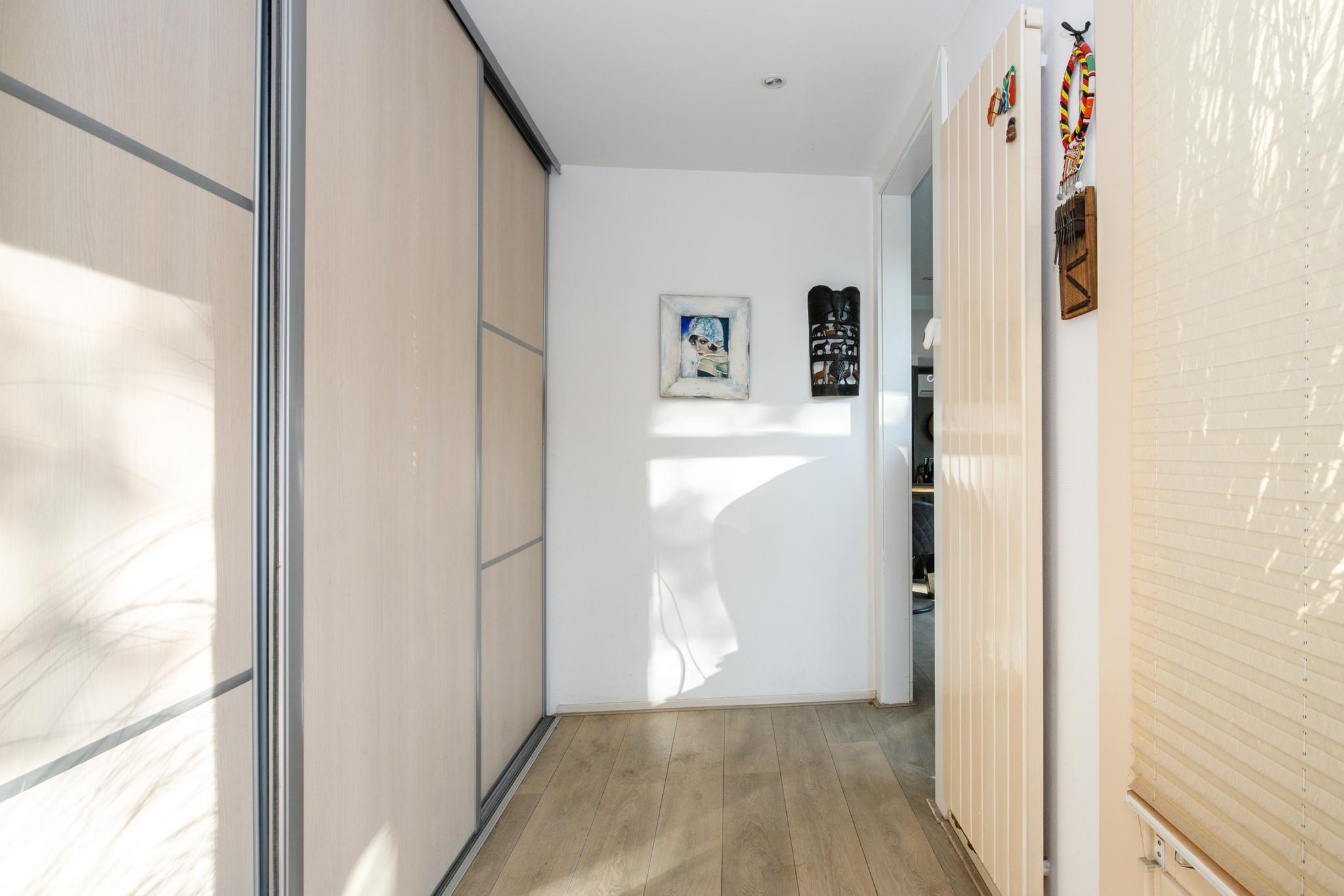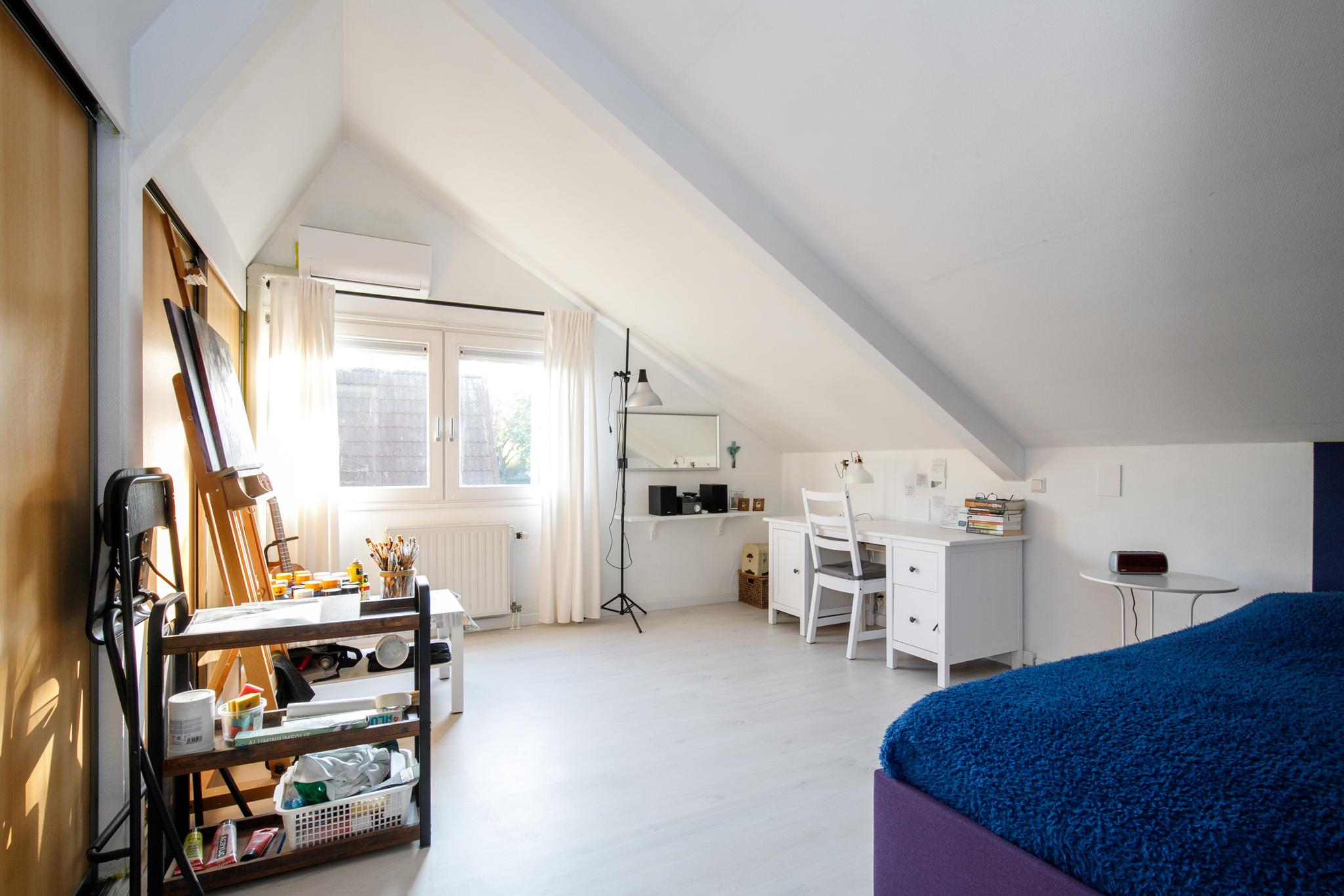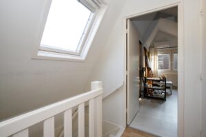 Vanuit de woonkamer loopt u via de vaste trap naar de overloop op de eerste verdieping. Vanaf de overloop heeft u toegang tot twee slaapkamers en een ruim toilet met wastafel en designradiator, de overloop beschikt net als het toilet over een dakraam. De grote slaapkamer is ruim en voorzien van een mooie laminaatvloer en airco.