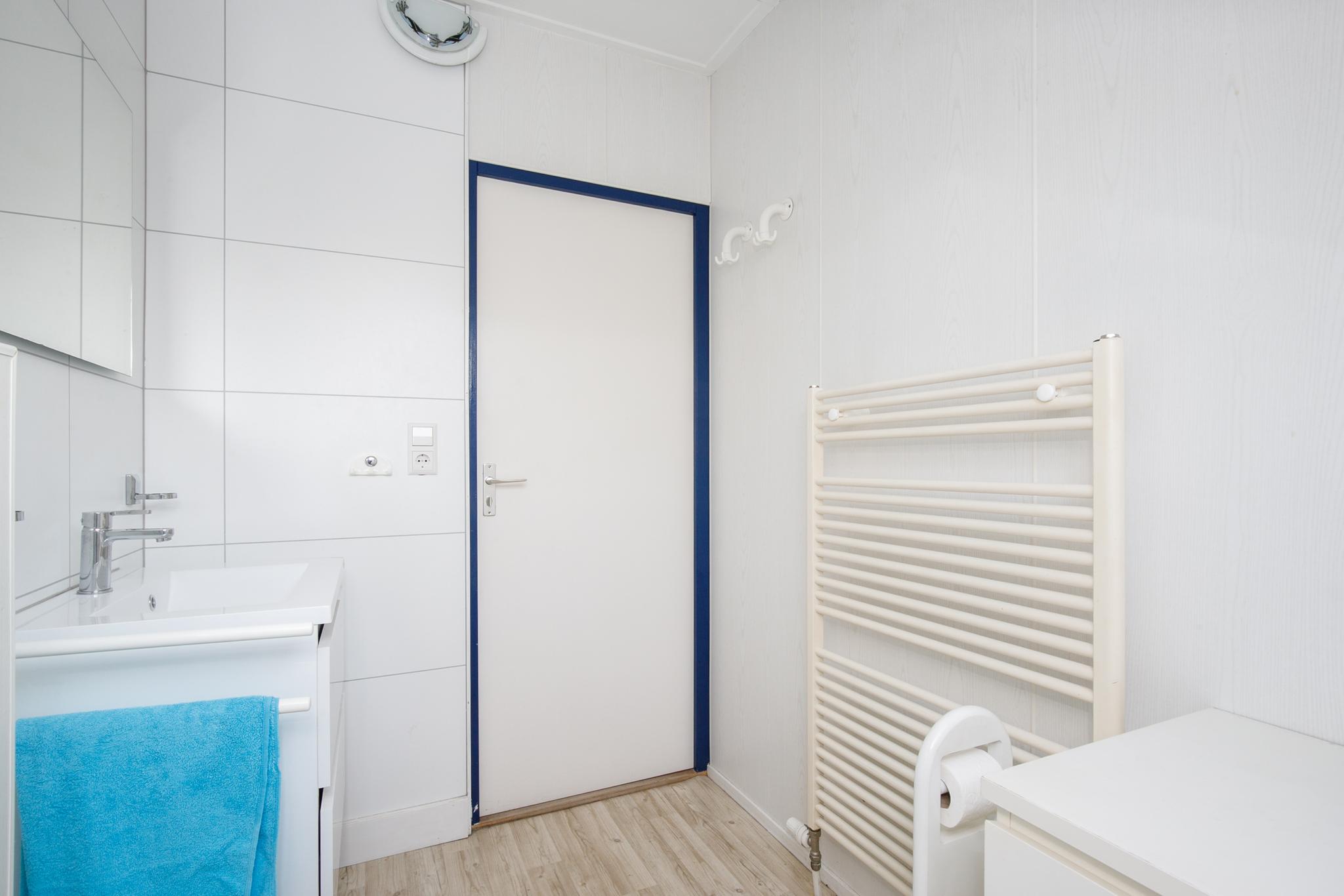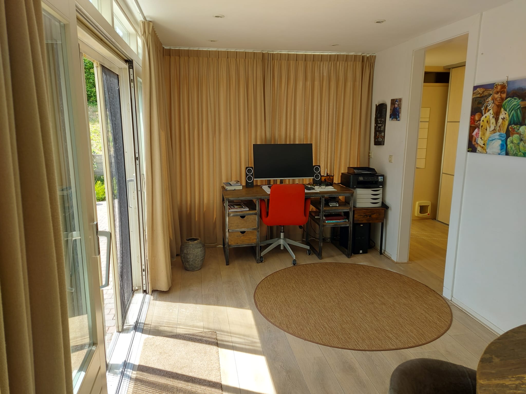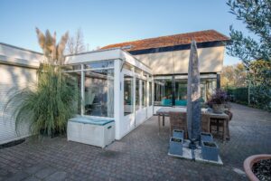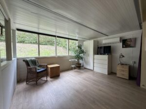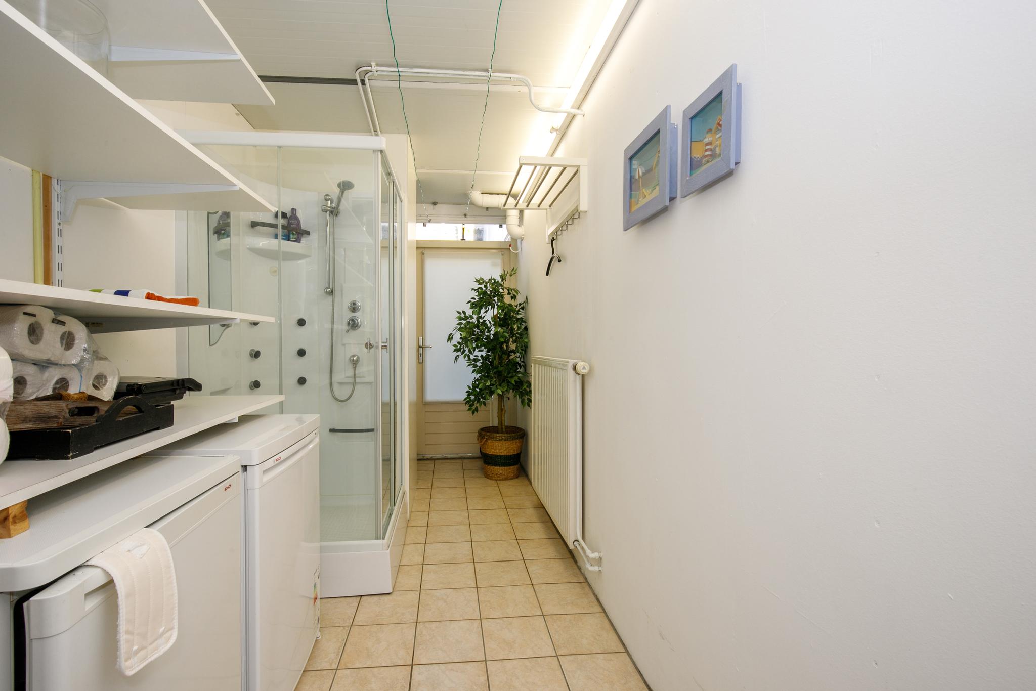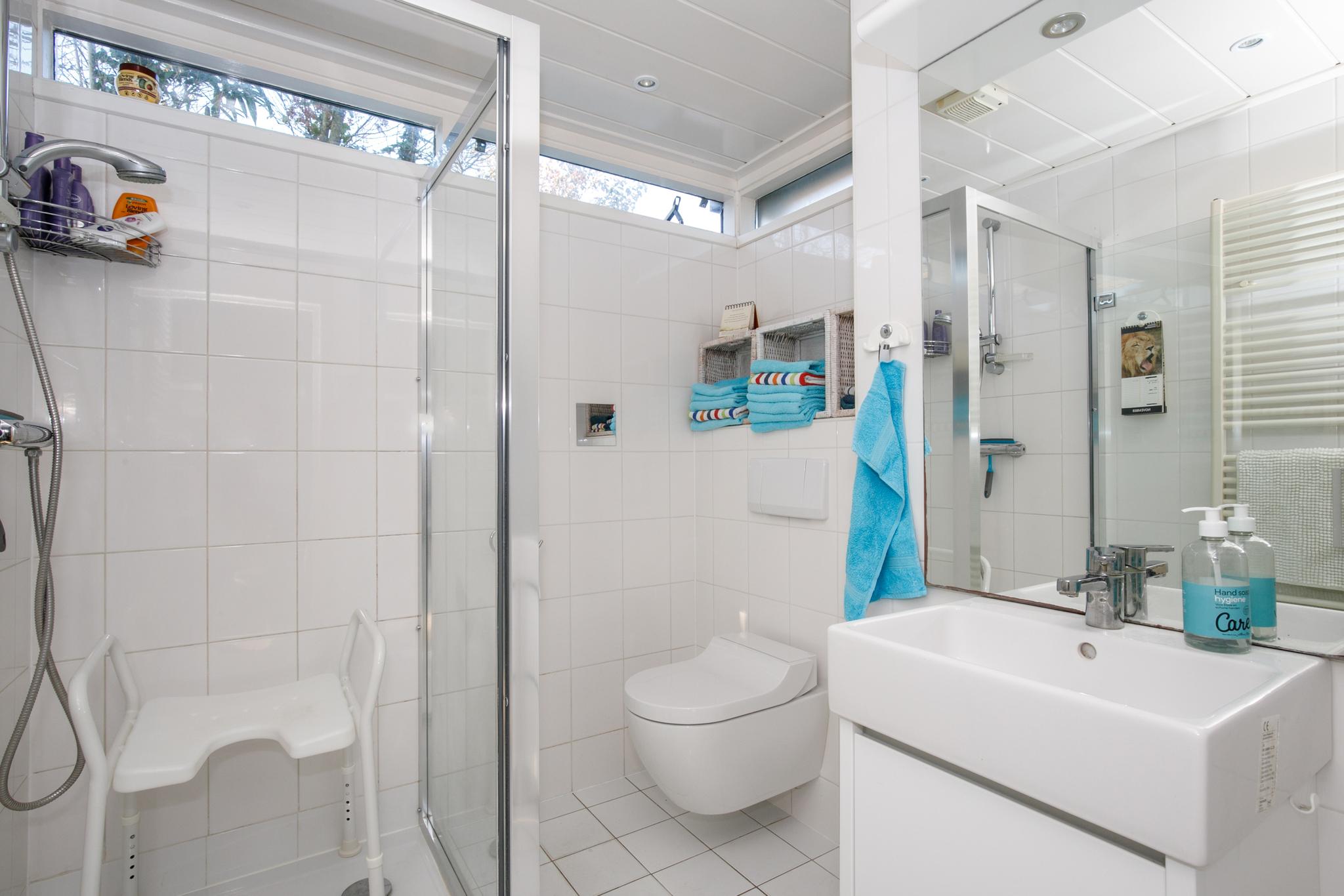 Via de schuifpui betreedt u de eetkamer/werkplek in de woning. De eetkamer/werkplek biedt voldoende ruimte voor een ruim kantoor waar met twee personen gewerkt kan worden. De open keuken, in hoekopstelling, is voorzien van veel opbergruimte, diverse inbouwapparatuur: kookplaat, afzuigkap, oven, koel-vriescombinatie, vaatwasser en was/droogmachine. In de keuken is voldoende ruimte voor een eettafel. Vanuit de keuken loopt u zo de ruime woonkamer in die is voorzien van een laminaatvloer, airco en openslaande deuren naar de tuin. De ramen zorgen voor veel lichtinval. Via de woonkamer kunt u gebruik maken van één van de twee badkamers. De badkamer beschikt over een wastafel, douche en toilet. Vanuit de bijkeuken is ook de ruim opgezette slaapkamer bereikbaar, de slaapkamer is voorzien met een deur naar de tuin. Naast de slaapkamer bevindt zich de aangepaste badkamer. De betegelde badkamer is voorzien van een douche en toilet. In deze ruimte is het mogelijk om een koel-vriescombinatie te plaatsen, ook kunt u hier de deur naar buiten vinden.