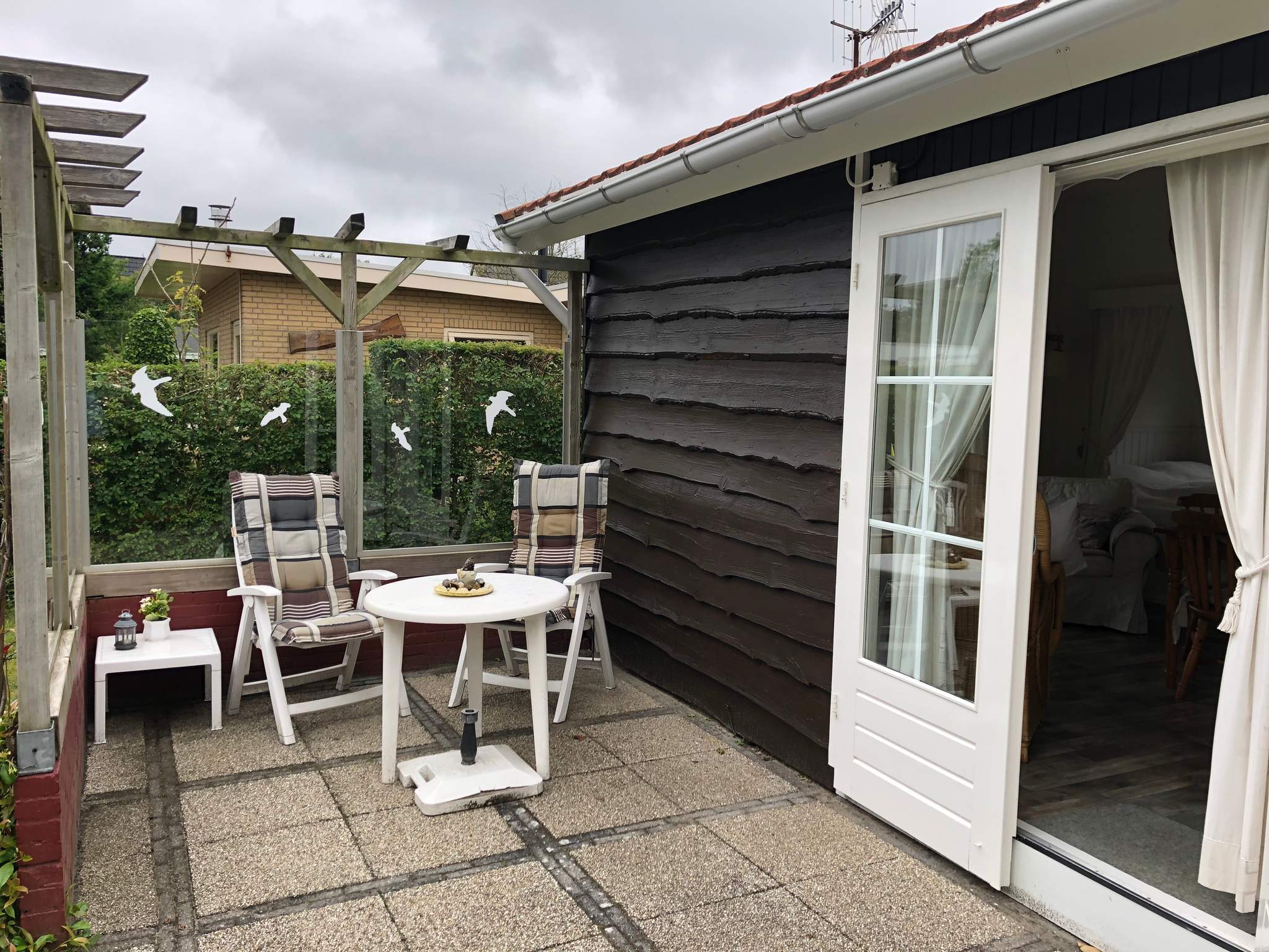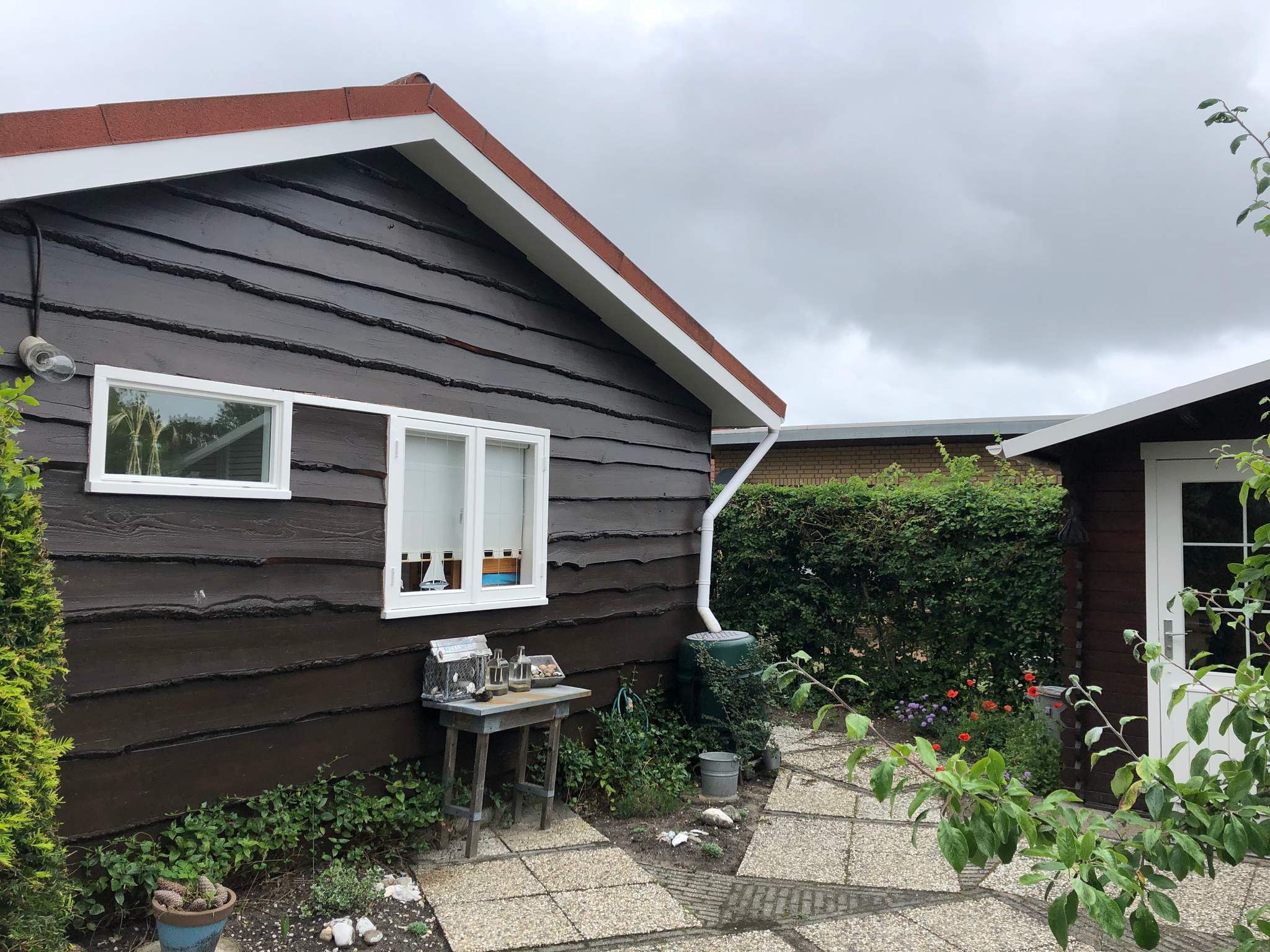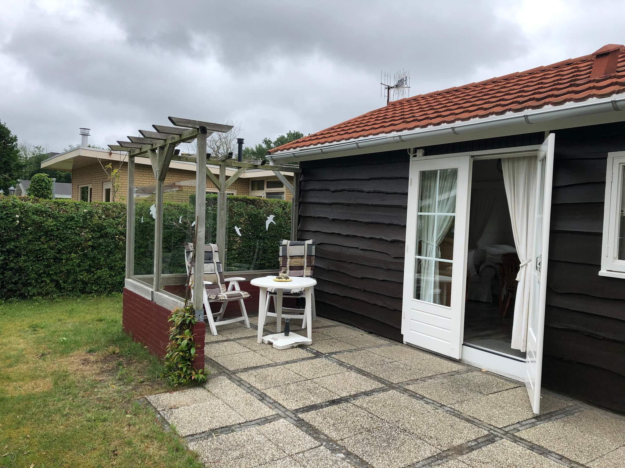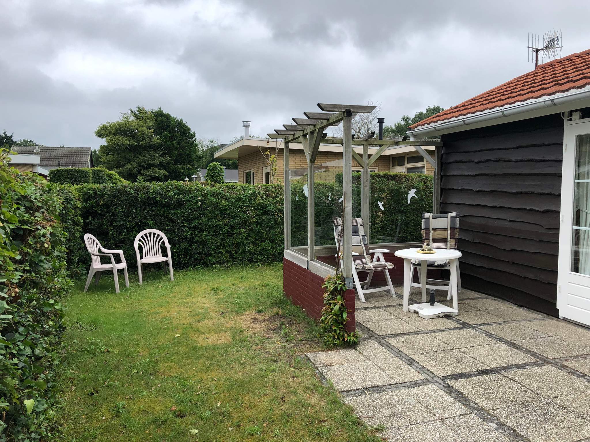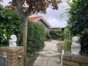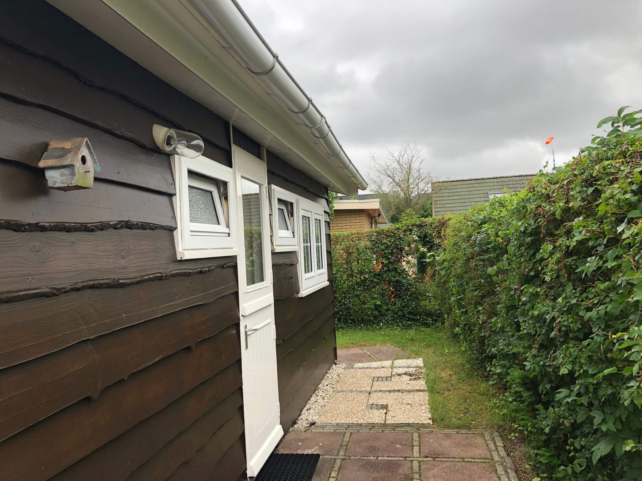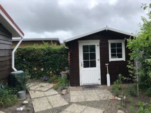 In de tuin staat een houten berging. Aan het begin van het park is de parkeerplaats.