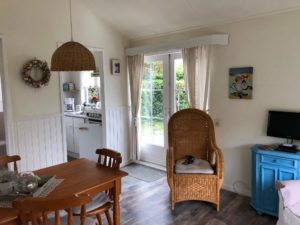 – Woon/eetkamer met laminaat, lambrisering en openslaande deuren naar de tuin
