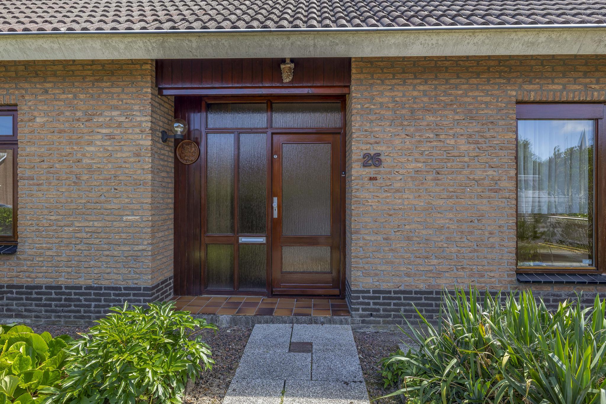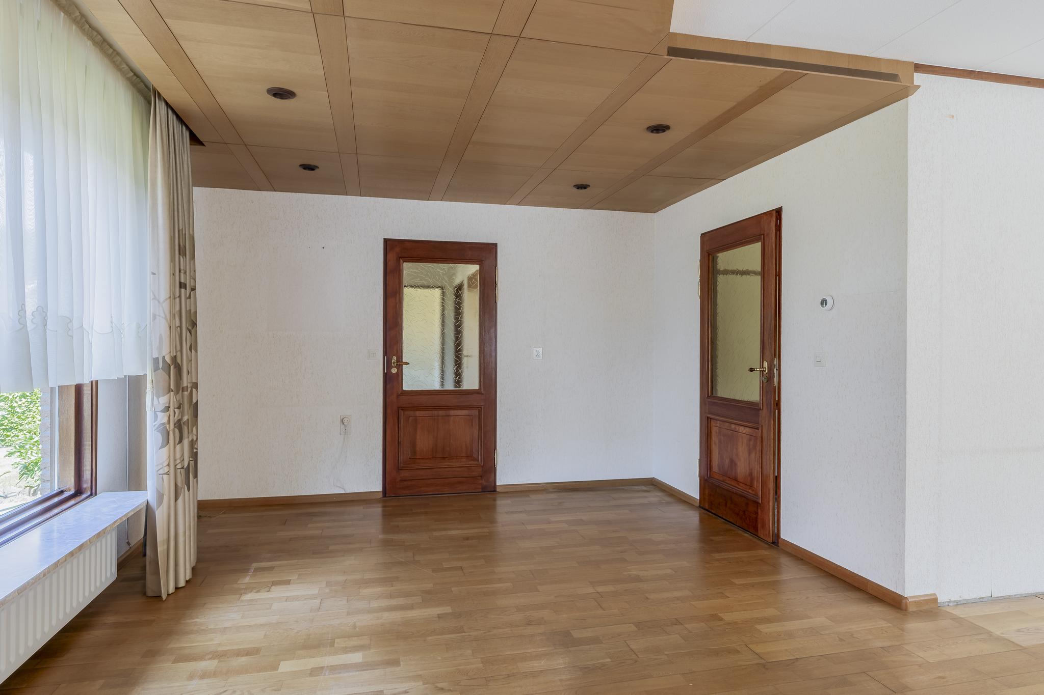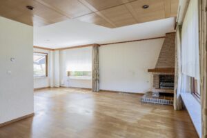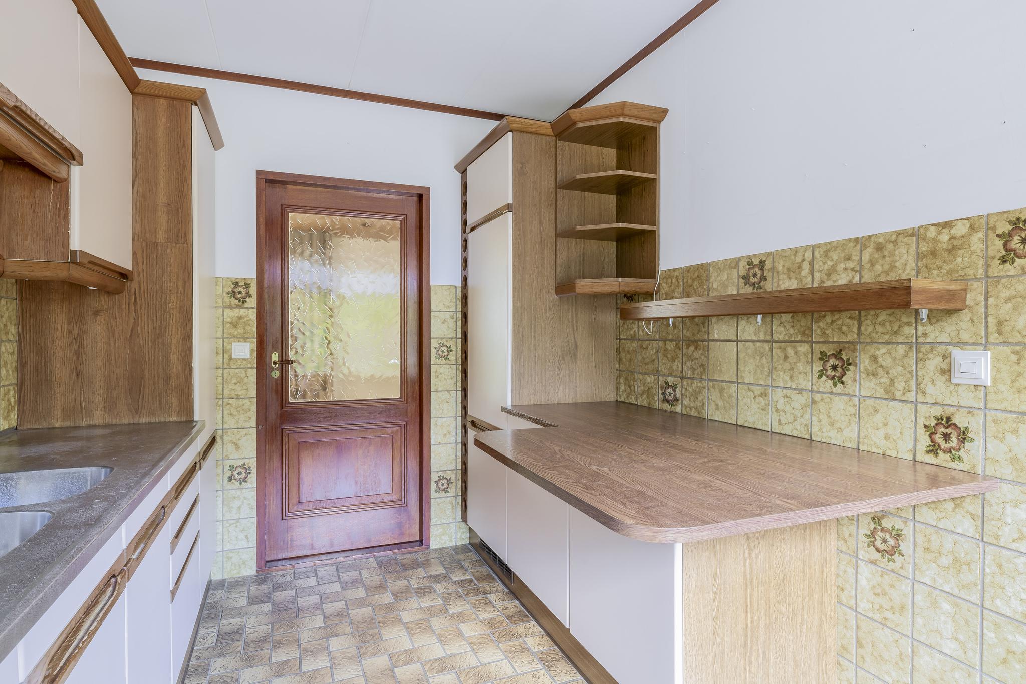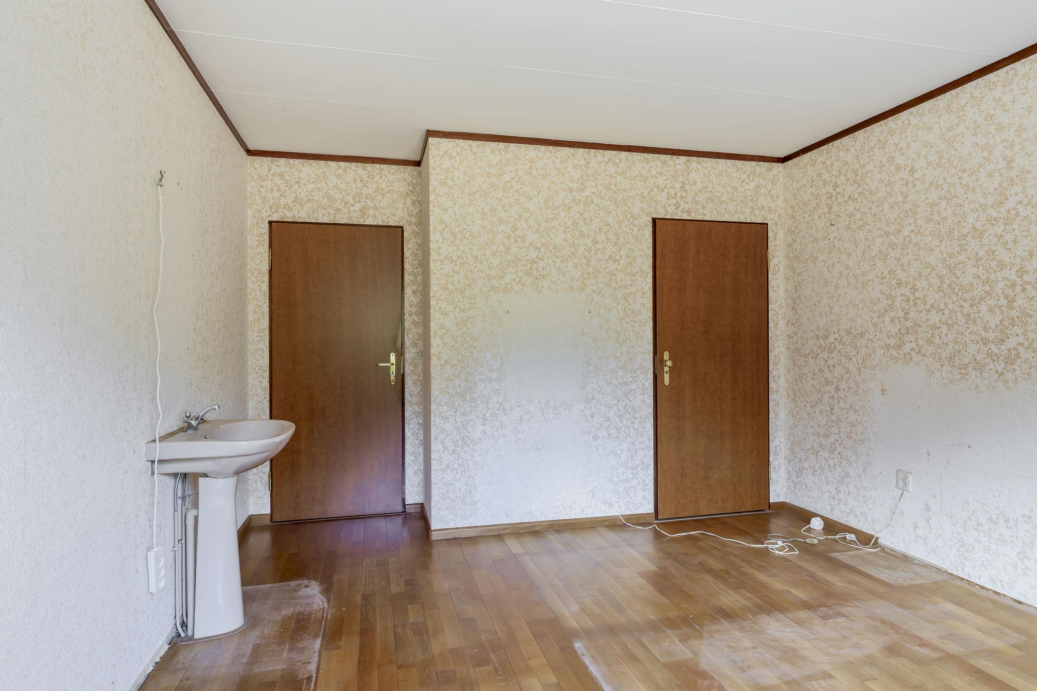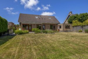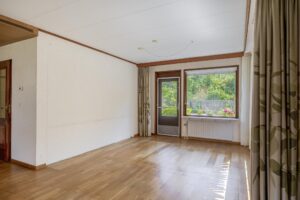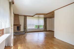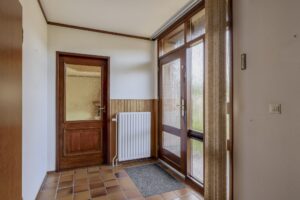 De entreehal, met meterkast, geeft toegang tot de woon-/eetkamer, de badkamer en twee slaapkamers. De woon-/eetkamer is voorzien van een houten vloer en een open haard. De grote raampartijen zorgen voor veel natuurlijke