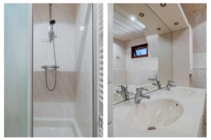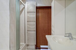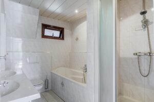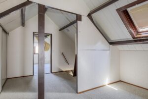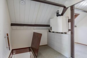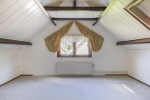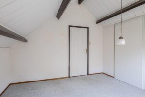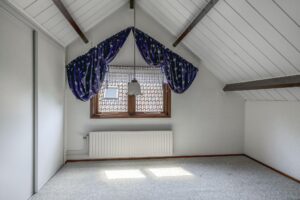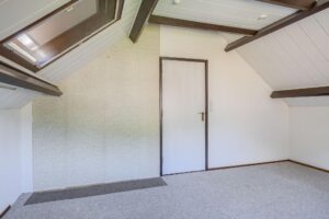 De royale overloop, met dakraam, vaste kast en CV-ketel, geeft toegang tot de overige twee slaapkamers. Op de slaapkamer aan de linkerzijde zorgt een dakraam voor extra lichtinval. De slaapkamer aan de rechterzijde is voorzien van een vaste kast onder het schuine dak.