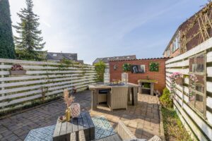 De achtertuin, gelegen op het noordwesten, is voorzien van bestrating en daardoor onderhoudsarm. Het is hier heerlijk vertoeven. Achter in de tuin staat de stenen berging. Naast de berging is de poort waardoor de tuin achterom bereikbaar is.