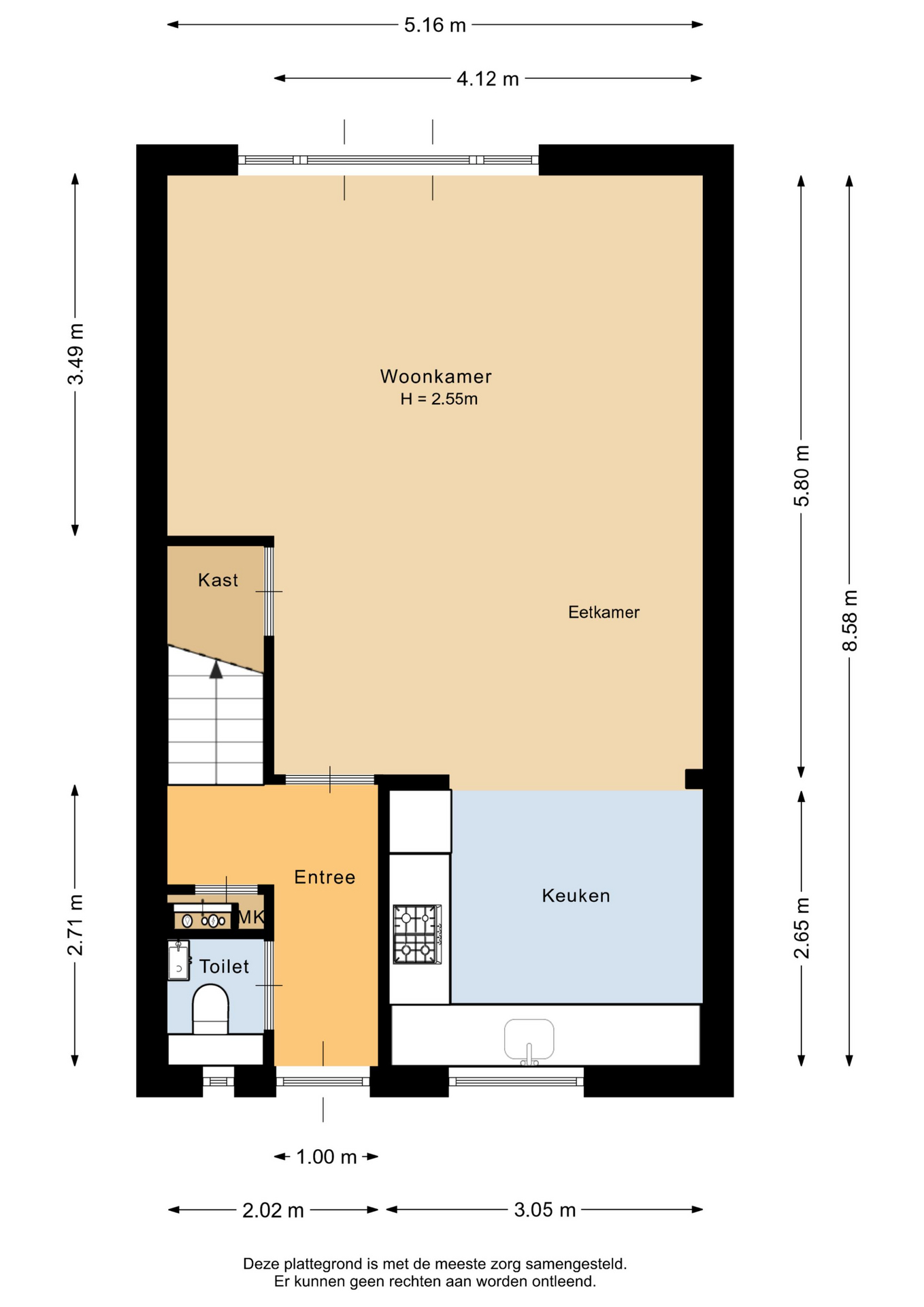 De entreehal, met meterkast, toilet en trapopgang, geeft toegang tot de woon-/eetkamer en de keuken. De gezellige woonkamer, gelegen aan de achterzijde van de woning, is voorzien van een laminaatvloer met vloerverwarming. De openslaande deuren naar de tuin zorgen voor veel natuurlijkje lichtinval. In het verlengde van de woonkamer is de eetkamer, met vaste kast, gesitueerd. Vanuit de eetkamer is de open keuken bereikbaar. De hoekkeuken is voorzien van veel opbergruimte en diverse apparatuur: kookplaat, afzuigkap en combi-oven. De gehele begane grond is voorzien van een laminaatvloer met vloerverwarming.