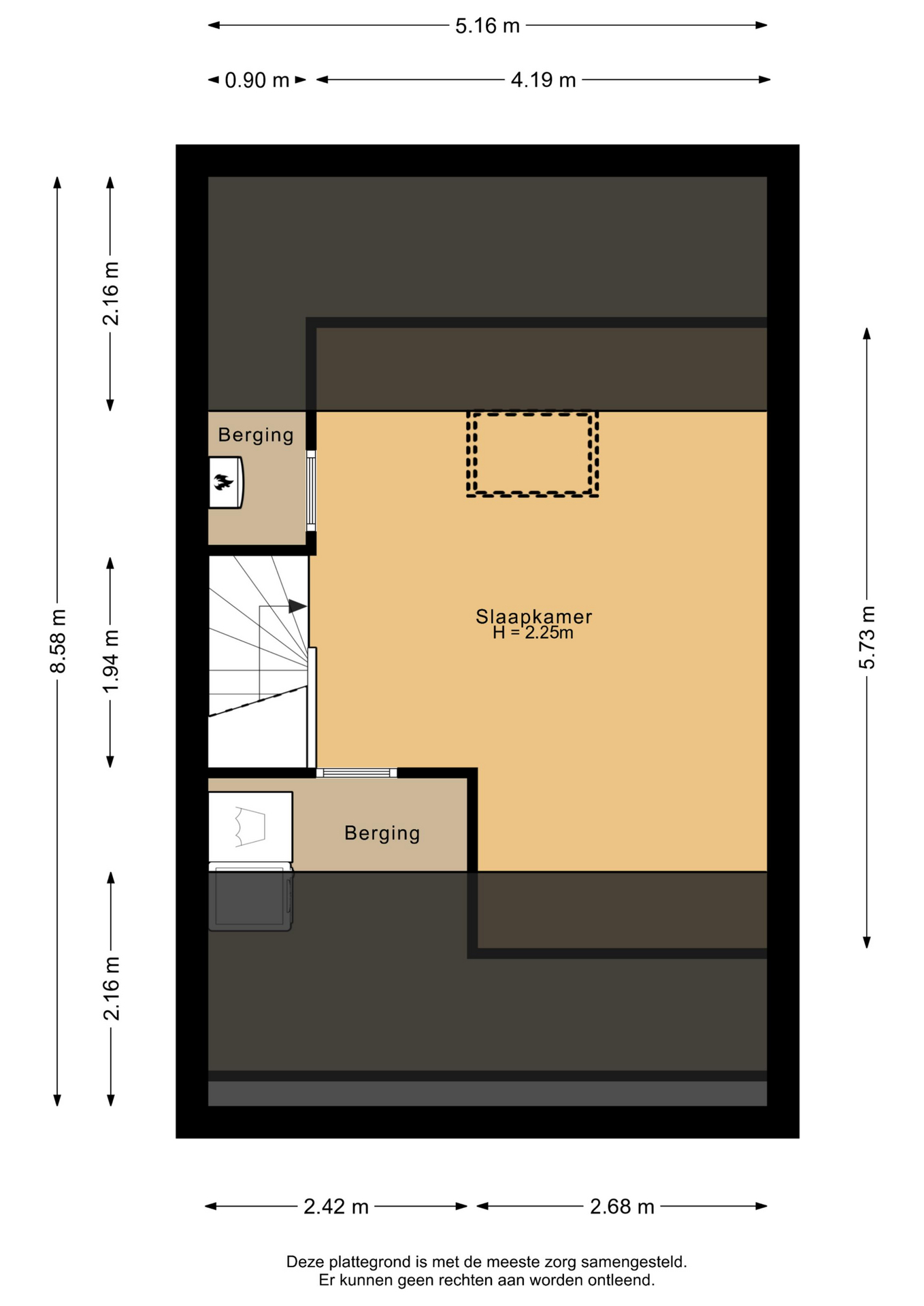 De tweede verdieping is ook bereikbaar middels een vaste trap. De verdieping bestaat uit een royale slaapkamer en twee bergingen. De slaapkamer is voorzien van een marmoleum vloer en een dakraam. In de ene berging vind je de witgoedaansluitingen, in de tweede berging hangt de CV-ketel.
