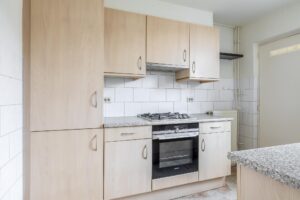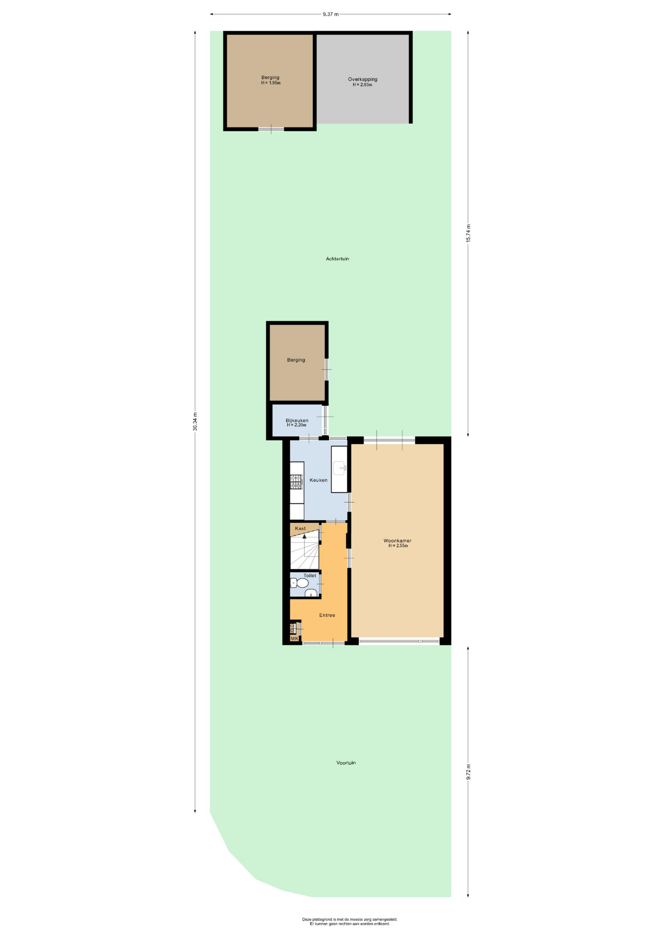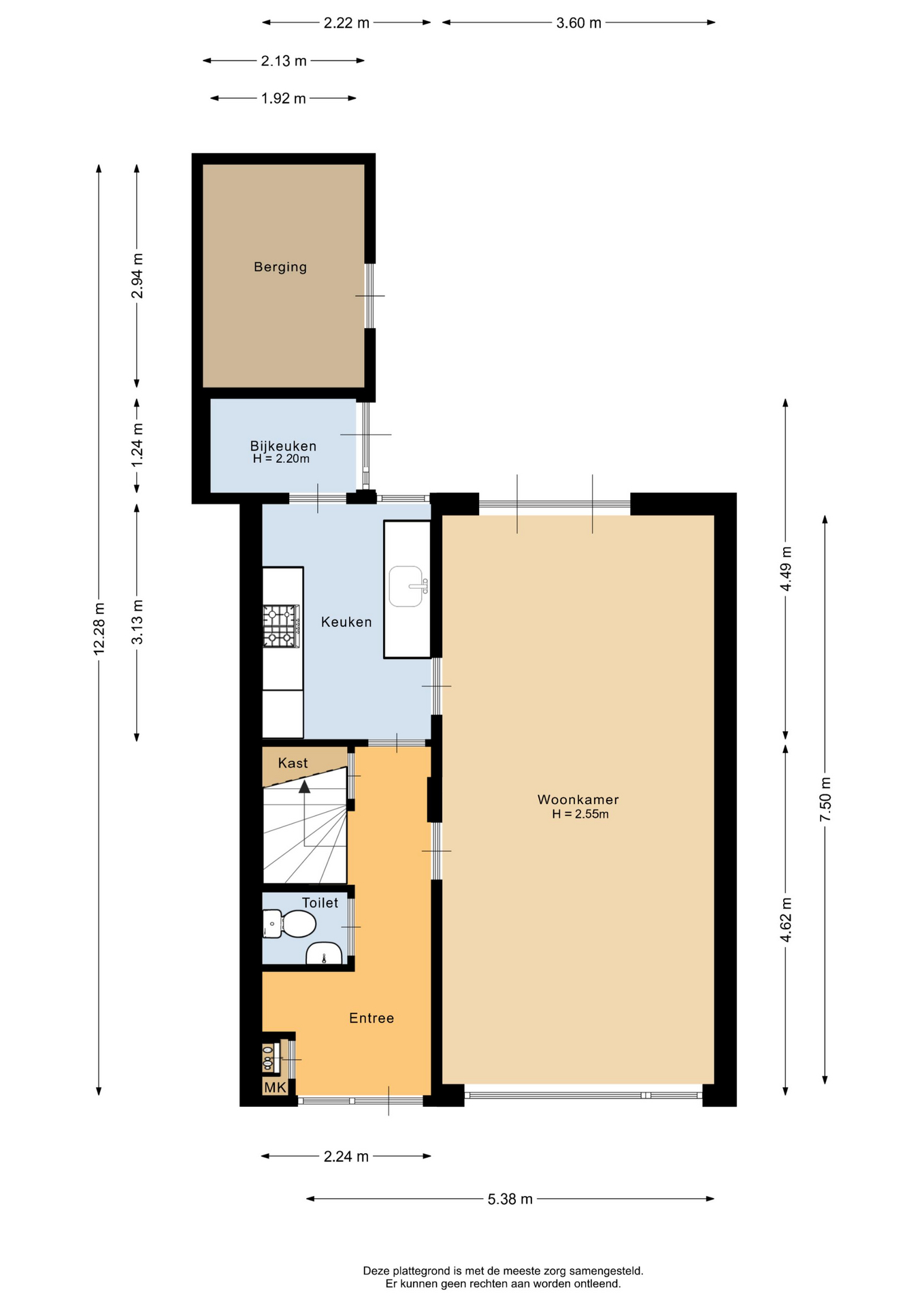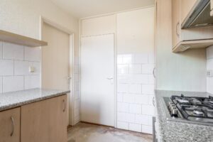 De entreehal, met meterkast, toilet en trapopgang, geeft toegang tot de woon-/eetkamer en de keuken. De woon-/eetkamer is geheel naar smaak in te richten. Het grote raam aan de voorzijde en de openslaande deuren aan de achterzijde zorgen voor veel lichtinval. De keuken, bereikbaar vanuit de entreehal en de woon-/eetkamer, is voorzien van opbergruimte en diverse apparatuur: kookplaat, afzuigkap, oven, koel-/vriescombinatie en vaatwasser. Vanuit de keuken heb je toegang tot de achtergelegen bijkeuken, met witgoedaansluitingen en deur naar de tuin.