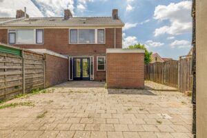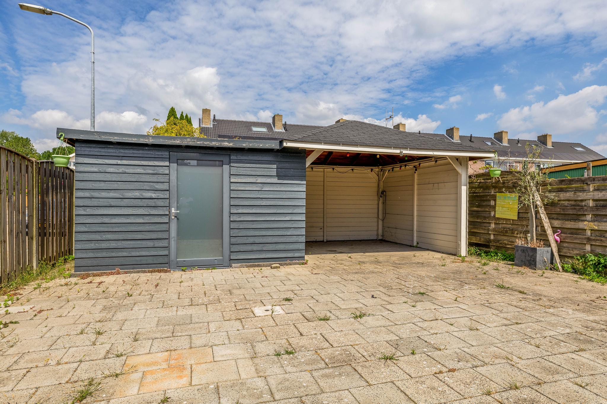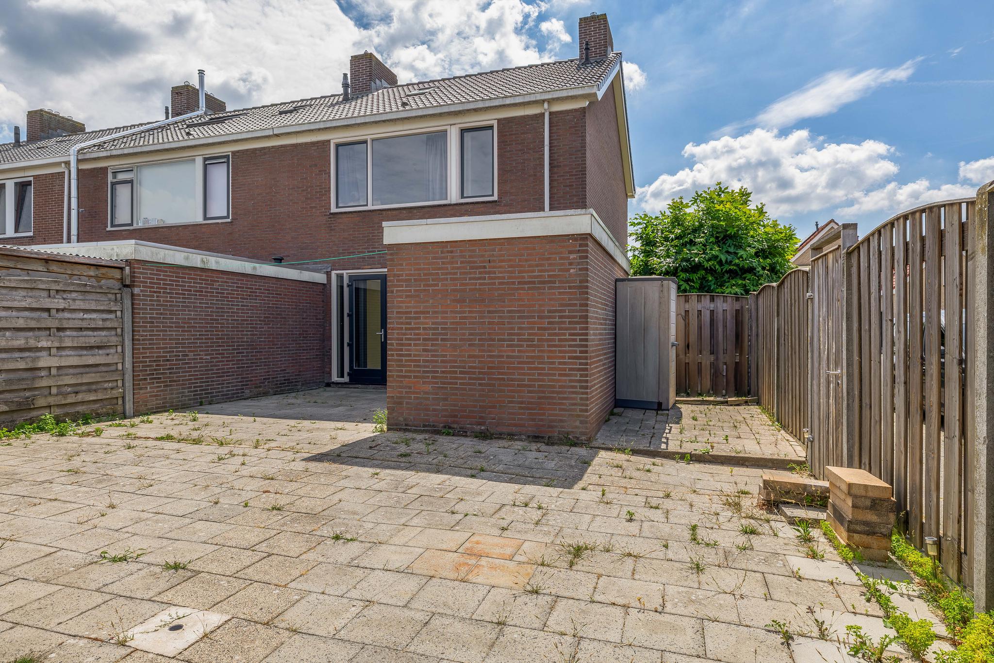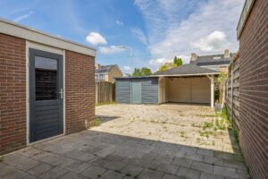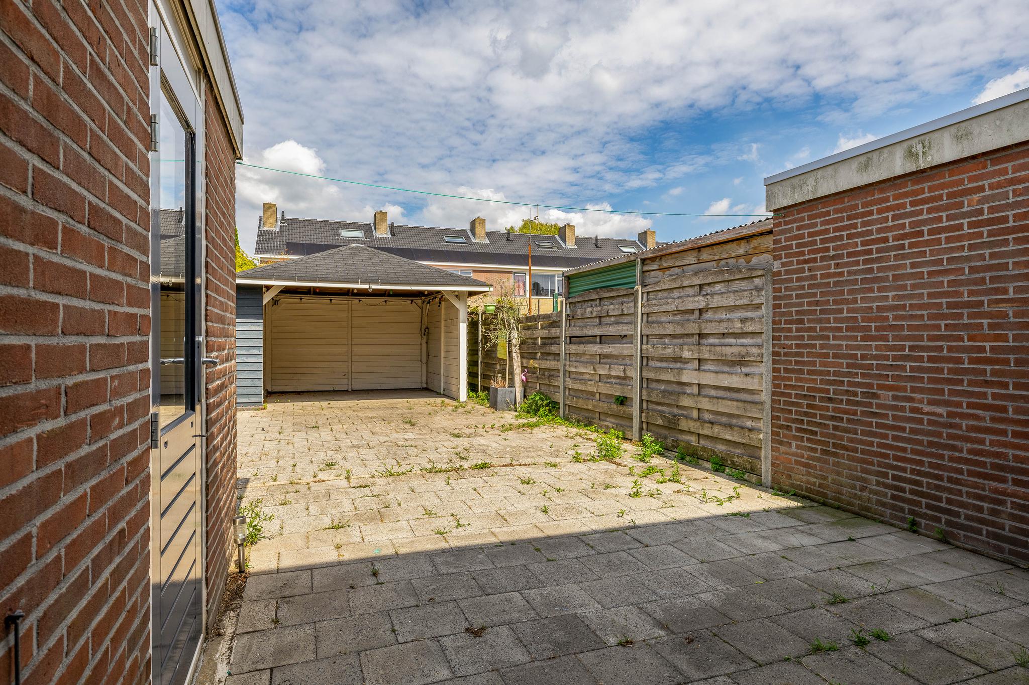 De achtertuin, gelegen op het noordoosten, is geheel betegeld. Grenzend aan de woning is een stenen berging gesitueerd. Achter in de tuin staat een houten berging met rechts daarvan een overkapping. Het is hier heerlijk vertoeven. Naast de woning is een poort waardoor de tuin achterom bereikbaar is.