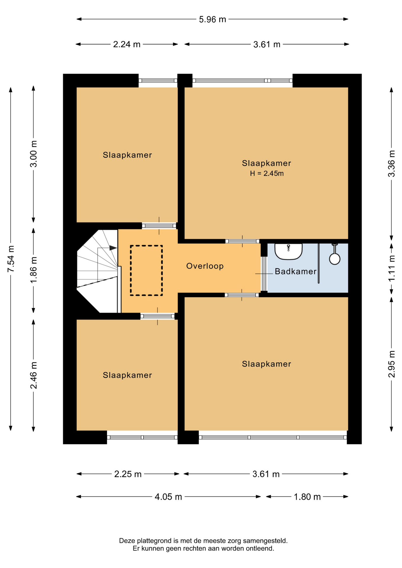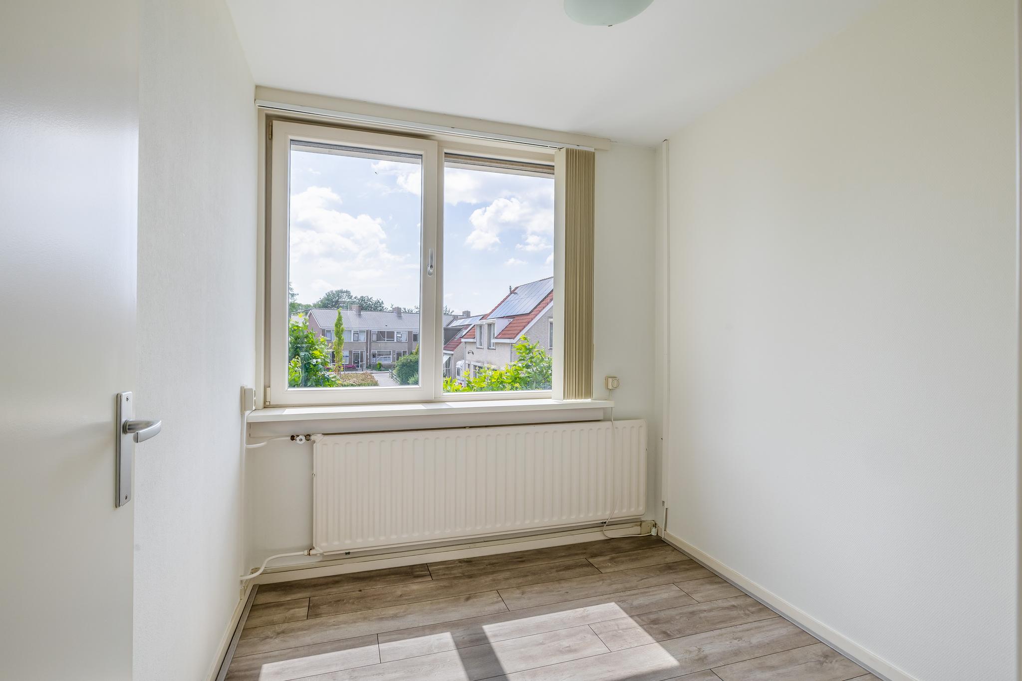 De overloop geeft toegang tot de vier slaapkamers en de badkamer. De slaapkamers zijn voorzien van een laminaatvloer. De ramen zorgen voor veel lichtinval. De badkamer is geheel betegeld en voorzien van een douche en wastafel.