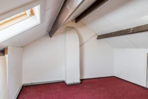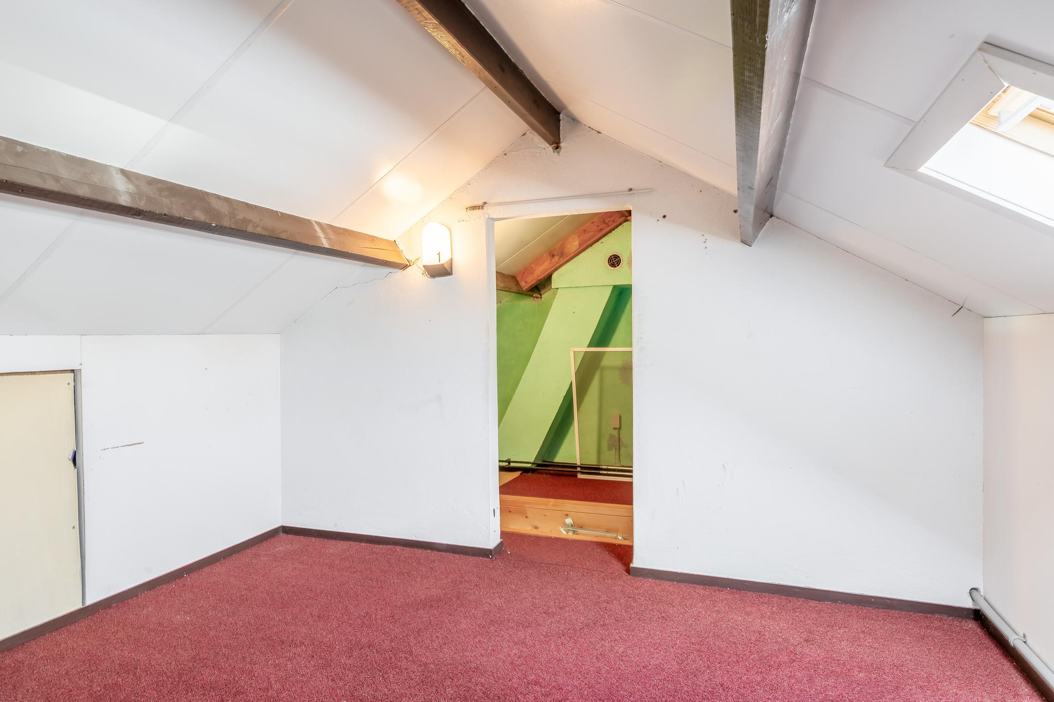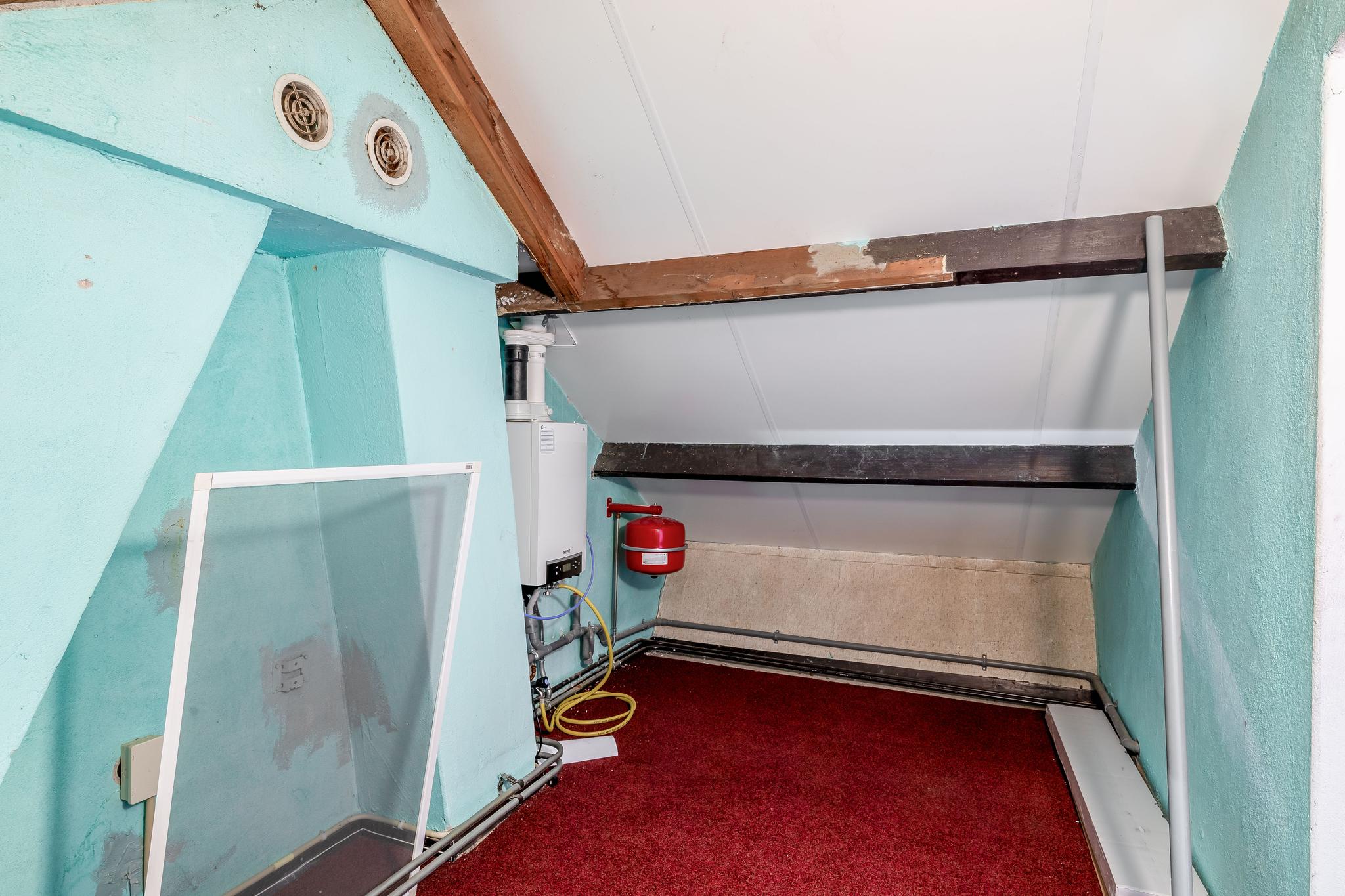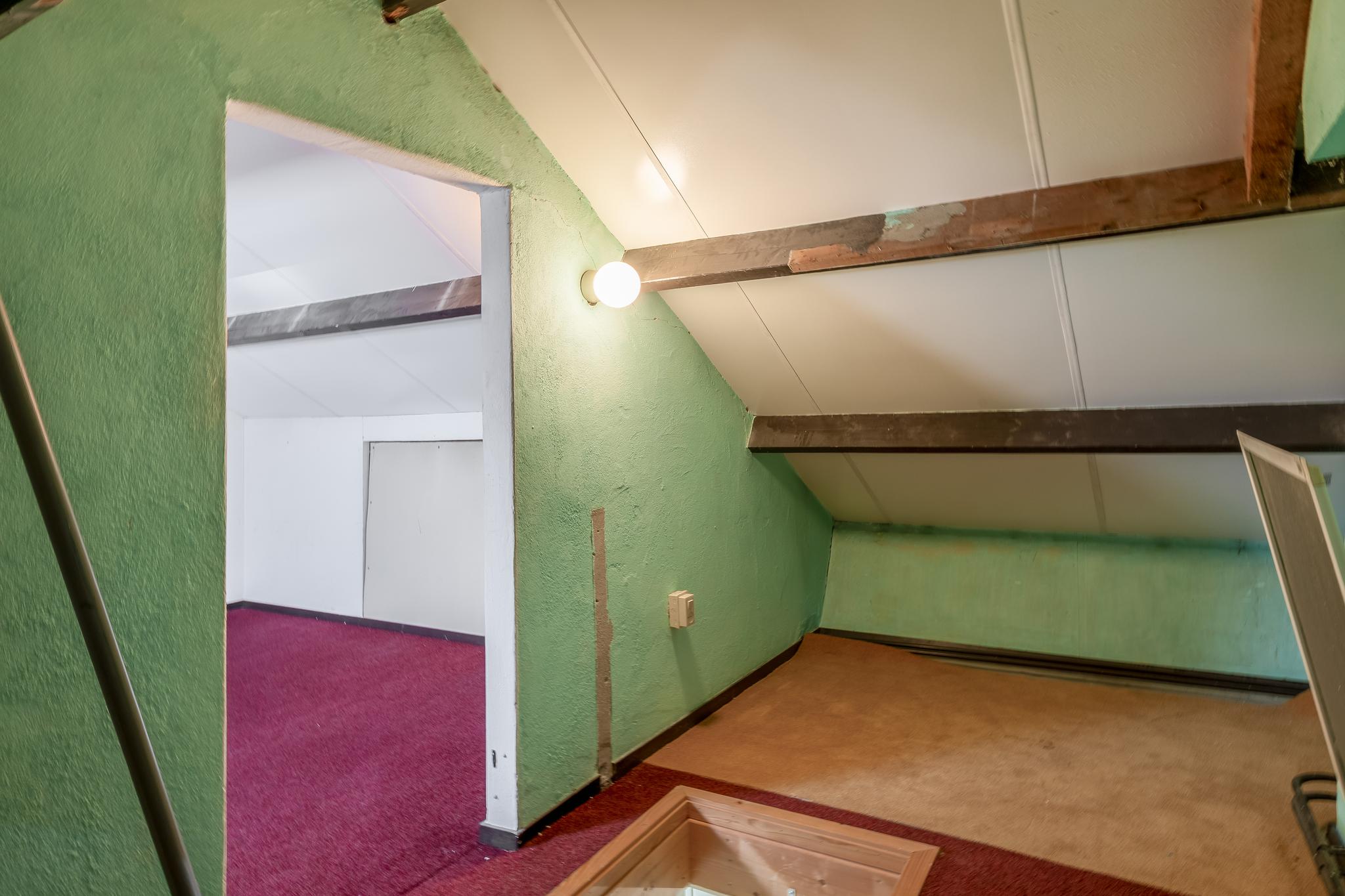 Middels een vlizotrap is de zolder bereikbaar. De overloop, met CV-ketel, geeft toegang tot een ruimte, met berging onder het schuine dak en een dakraam, die geschikt is als berging of hobbyruimte.