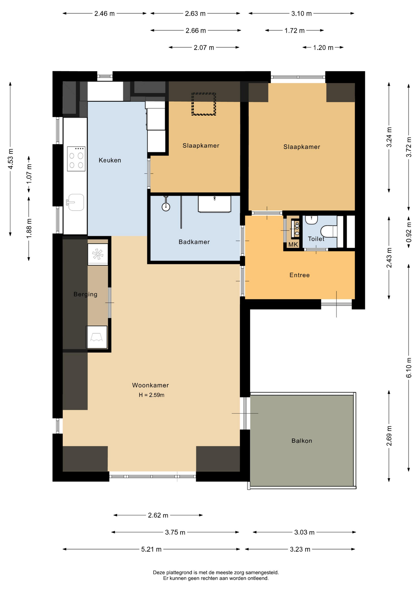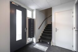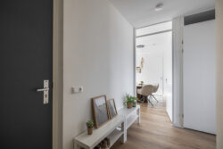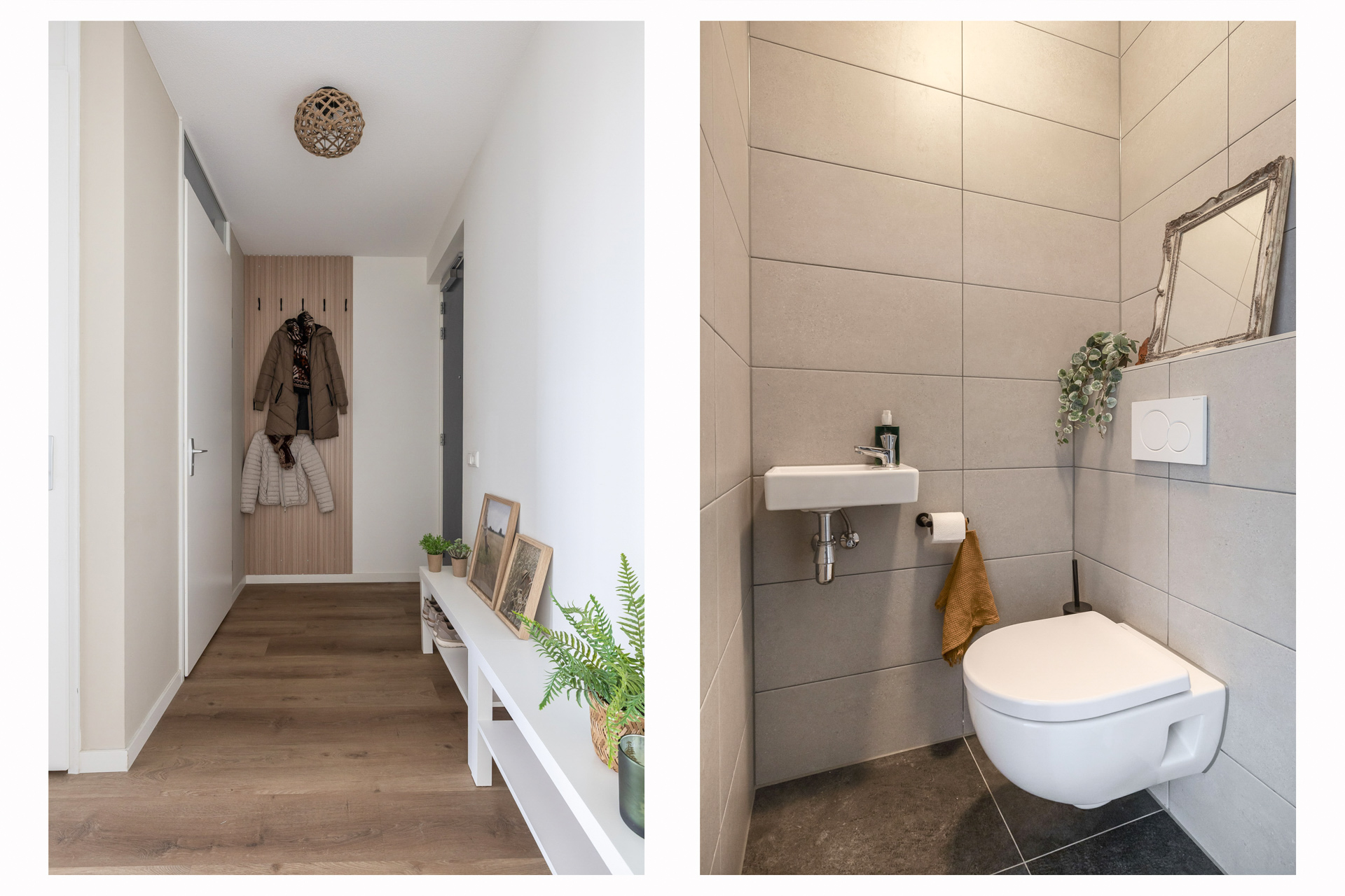 Op de tweede verdieping geeft de hal toegang tot het appartement. De entreehal met toilet en meterkast vormt de centrale verbinding naar de woonkamer, keuken, badkamer en een van de slaapkamers.