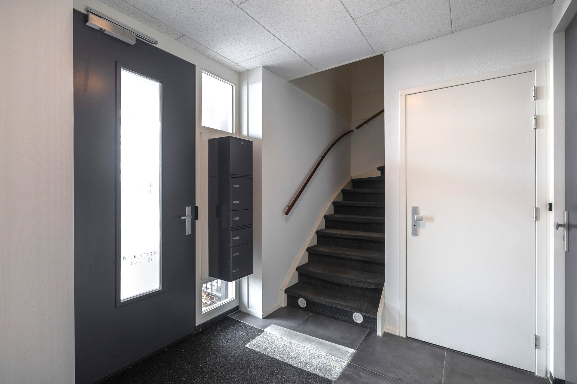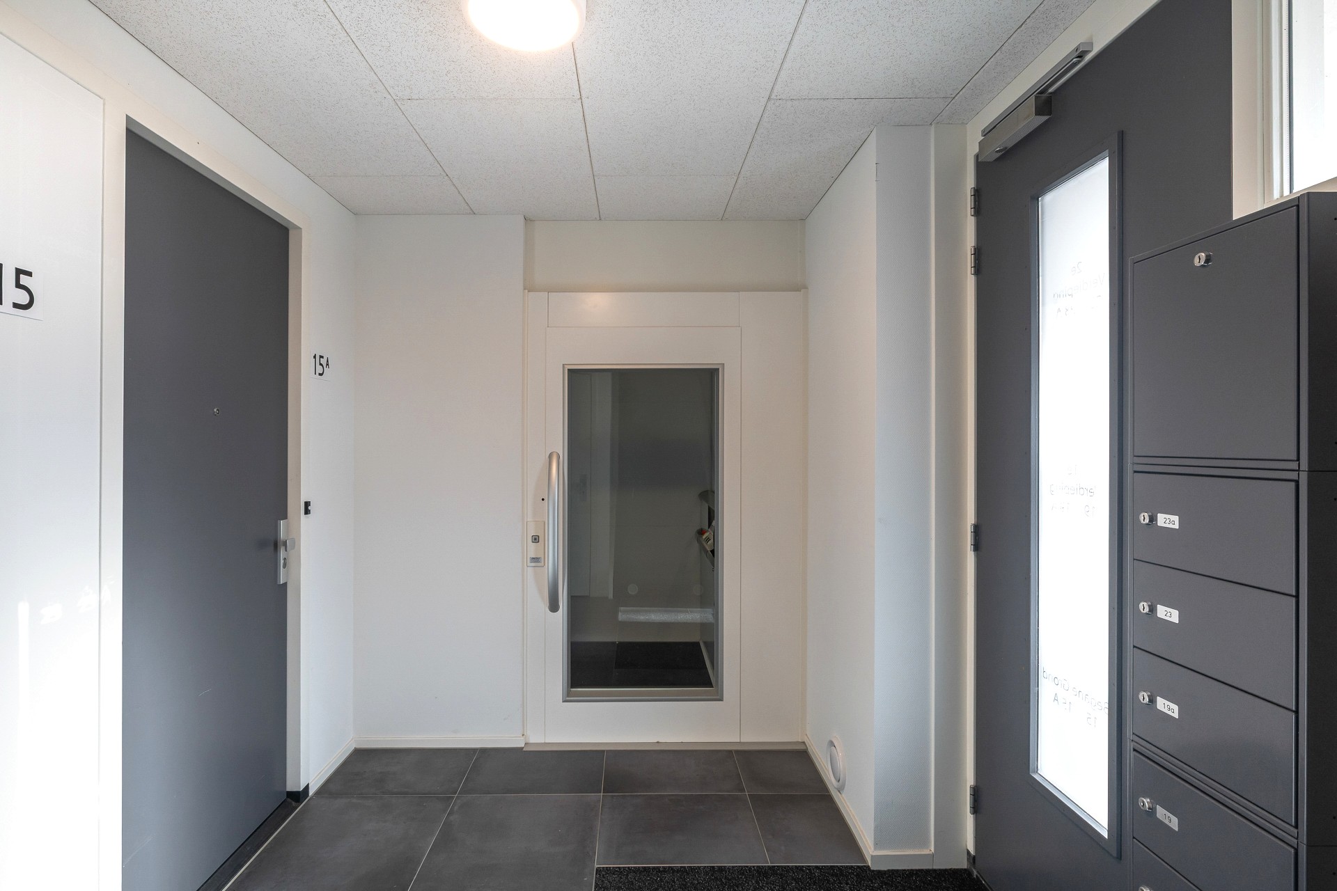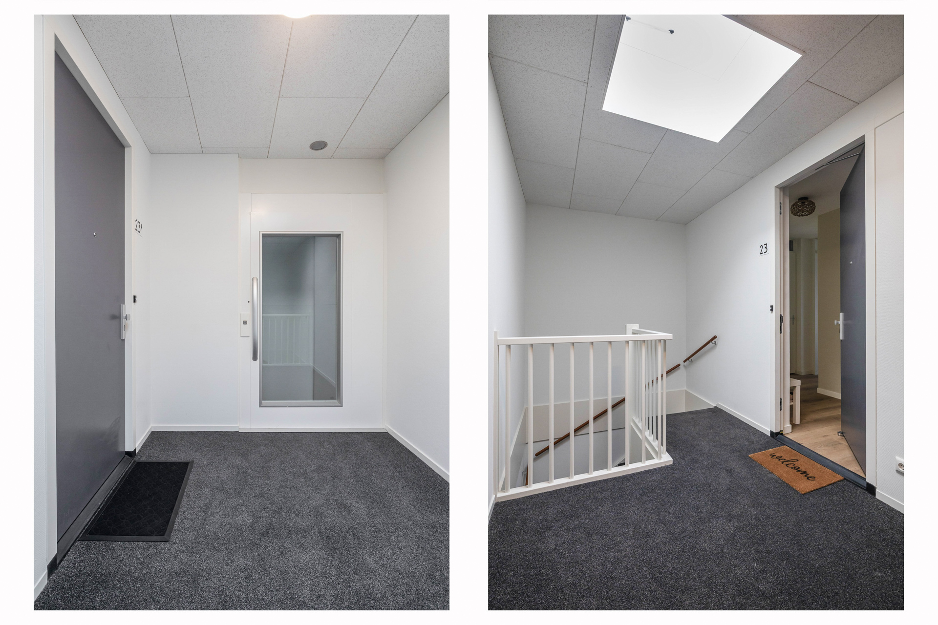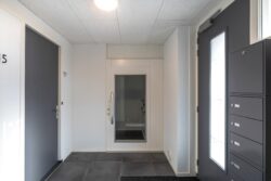 De entreehal, met brievenbussen, geeft toegang tot de lift en tot de trapopgang.