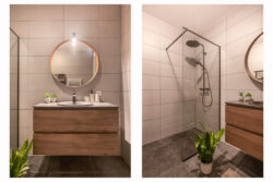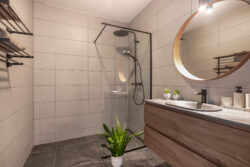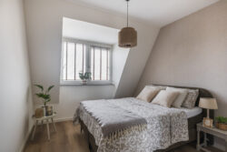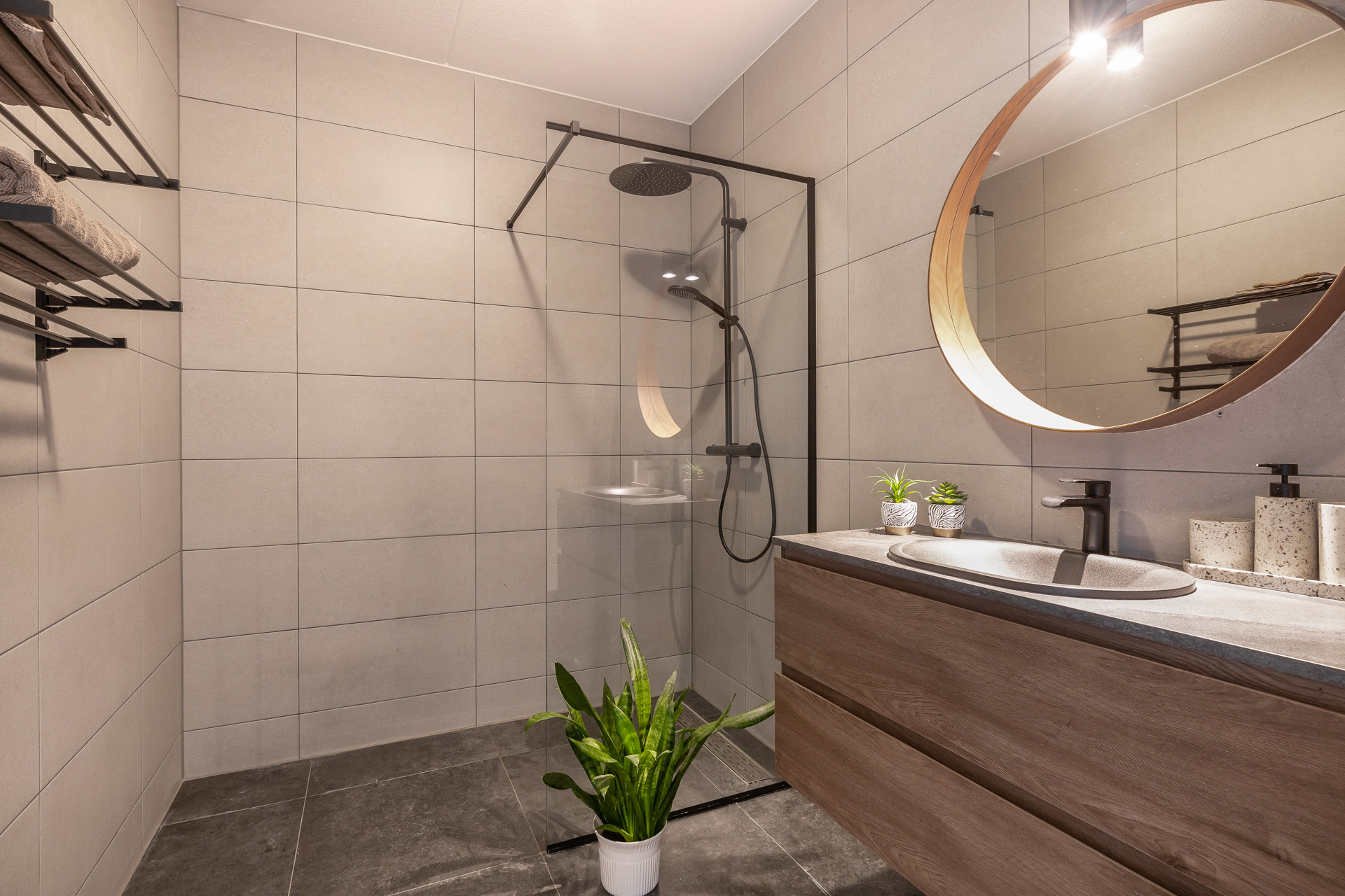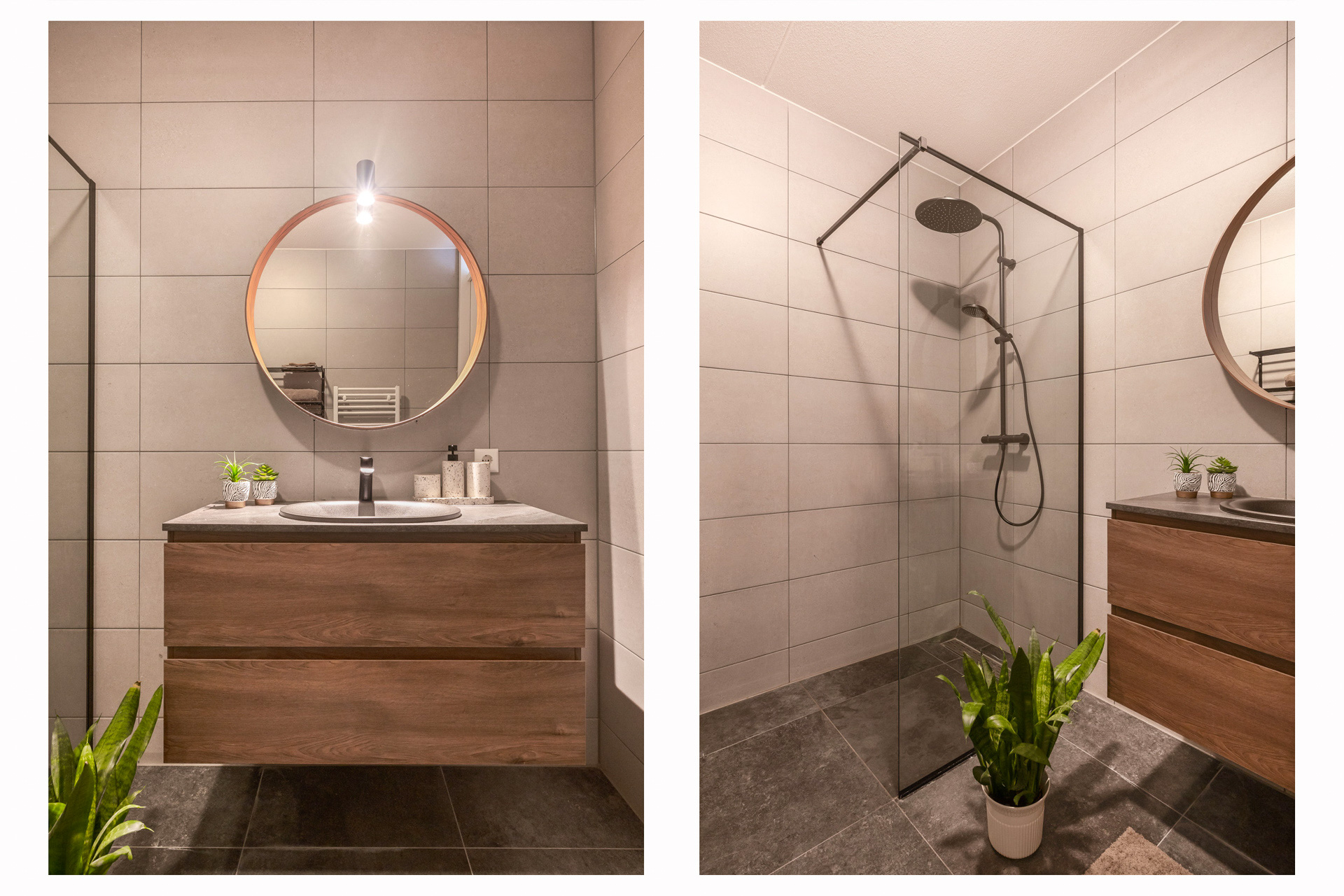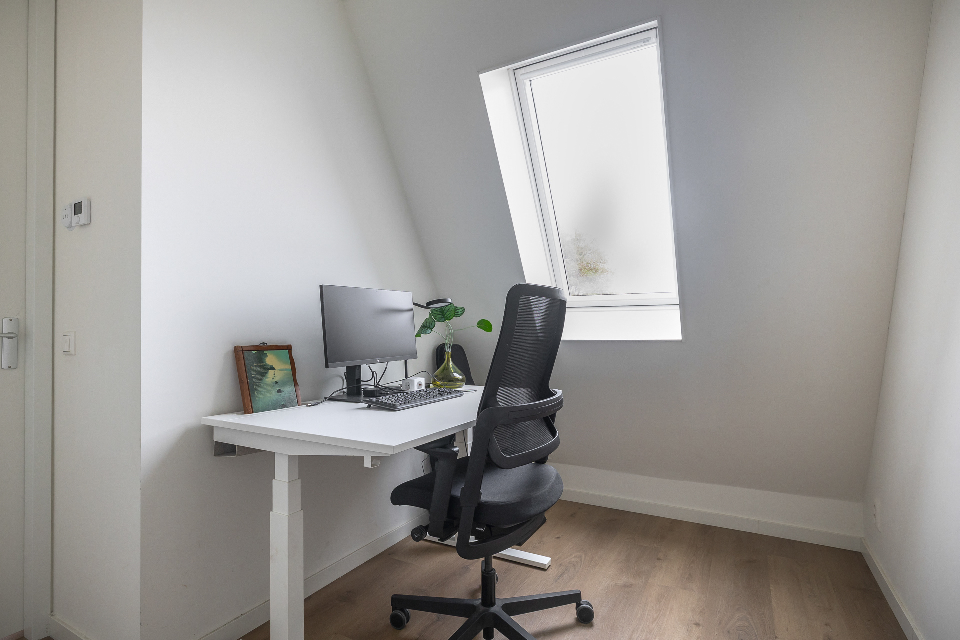 Vanuit de keuken bereik je de tweede slaapkamer waar een dakraam voor een comfortabele lichttoevoer zorgt. De eerste slaapkamer grenst aan de entreehal en is voorzien van een PVC vloer. De badkamer is volledig betegeld en beschikt over een stijlvolle inloopdouche en wastafel.