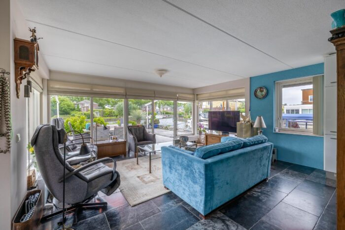 Vanuit de entreehal, met meterkast en toilet, is de woon-/eetkamer bereikbaar. Deze ruimtes kenmerken zich door de grote raampartijen met het vele daglicht en een geweldig uitzicht over het water. De open keuken beschikt over diverse apparatuur, zoals kookplaat, afzuigkap, oven, koel-vriescombinatie en een vaatwasser. De begane grond is voorzien van vloerverwarming.