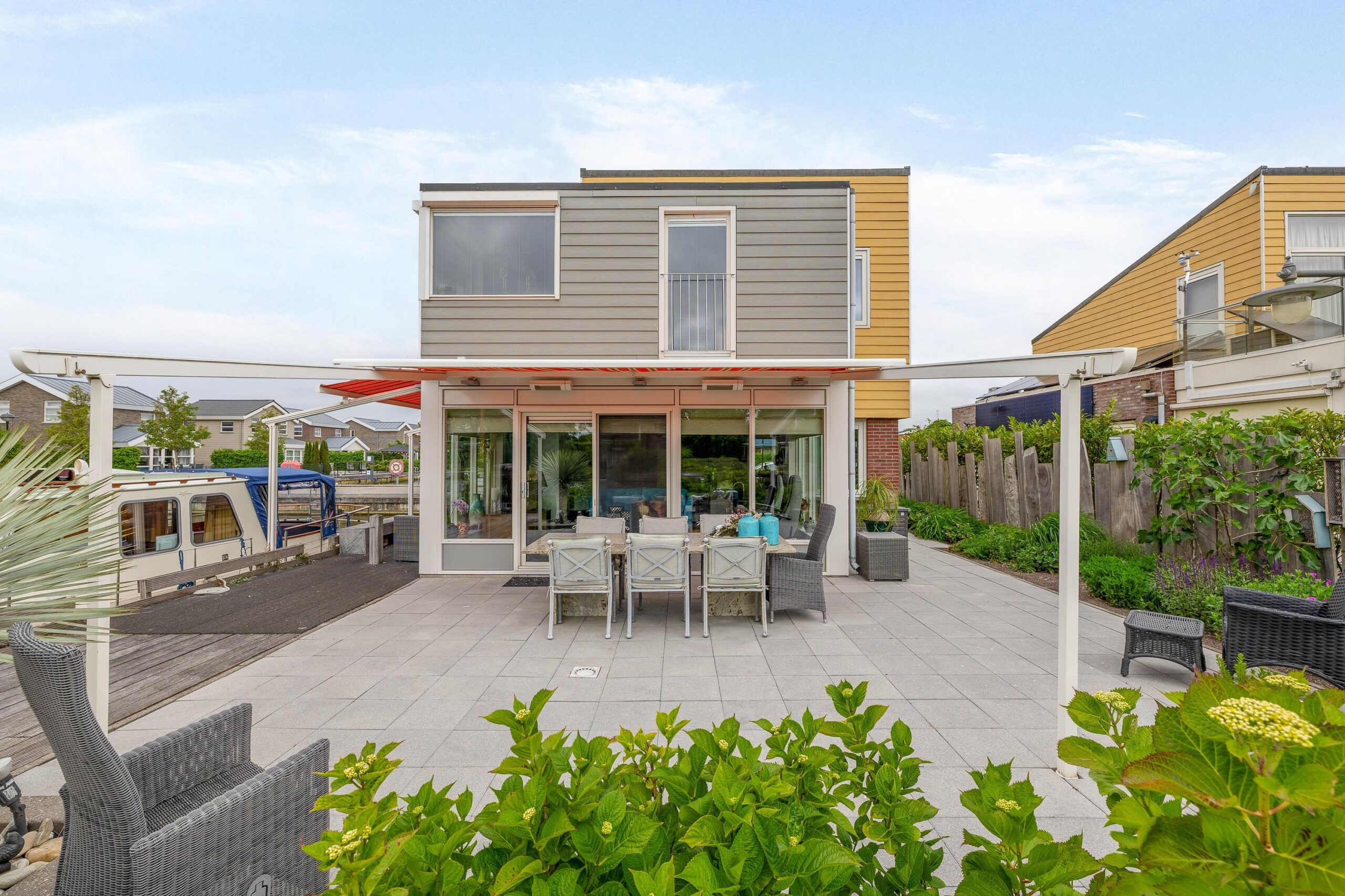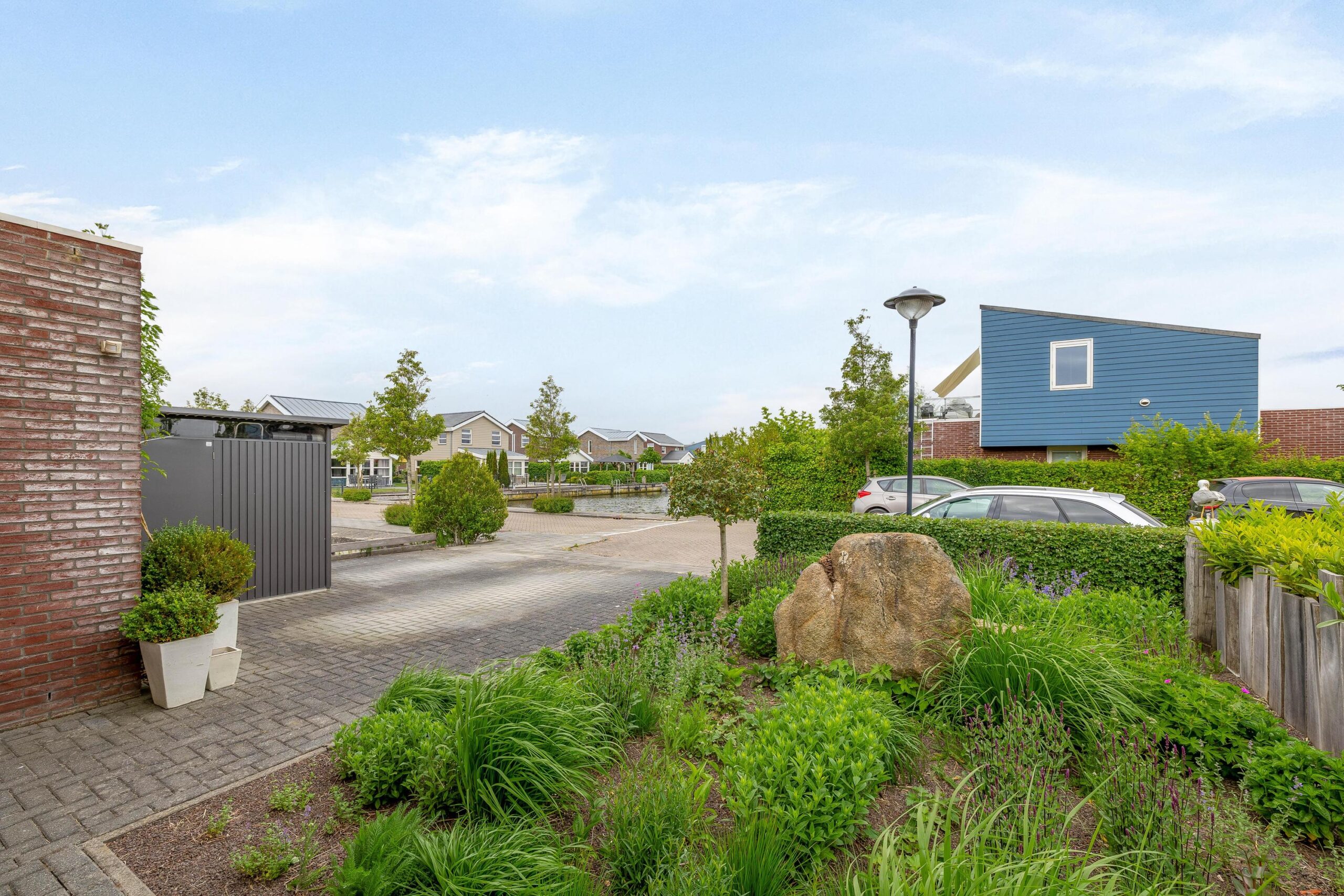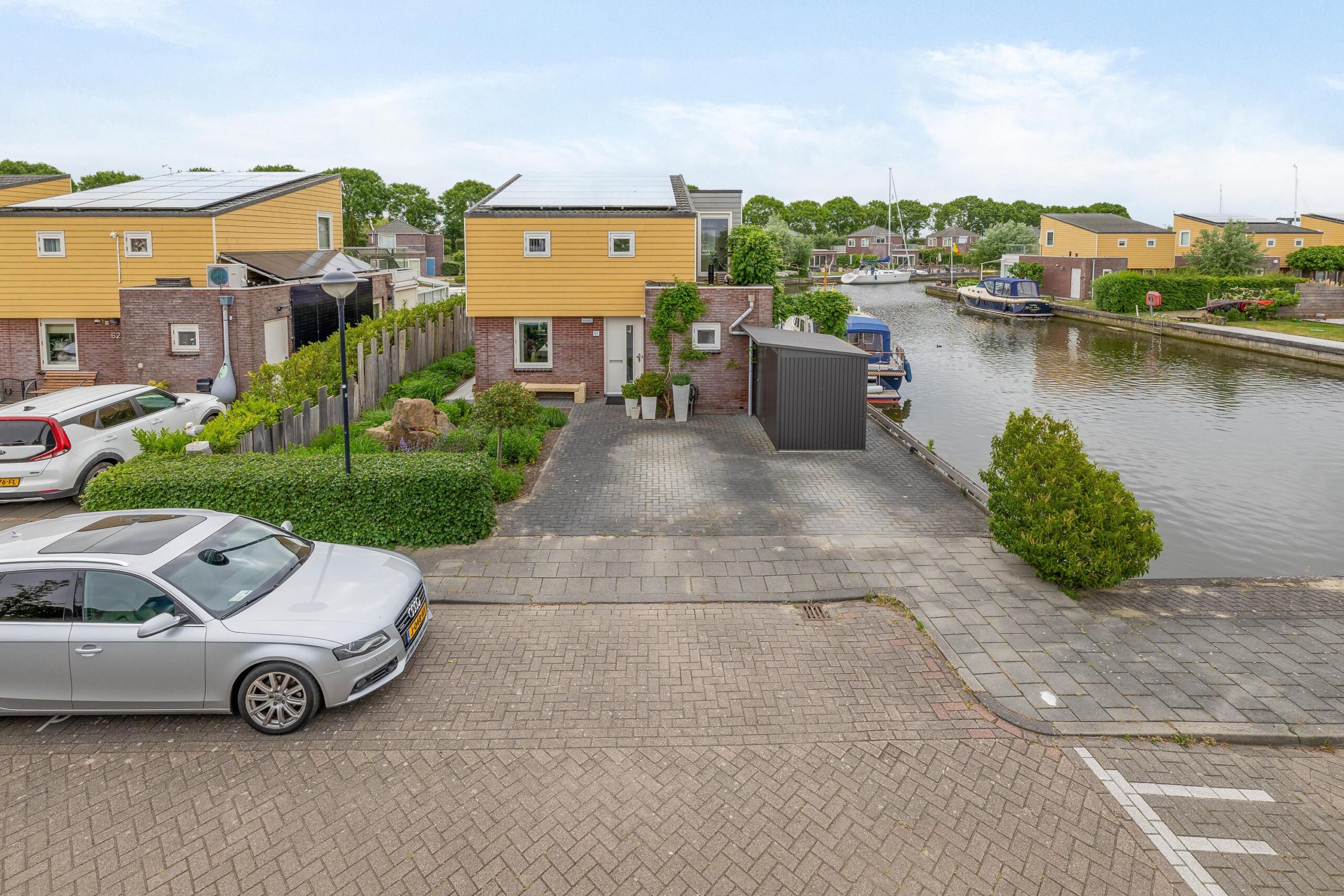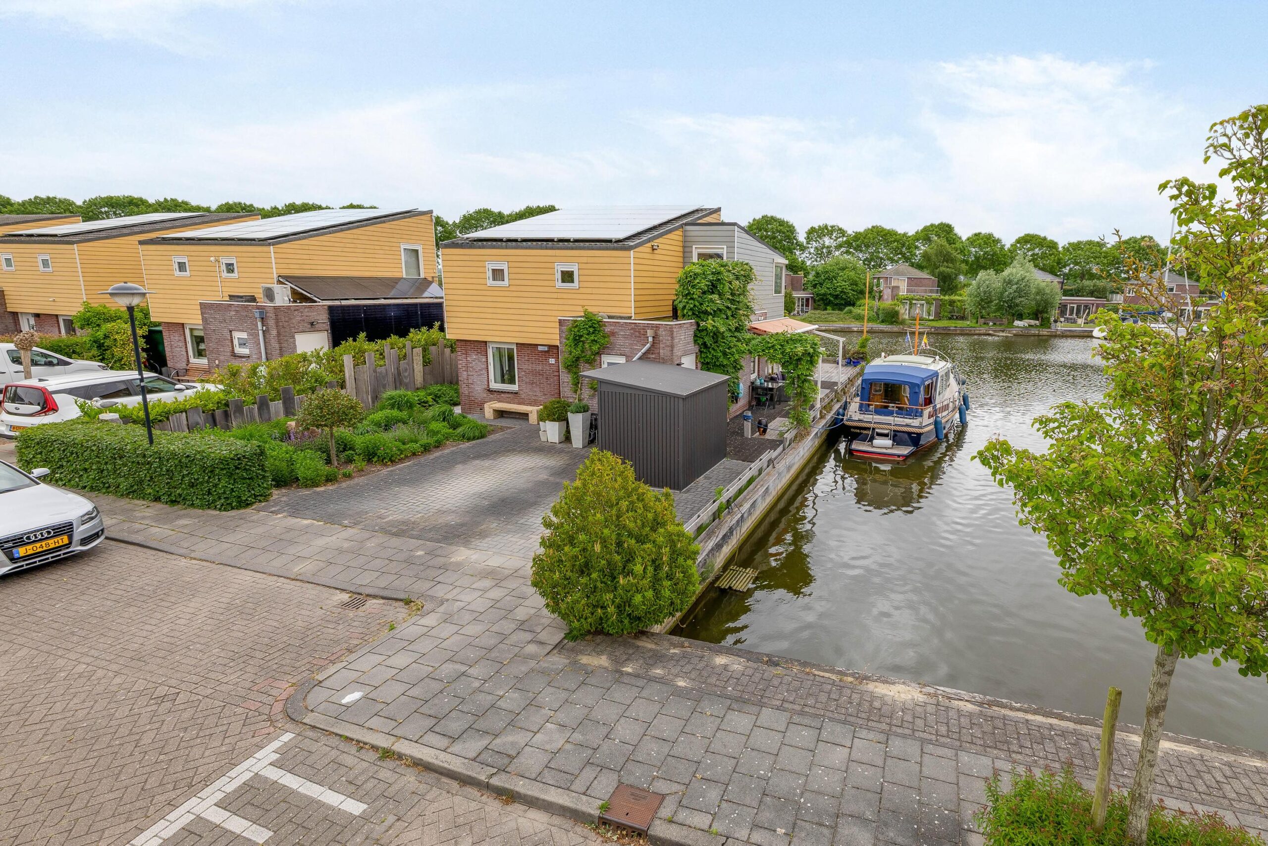 De ruime oprit geeft voldoende ruimte om twee auto’s op eigen terrein te parkeren. Vanaf de oprit zijn de bergingen bereikbaar en in de aangebouwde berging is de CV-ketel (2023) geplaatst. De tuin is rondom gelegen, goed verzorgd en fraai aangelegd met vaste planten en heesters. Aan de achterzijde van de woning is een zonnescherm met daaronder buitenverlichting en verwarming. Dit plekje, in combinatie met uitzicht over het water, is volop genieten.