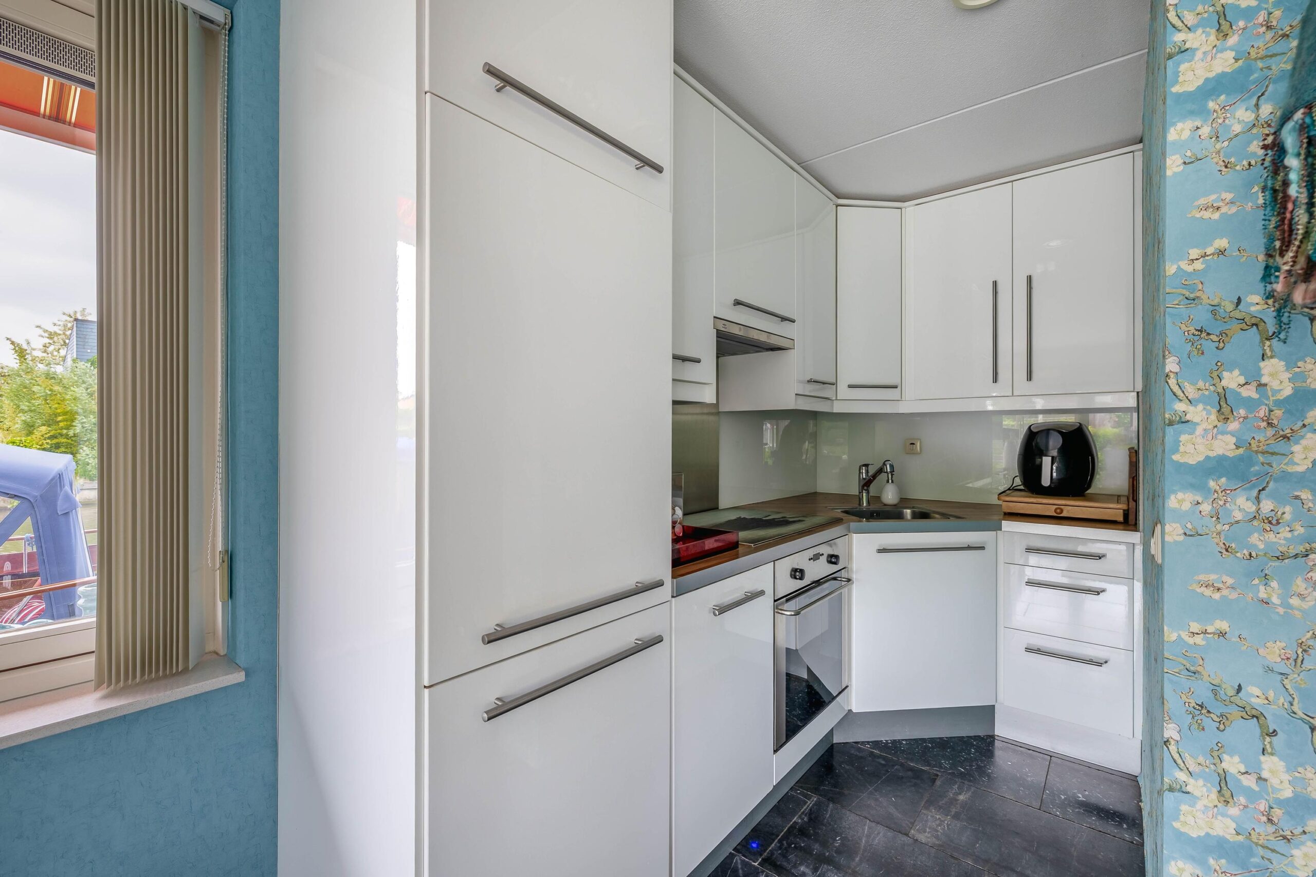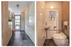 Vanuit de entreehal, met meterkast en toilet, is de woon-/eetkamer bereikbaar. Deze ruimtes kenmerken zich door de grote raampartijen met het vele daglicht en een geweldig uitzicht over het water. De open keuken beschikt over diverse apparatuur, zoals kookplaat, afzuigkap, oven, koel-vriescombinatie en een vaatwasser. De begane grond is voorzien van vloerverwarming.