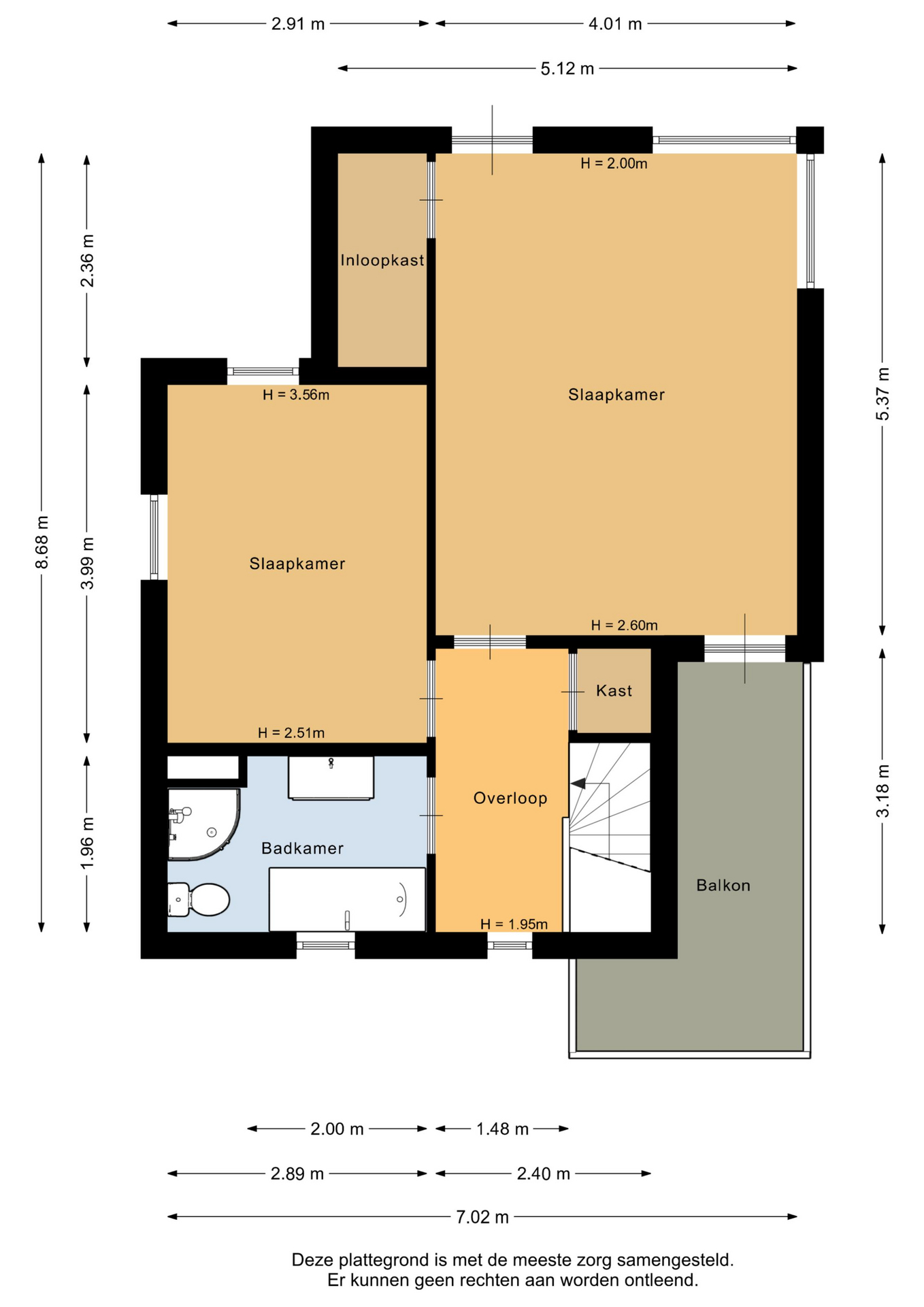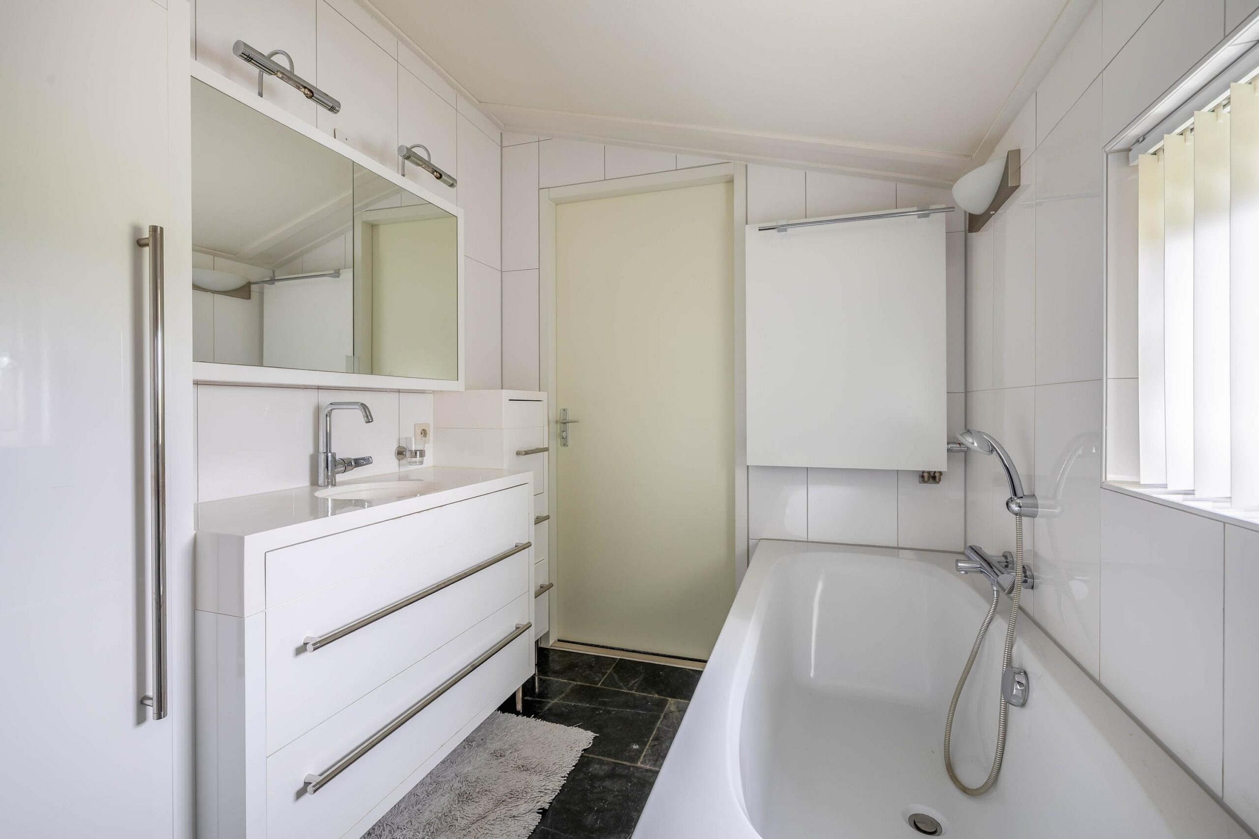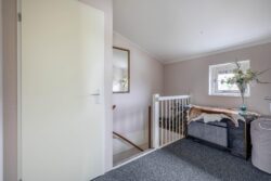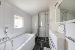 Vanaf de overloop zijn twee slaapkamers en de badkamer toegankelijk. Vanuit de masterbedroom stap je zo op het balkon. Ook is deze slaapkamer voorzien van een inbouwkast en Frans balkon. De badkamer is geheel betegeld en voorzien van een douche, ligbad, toilet en wastafelmeubel.