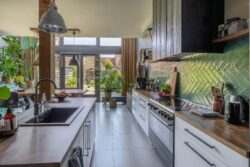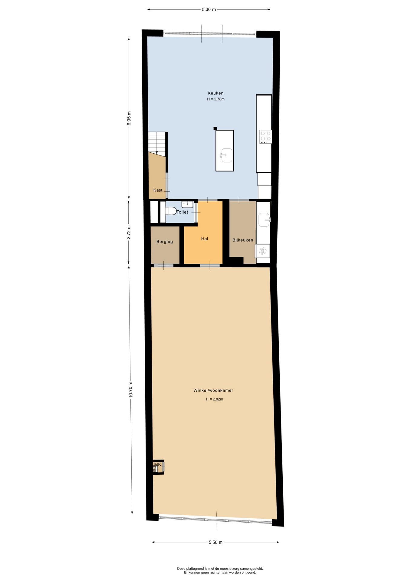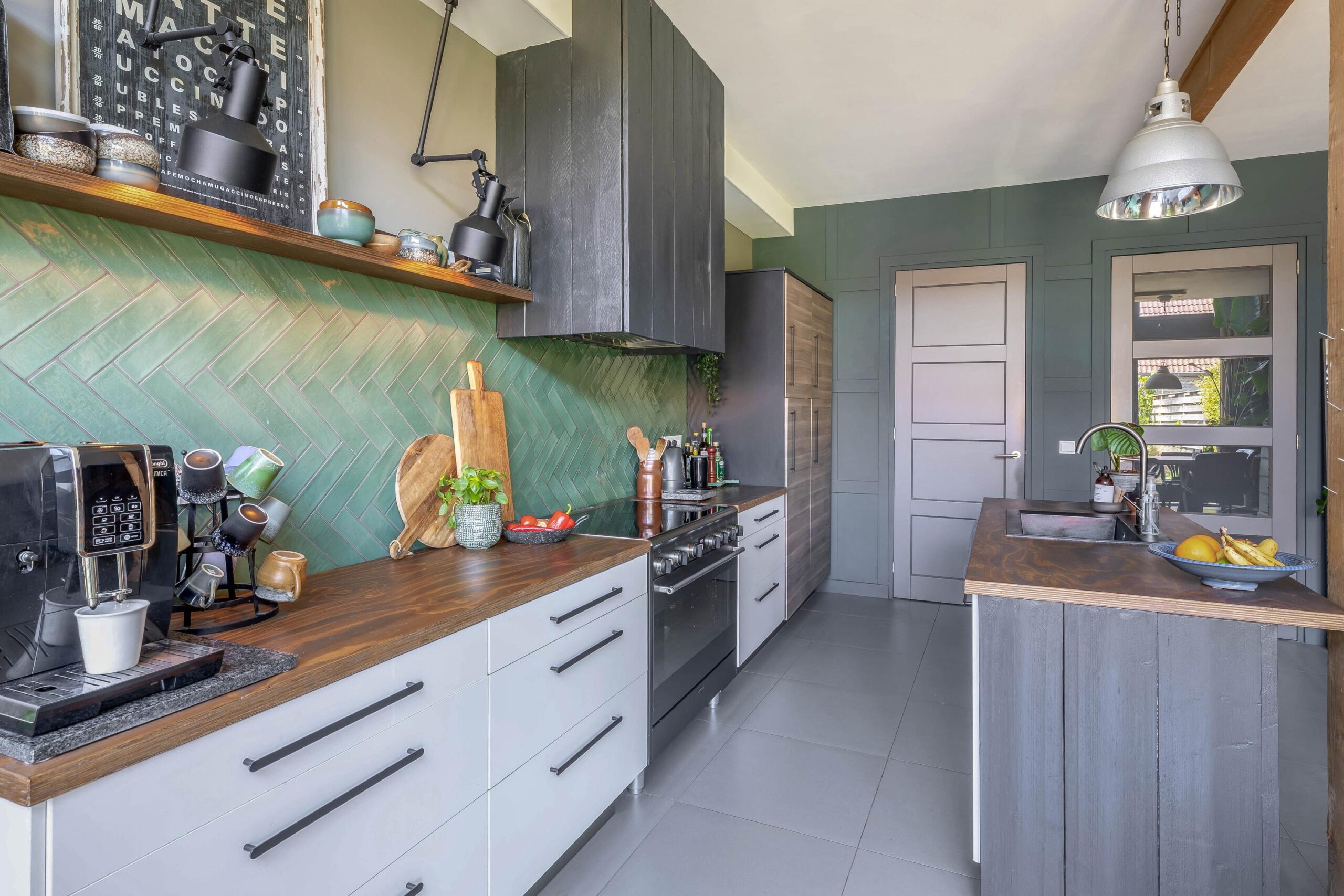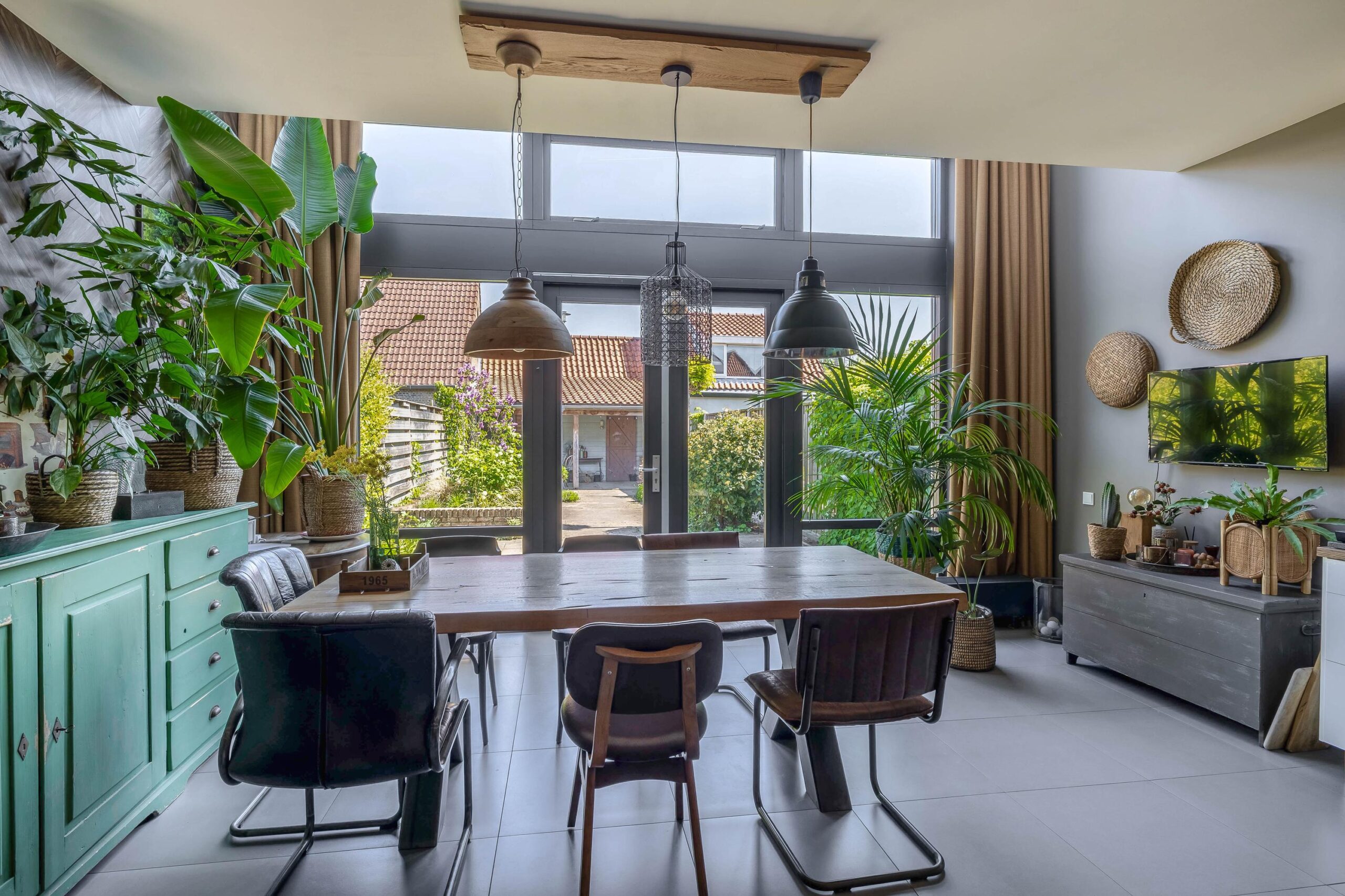 Vanuit de woon-/winkelruimte komt u via de hal, met toilet, in de woonkeuken. De zeer ruime woonkeuken, met plavuizen vloer met vloerverwarming, is voorzien van een spoeleiland en diverse apparatuur, waaronder het nieuwe 5-pits inductie fornuis met oven. De raampartij met openslaande deuren zorgt voor veel lichtinval en geeft toegang tot de tuin. Grenzend aan de keuken bevindt zich de bijkeuken met werkblad met spoelbak en de witgoedaansluitingen.