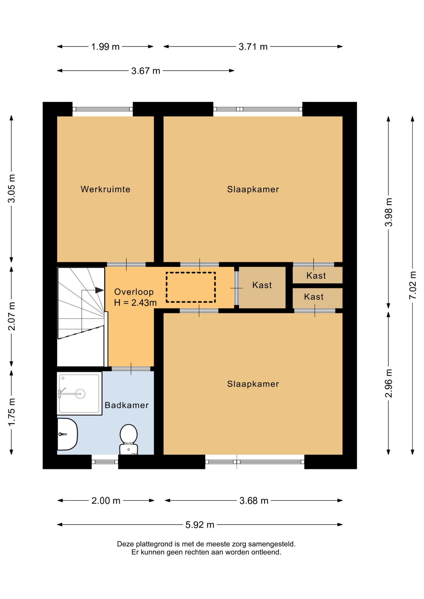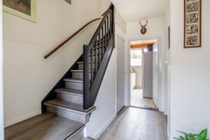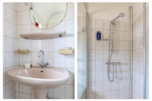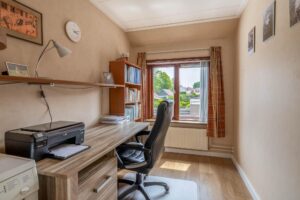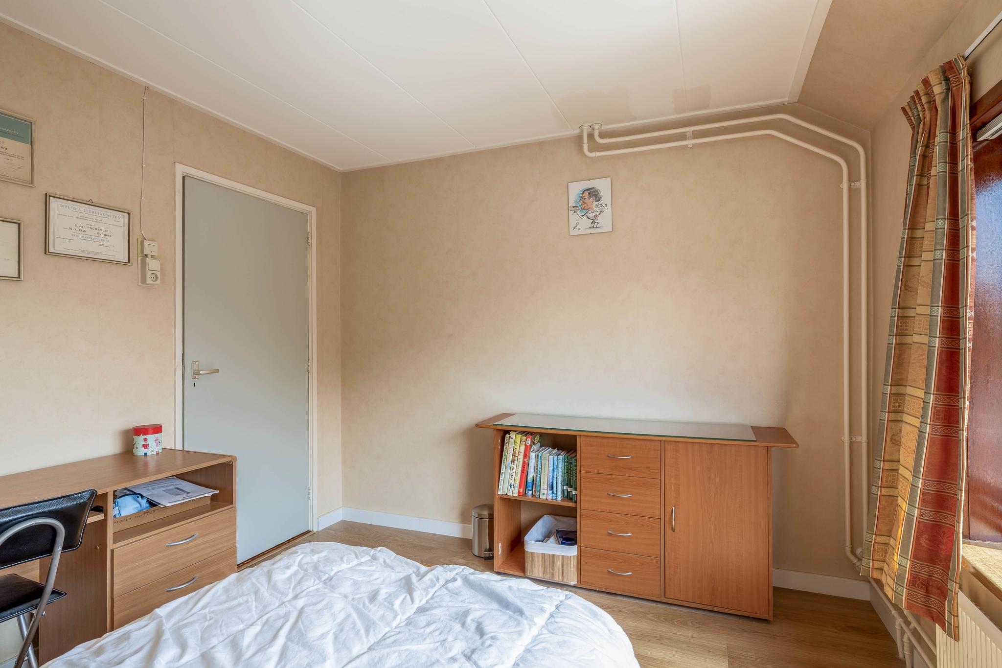 Op de eerste verdieping bevinden, zich twee comfortabele slaapkamers, een kleinere slaapkamer en de badkamer. De kleinere kamer is geschikt als slaapkamer, maar kan ook worden gebruikt als hobby- of werkruimte. De badkamer is geheel betegeld en compleet met douche, toilet en wastafel.