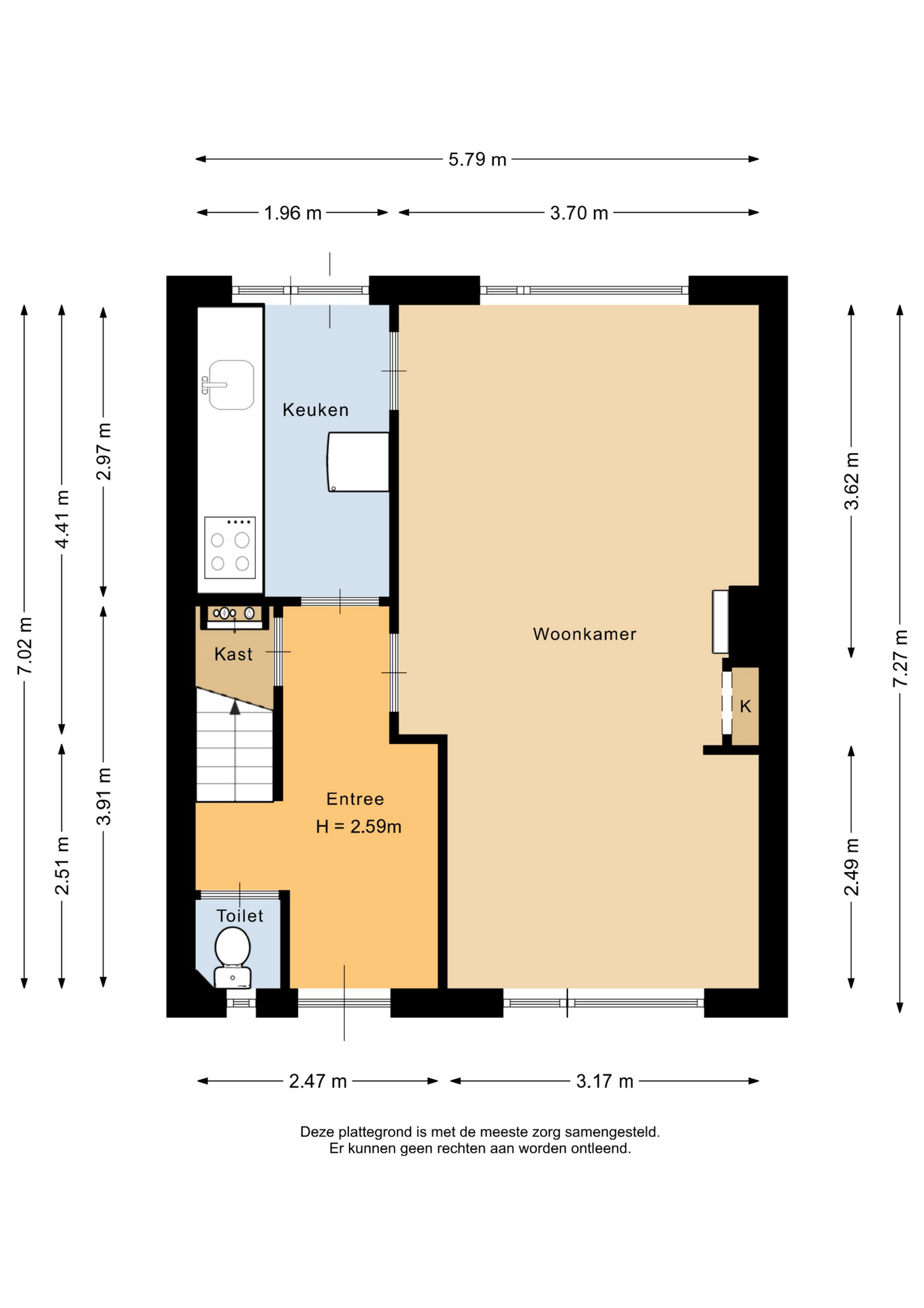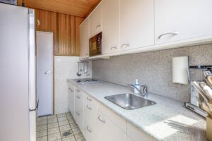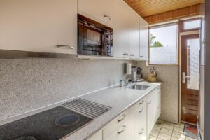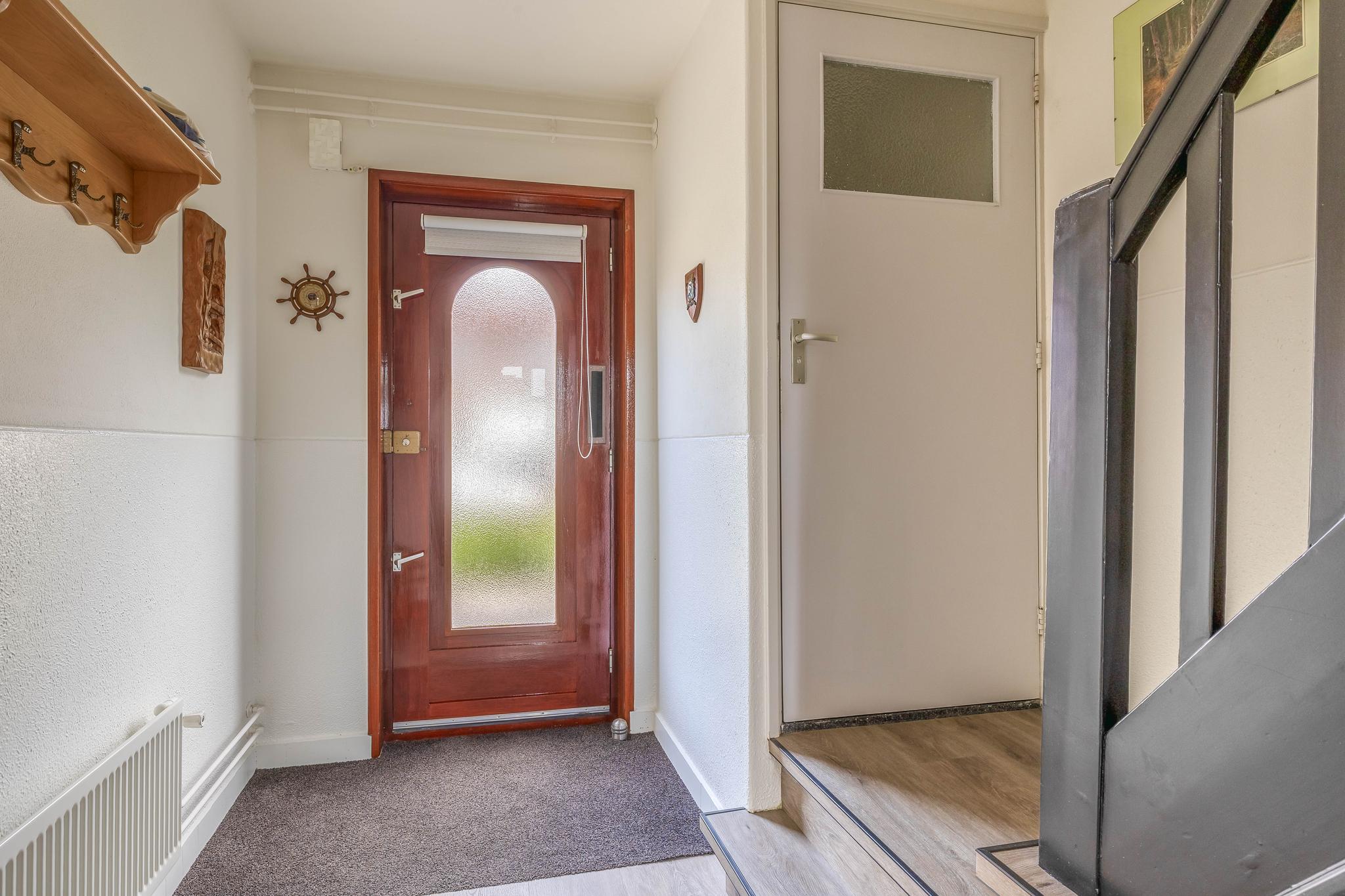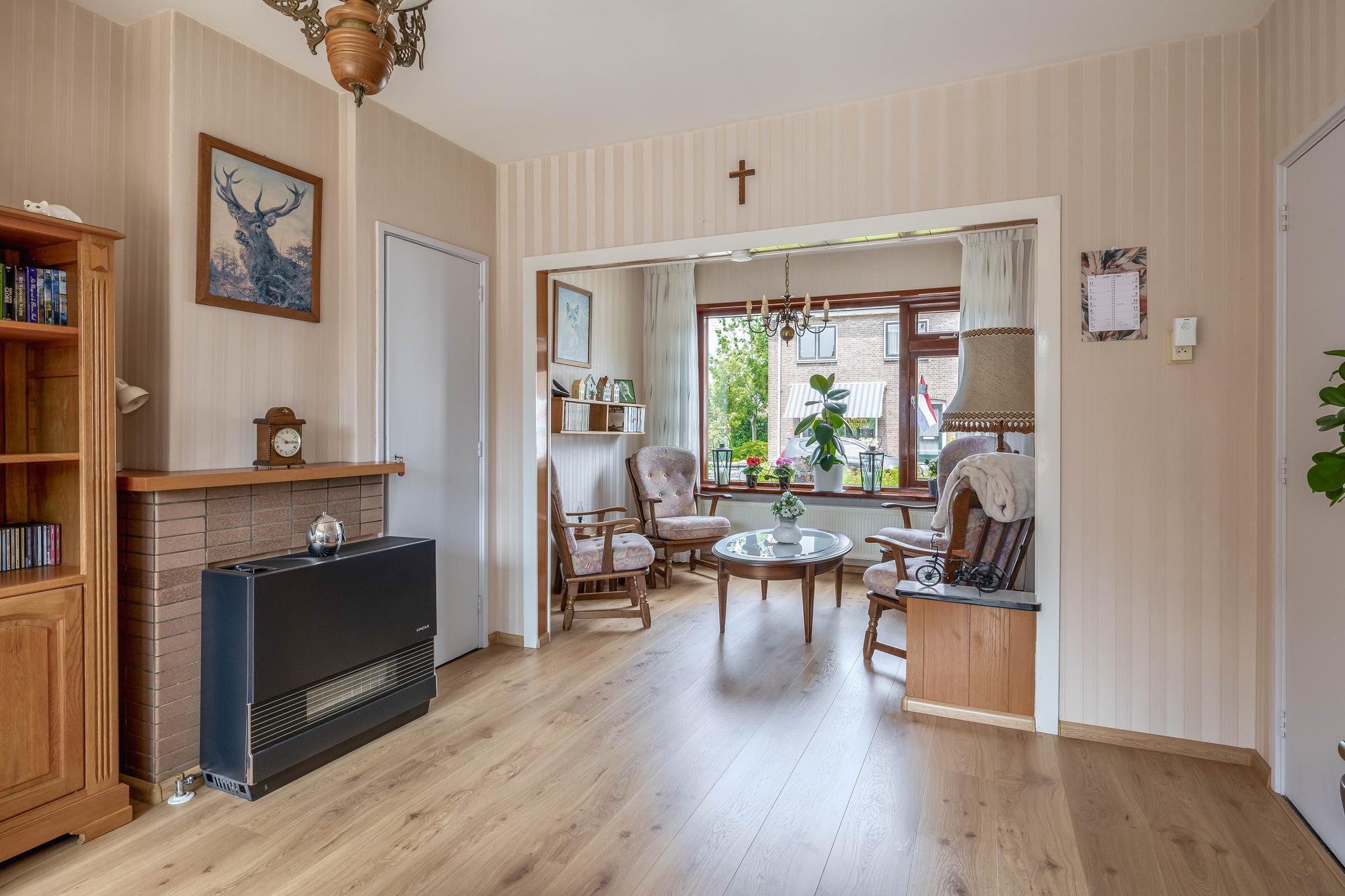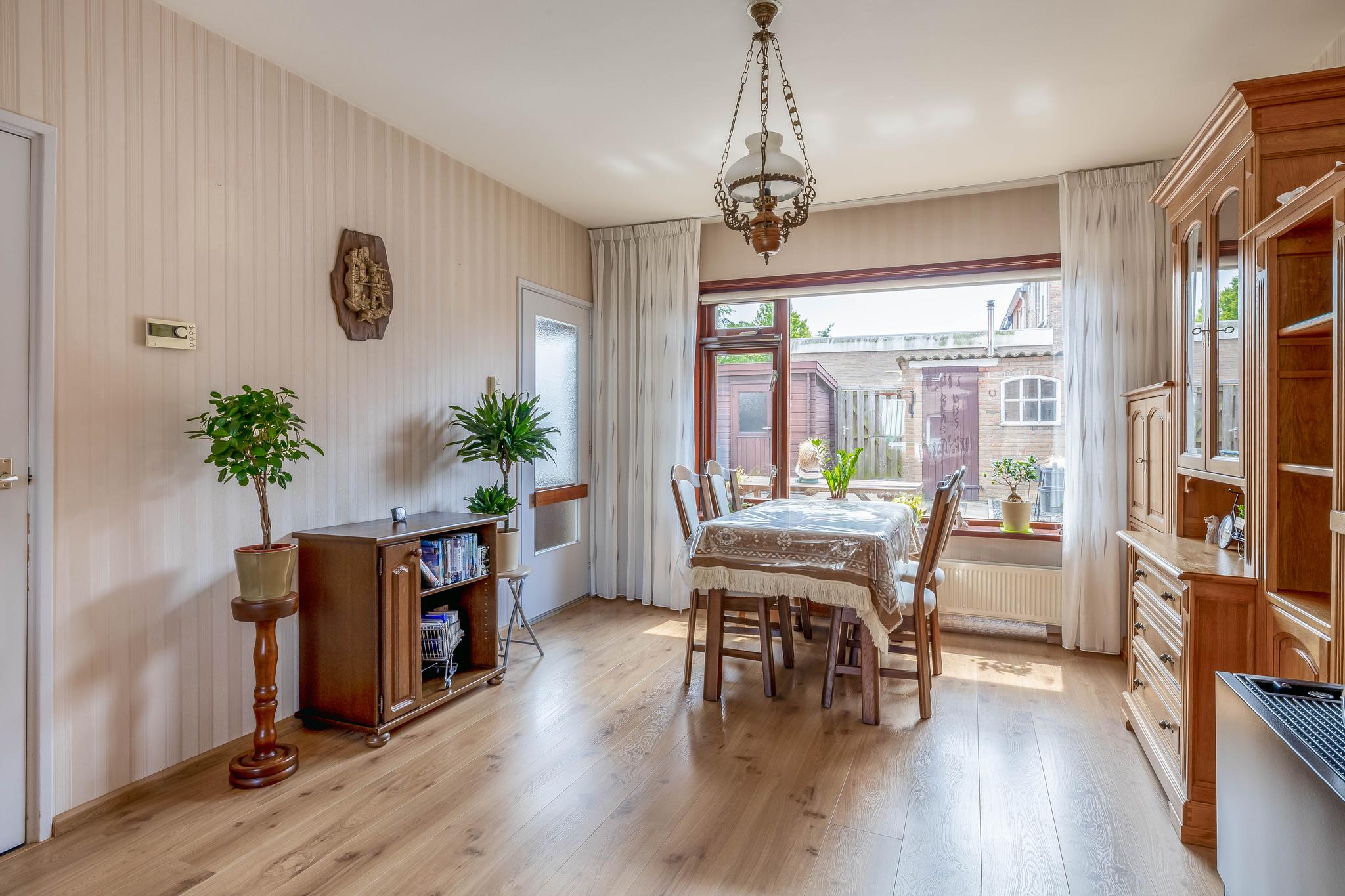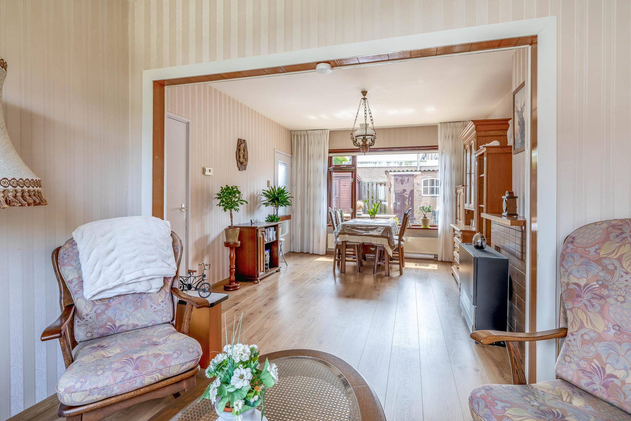 Middels de entreehal, met toilet en kelderkast, zijn de keuken en woonkamer bereikbaar. De doorzonwoonkamer heeft veel lichtinval en is voorzien van een gaskachel. De open keuken, gelegen aan de achterzijde, beschikt over een kookplaat, afzuigkap, magnetron en koelkast. Vanuit de keuken loop je de achtertuin in.