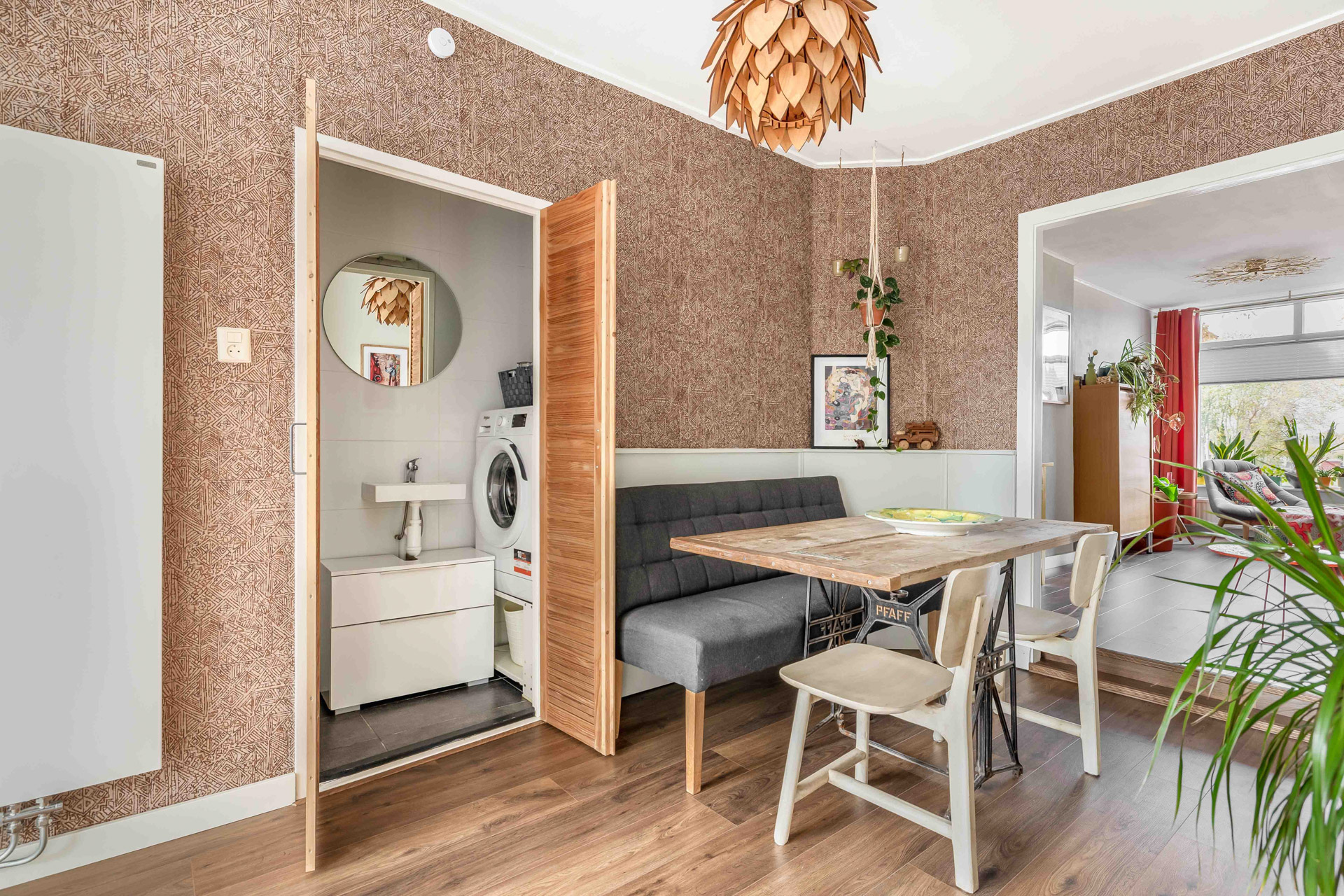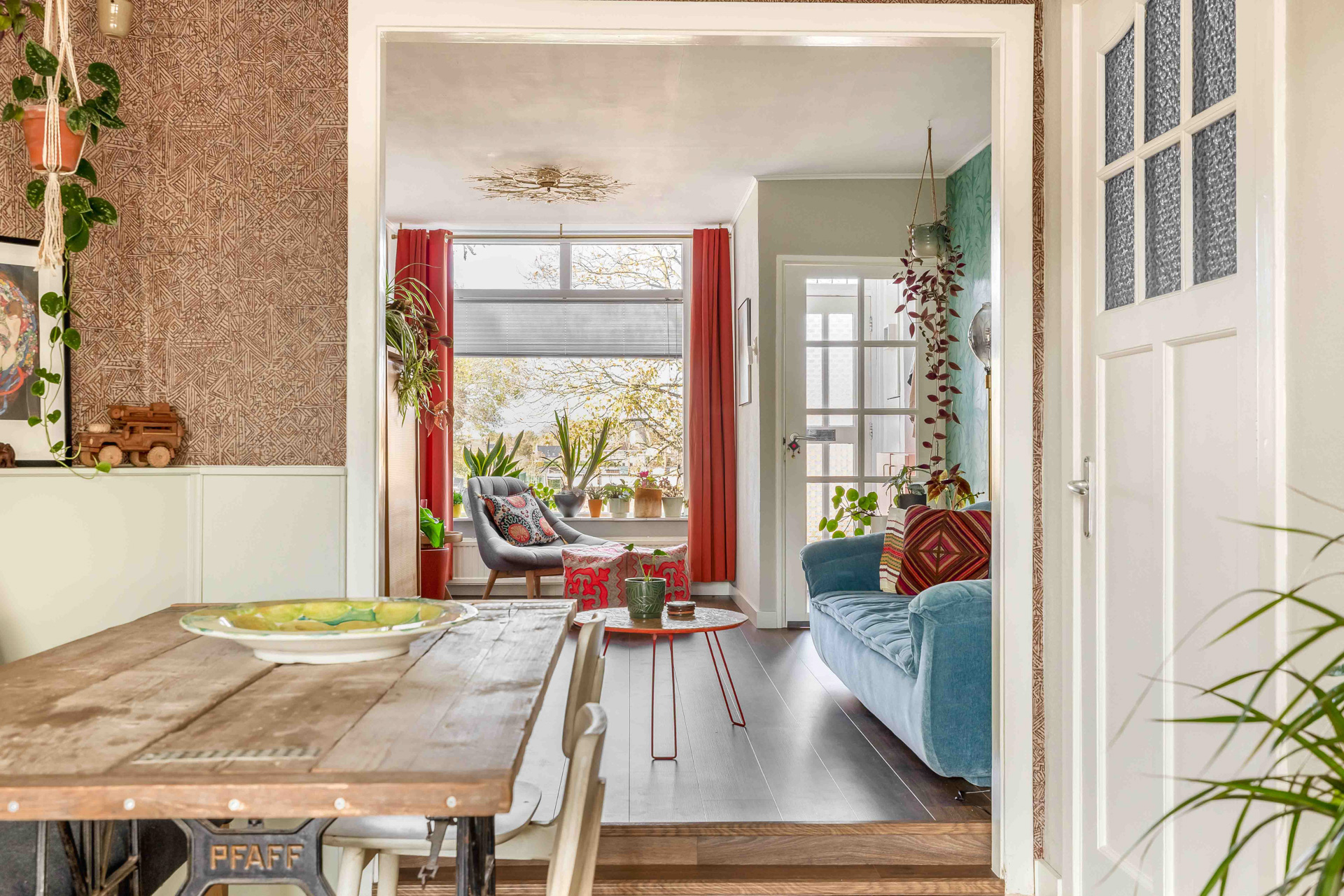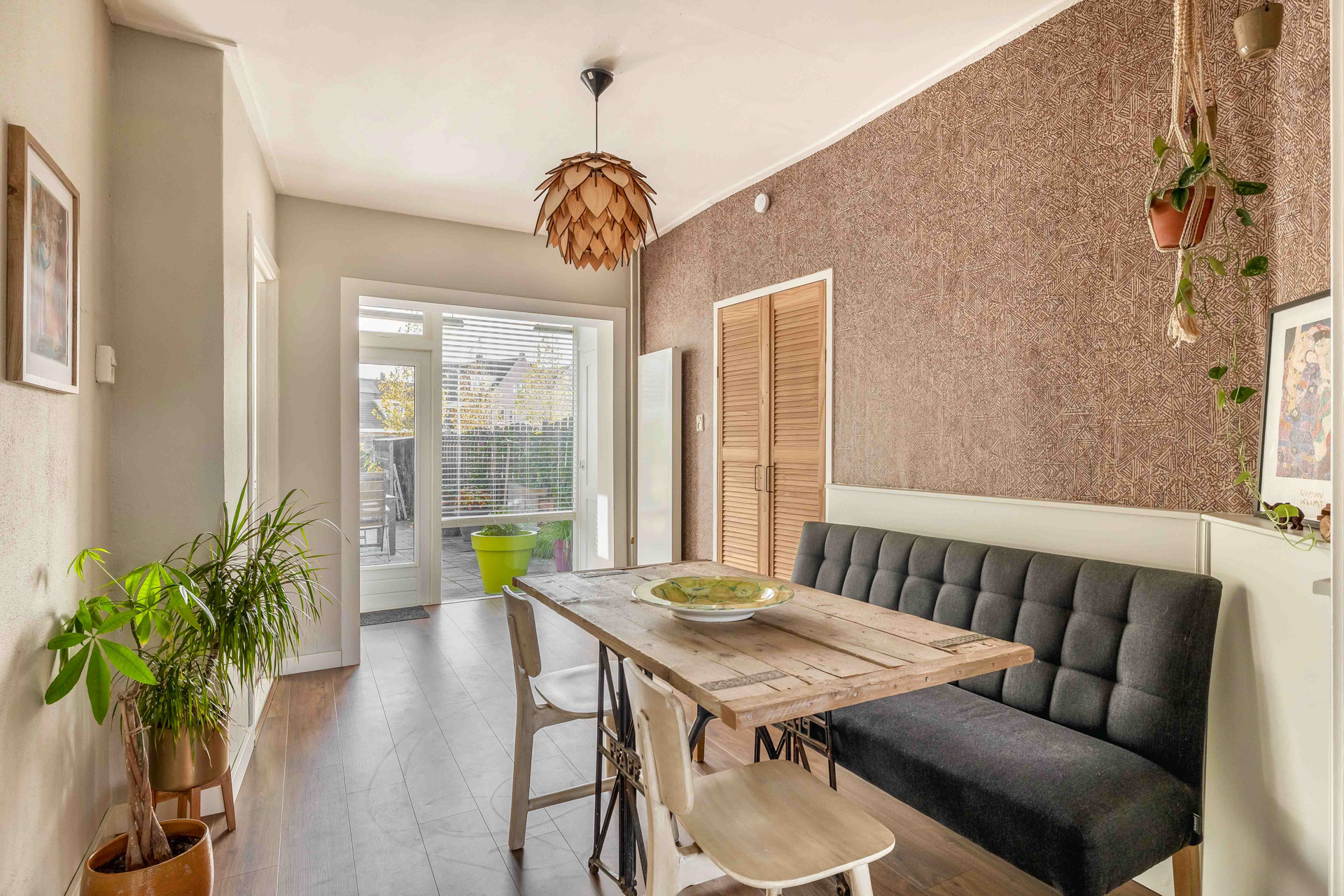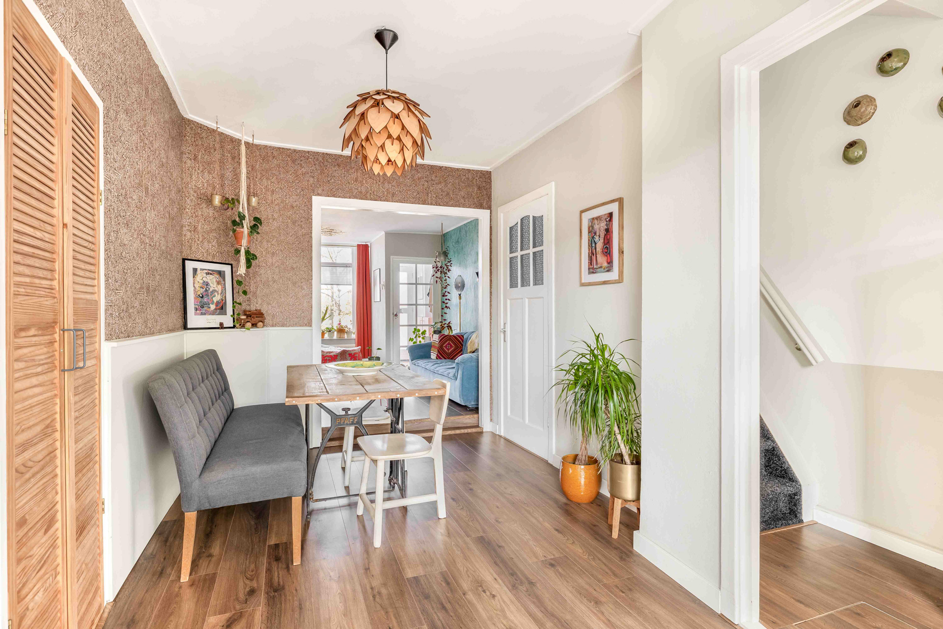 Via de entreehal stap je binnen in de gezellige woonkamer aan de voorzijde van de woning. Dankzij het grote raam stroomt het daglicht rijkelijk naar binnen — een fijne plek om thuis te komen. Aansluitend bevindt zich de sfeervolle eetkamer, voorzien van lambrisering en directe toegang tot de keuken en badkamer.