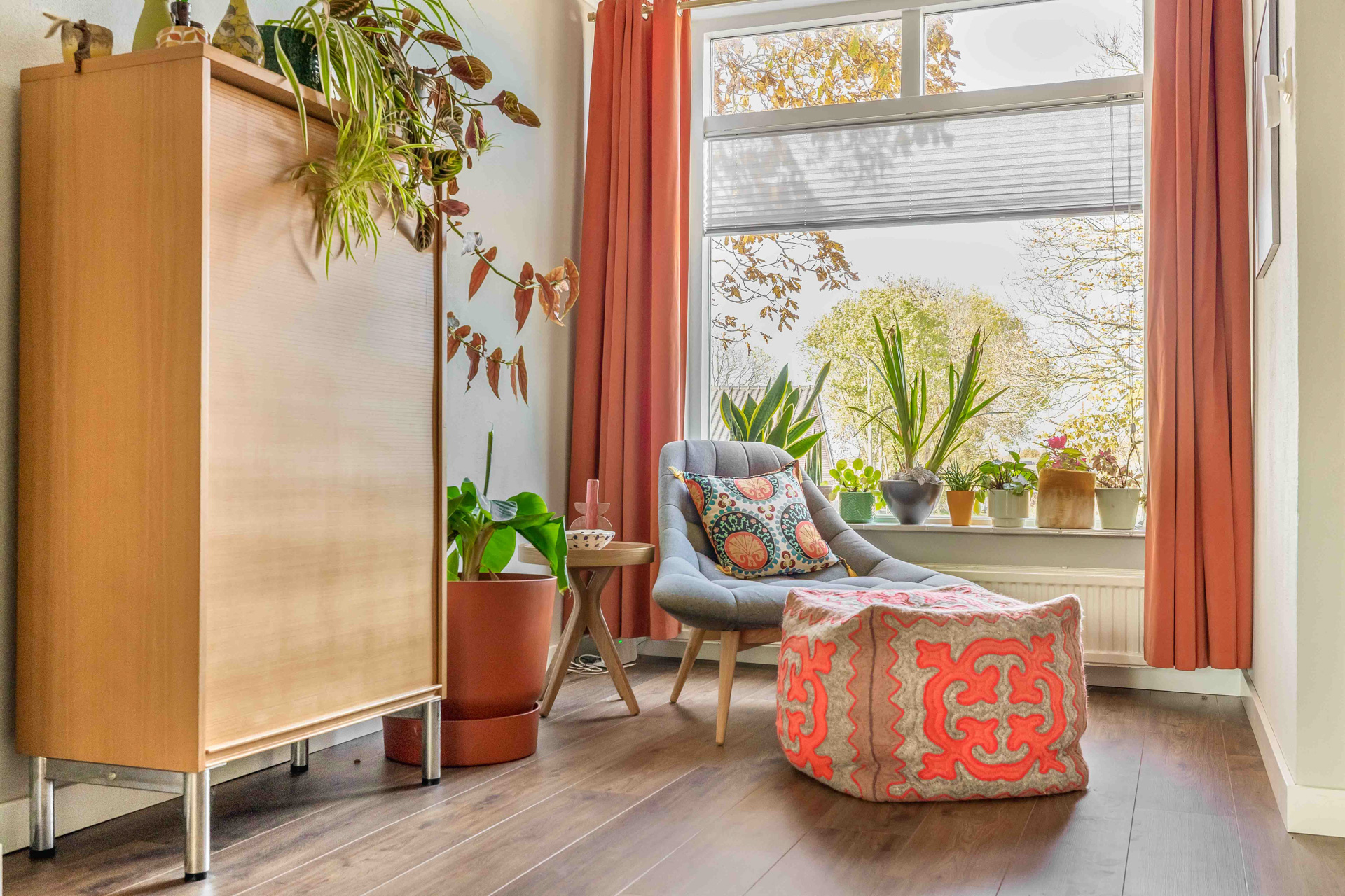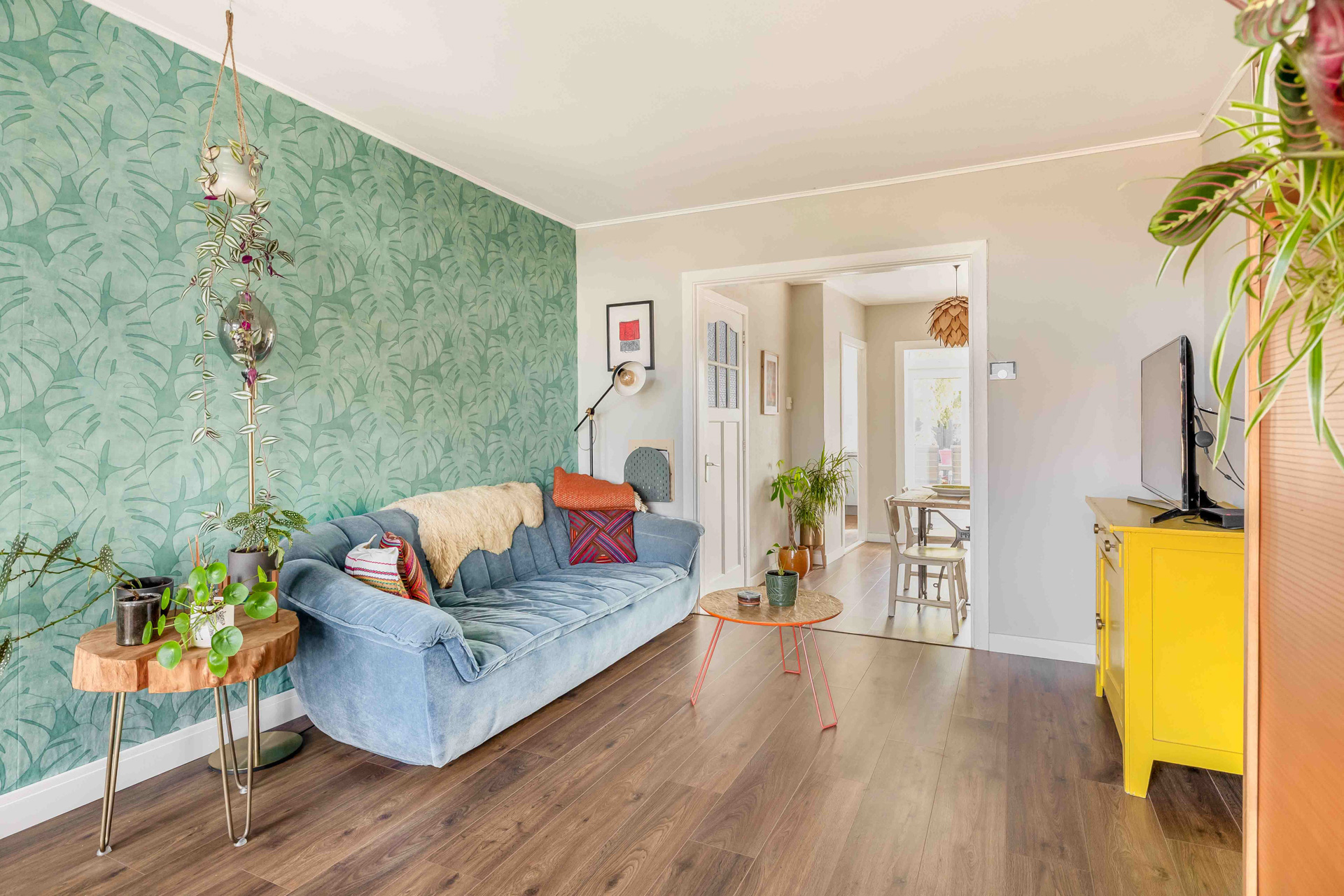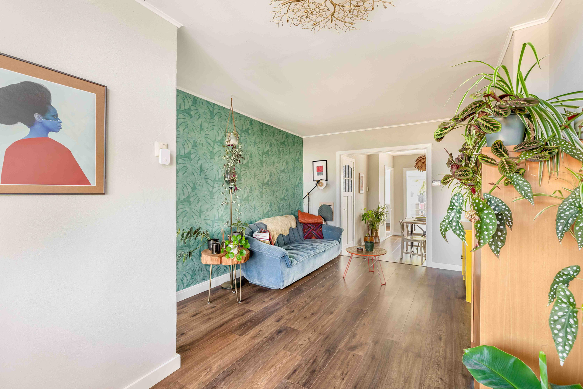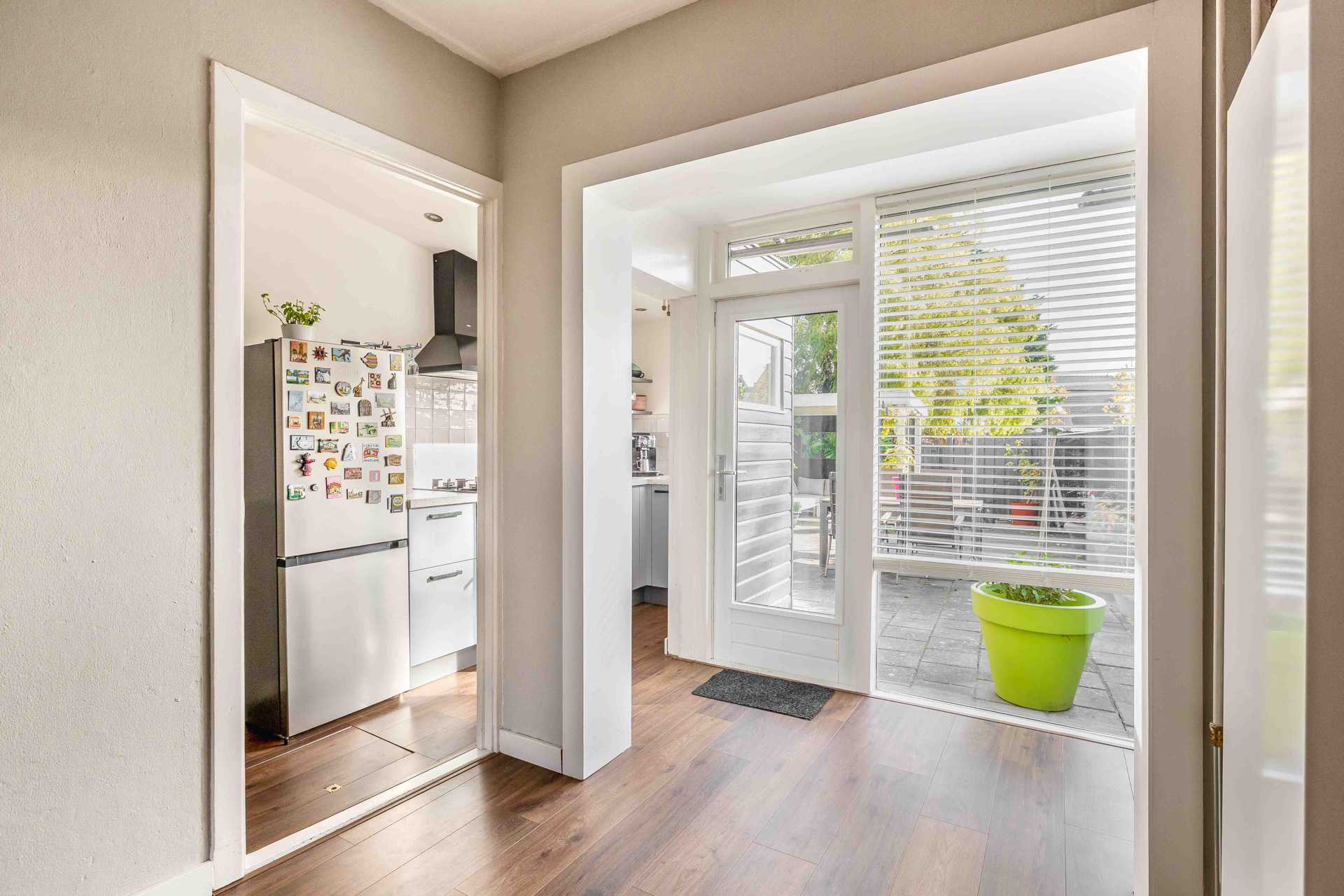 Via de entreehal stap je binnen in de gezellige woonkamer aan de voorzijde van de woning. Dankzij het grote raam stroomt het daglicht rijkelijk naar binnen — een fijne plek om thuis te komen. Aansluitend bevindt zich de sfeervolle eetkamer, voorzien van lambrisering en directe toegang tot de keuken en badkamer.