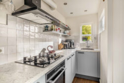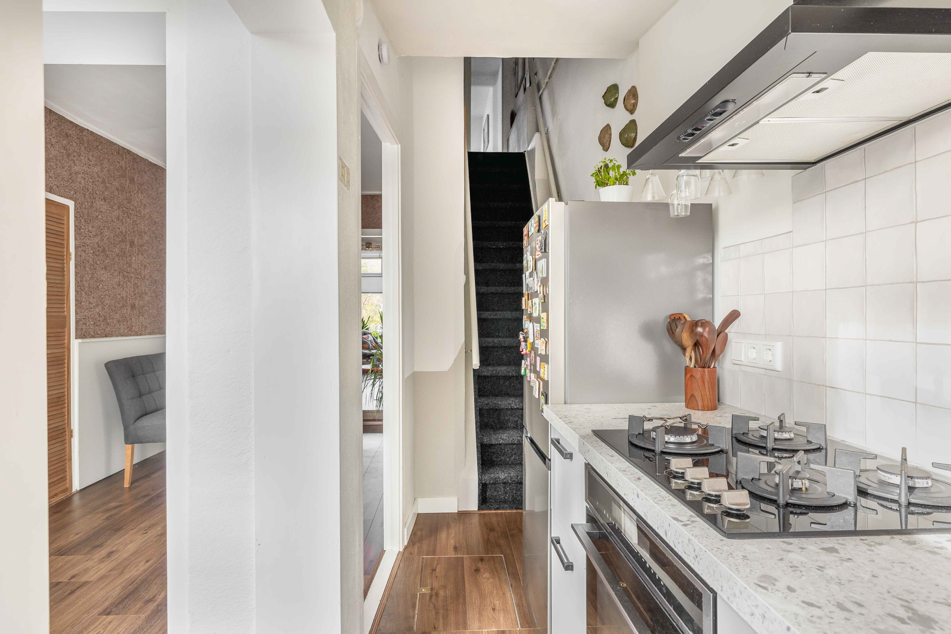 De keuken (2022) is praktisch ingericht en uitgerust met diverse inbouwapparatuur zoals een kookplaat, afzuigkap, combi-oven, koel-/vriescombinatie en vaatwasser. Vanuit hier bereik je zowel het toilet, de trapopgang als de achtertuin.