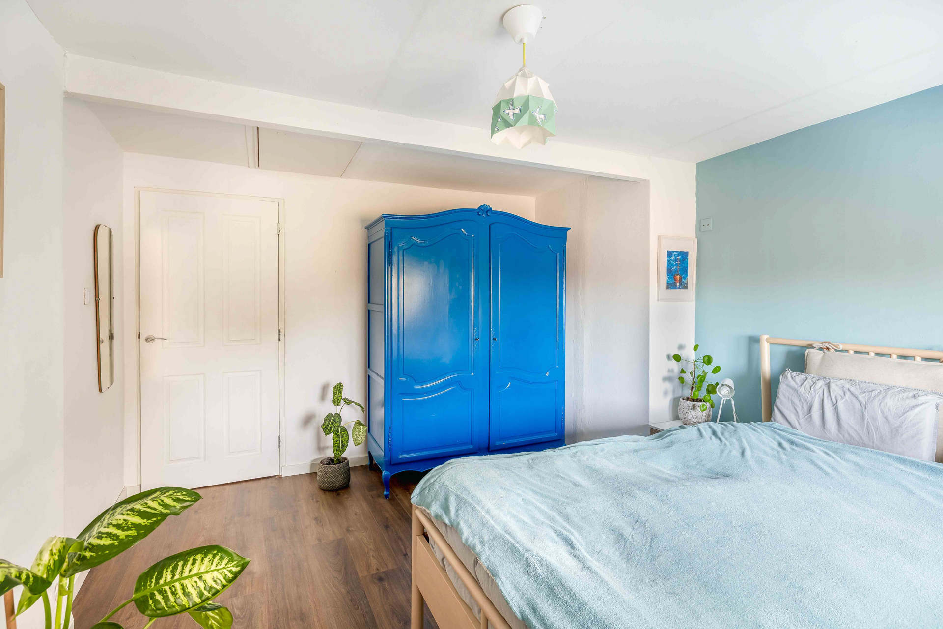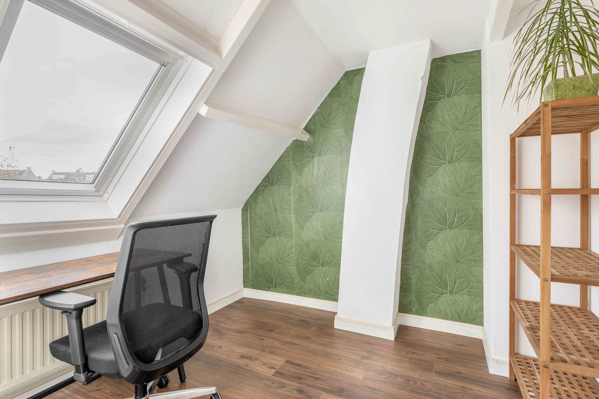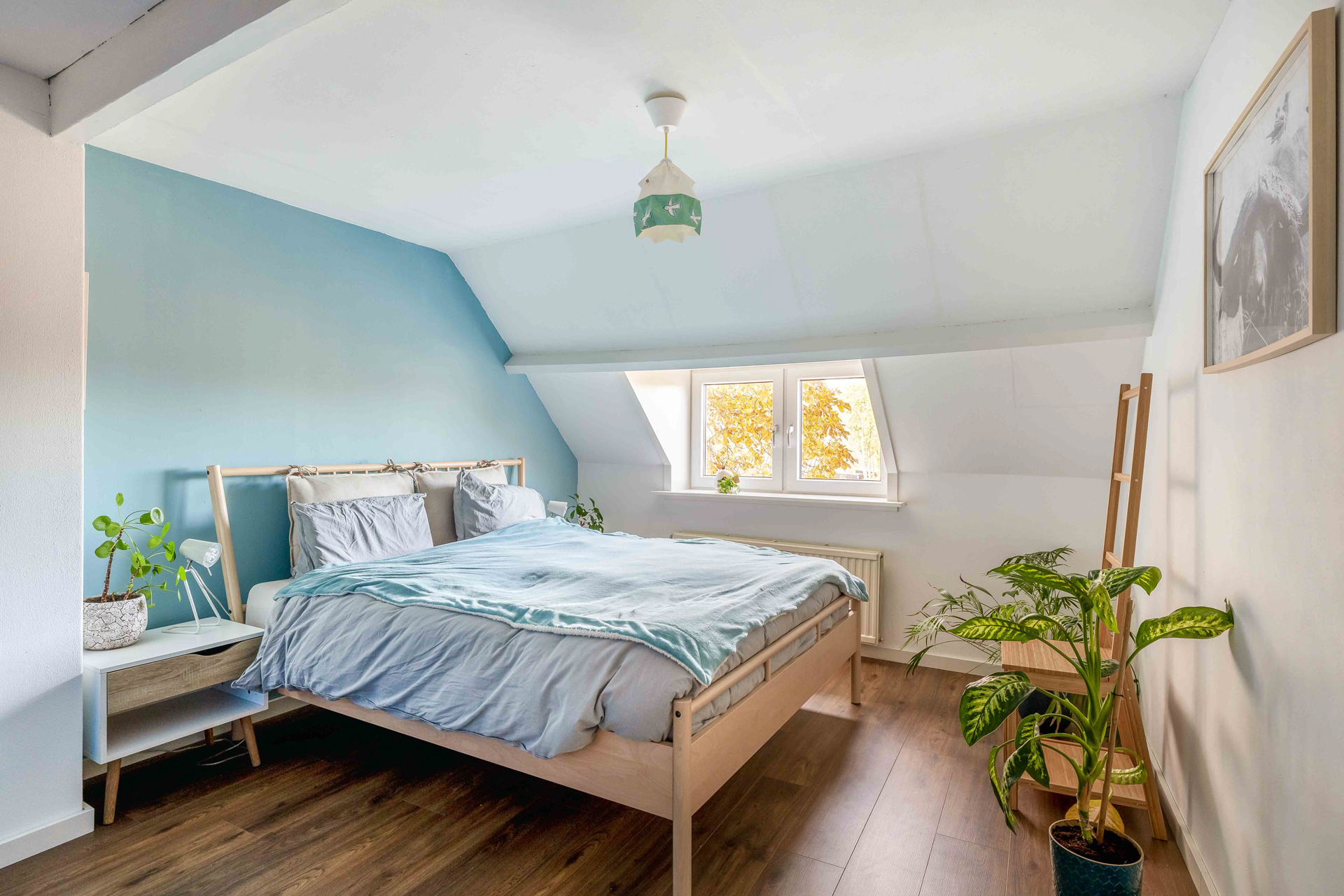 De overloop leidt naar twee lichte slaapkamers met laminaatvloer en dakraam. De royale hoofdslaapkamer aan de voorzijde is extra ruim dankzij de dakkapel (2025) – perfect voor wie graag wat meer ruimte en licht wil.
