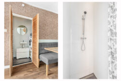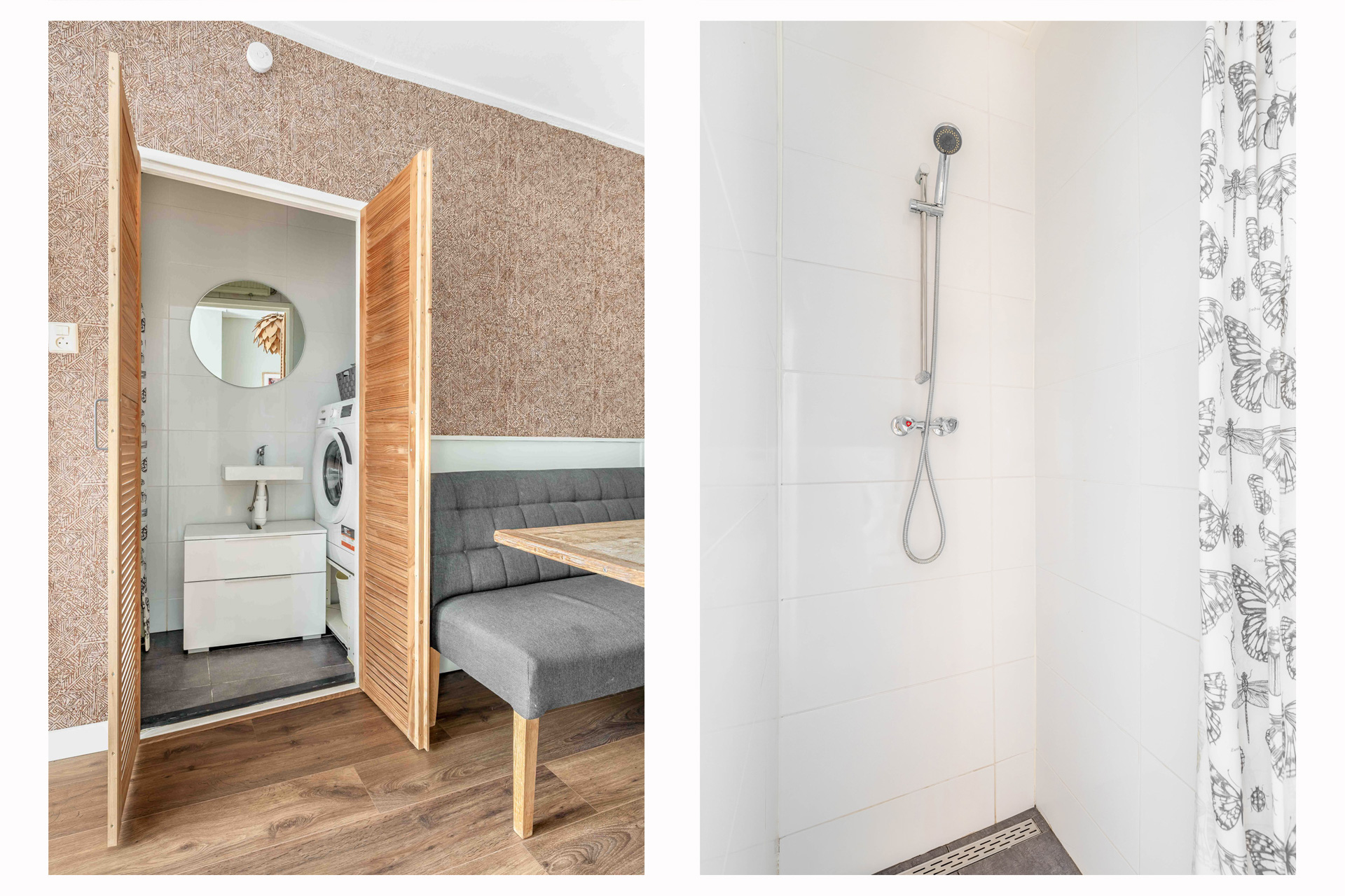 De badkamer, bereikbaar via stijlvolle louvredeuren vanuit de eetkamer, beschikt over een douche, wastafel en witgoedaansluitingen.
