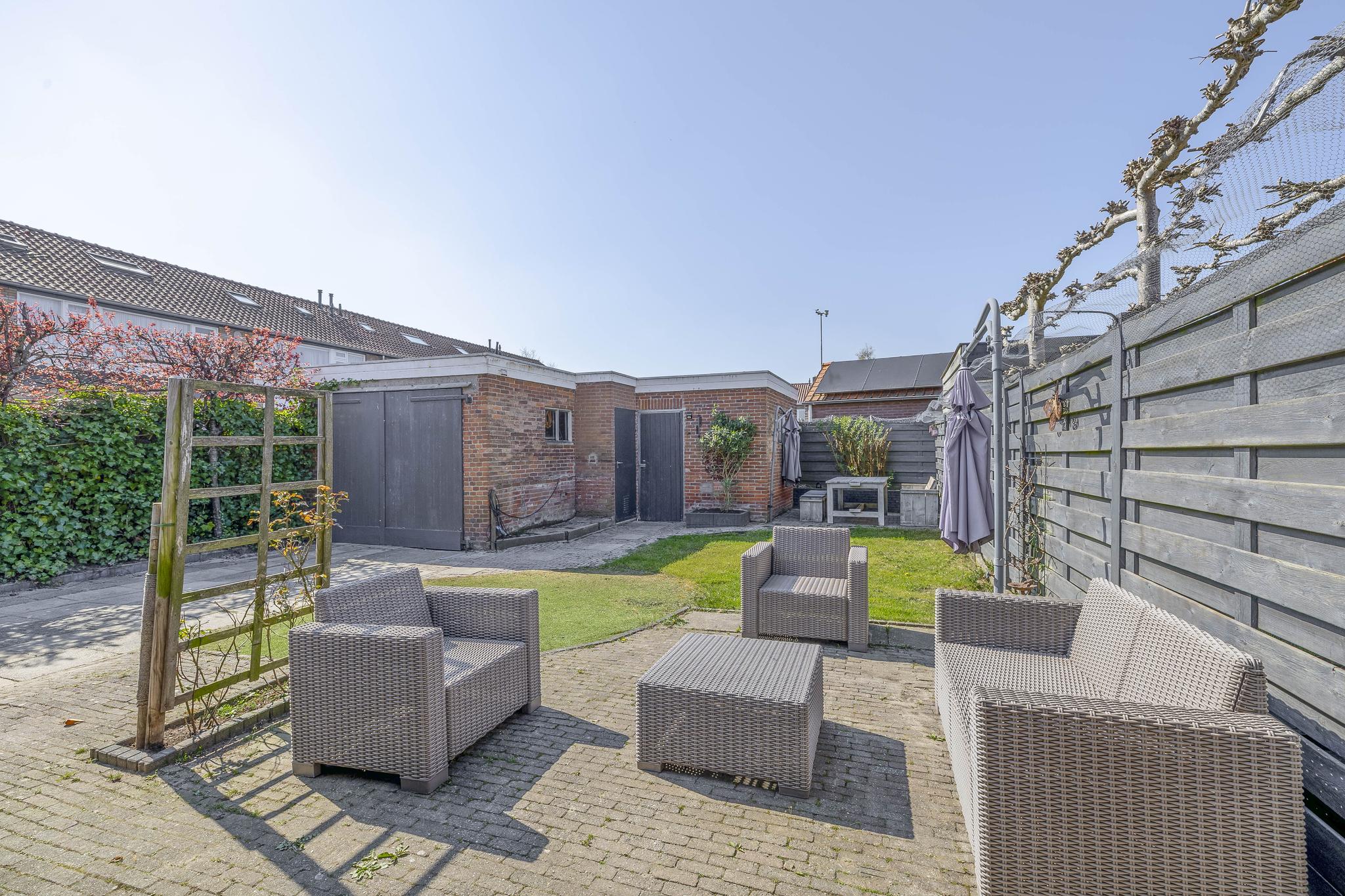 De ruime oprit wordt door middel van een schutting met poort afgesloten van de achtertuin. Links achter in de tuin staat de L-vormige garage. Met zowel groen als schuttingdelen geeft de tuin voldoende privacy en ook volop mogelijkheid om van een heerlijk zonnetje te kunnen genieten.