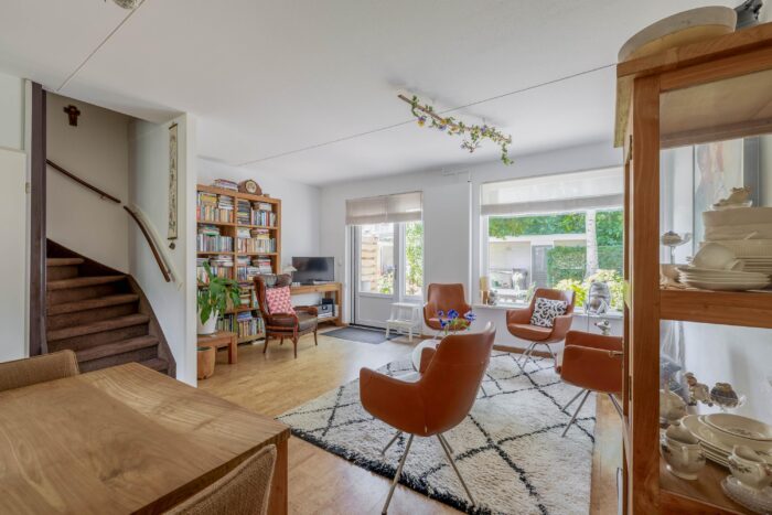 Middels de entreehal, met toilet en meterkast, kom je in de woonkamer met open keuken. Vanuit de woonkamer is er toegang tot de achtertuin en aan de voorzijde van de woning is de open keuken gelegen. De keuken is voorzien van diverse apparatuur, zoals kookplaat, afzuigkap, combi-oven en een koel-vriescombinatie.