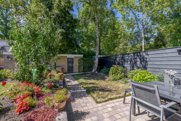 De achtertuin is gelegen op het westen en mede door zijn positie een ideale plek om te vertoeven. De tuin is voorzien van bestrating en beplanting, en vrijwel altijd is er zowel een schaduwrijk als een zonnig plekje te vinden. Achterin de tuin staat een vrijstaande stenen berging en ook is er een achterom.