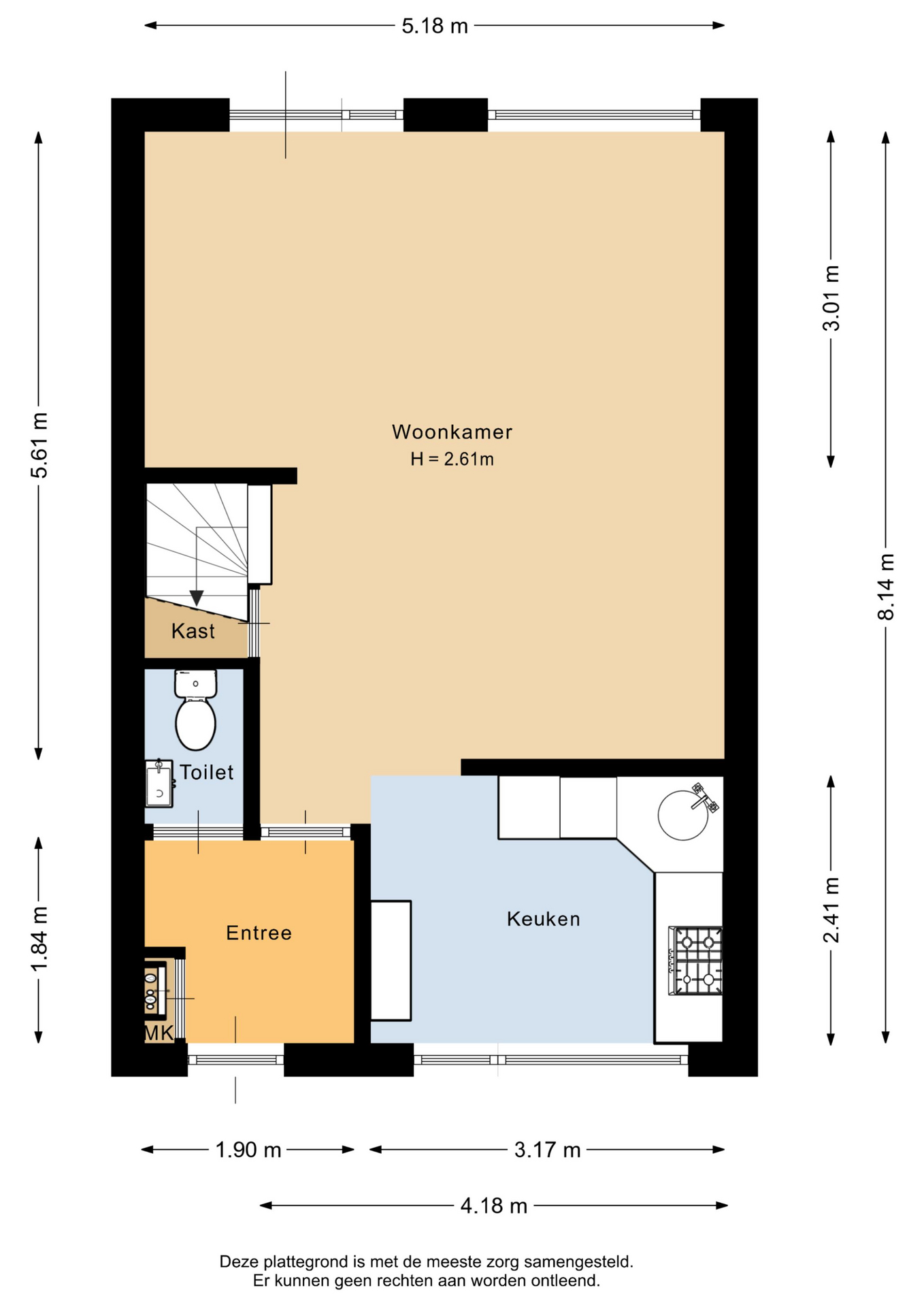 Middels de entreehal, met toilet en meterkast, kom je in de woonkamer met open keuken. Vanuit de woonkamer is er toegang tot de achtertuin en aan de voorzijde van de woning is de open keuken gelegen. De keuken is voorzien van diverse apparatuur, zoals kookplaat, afzuigkap, combi-oven en een koel-vriescombinatie.