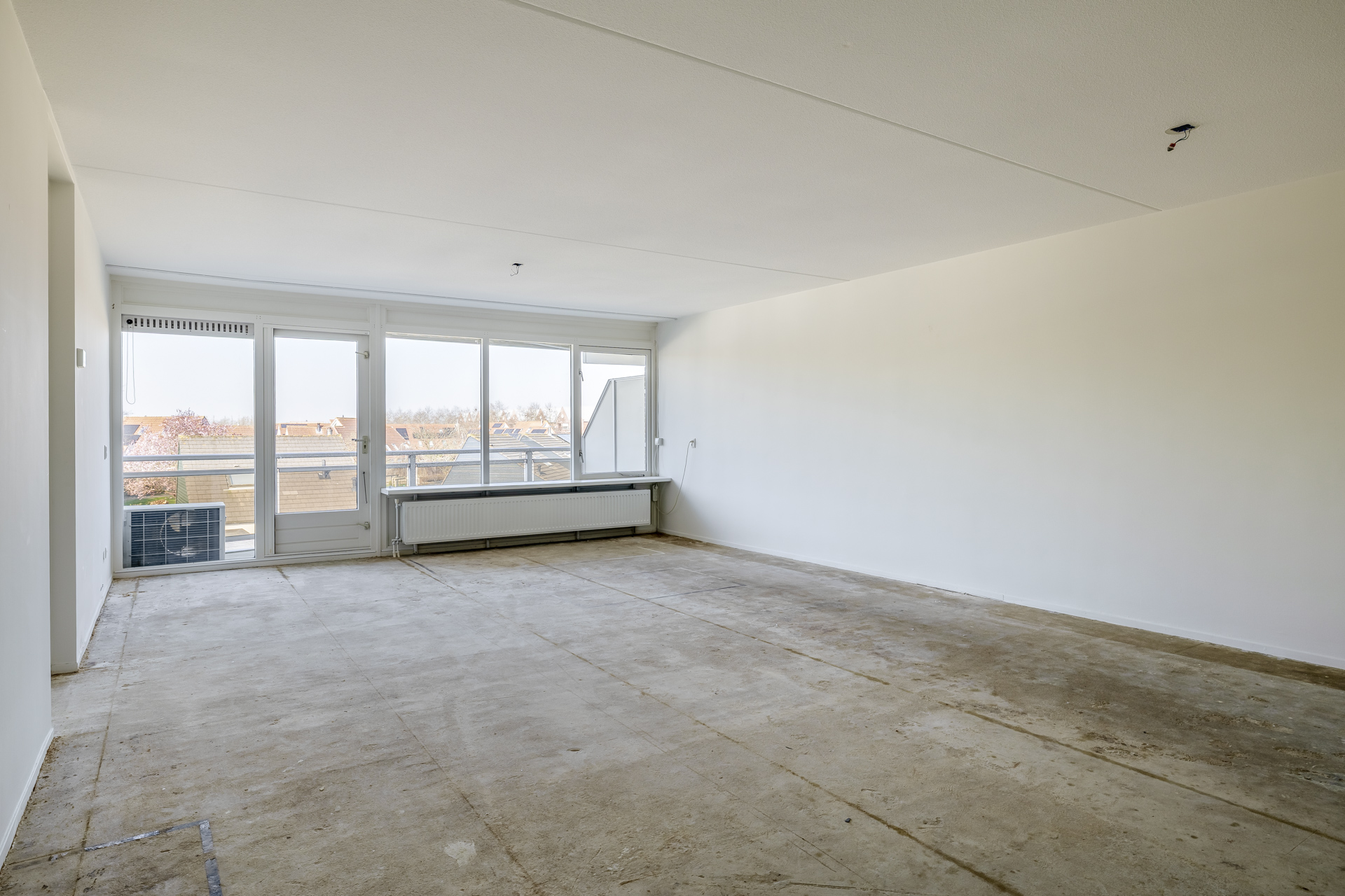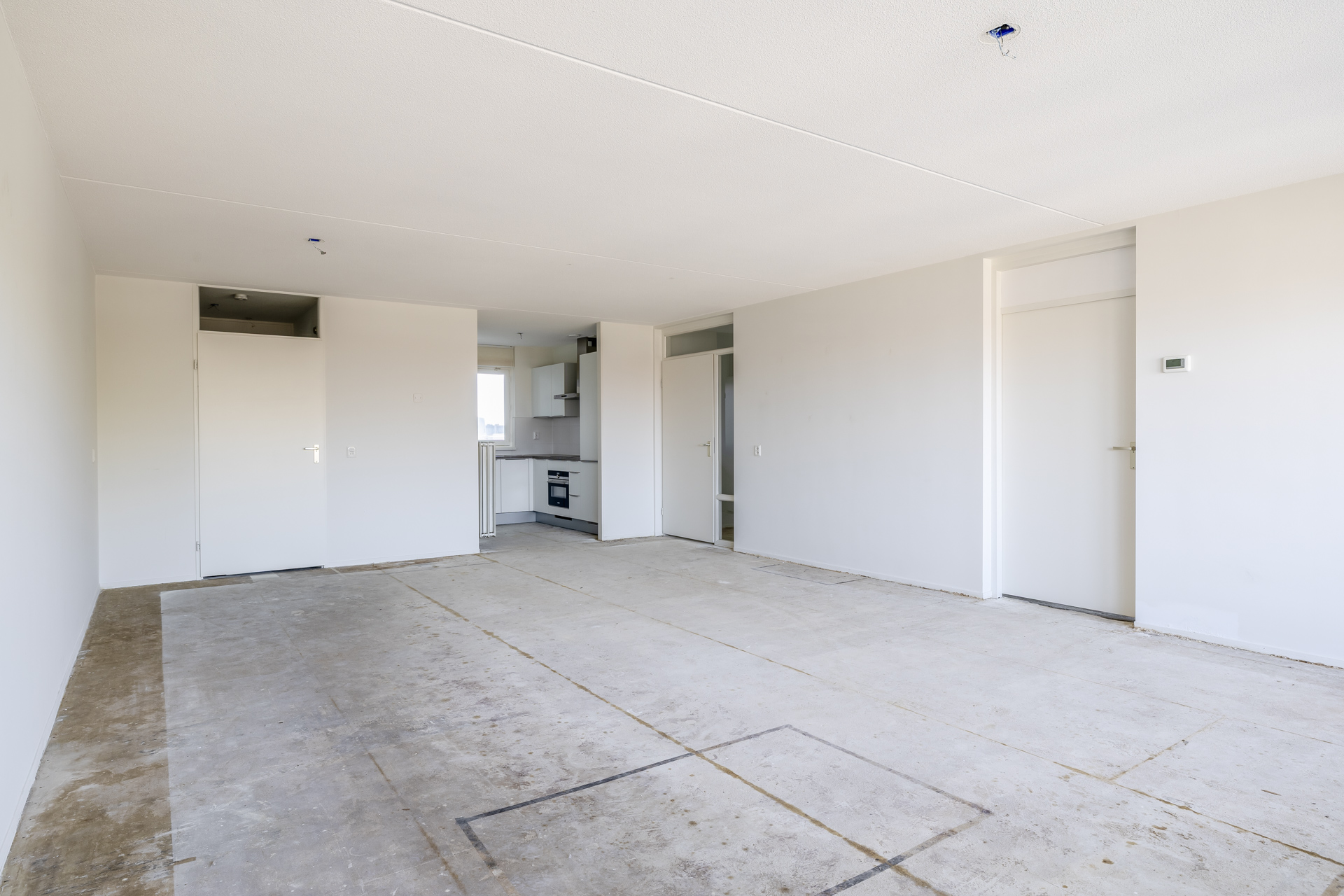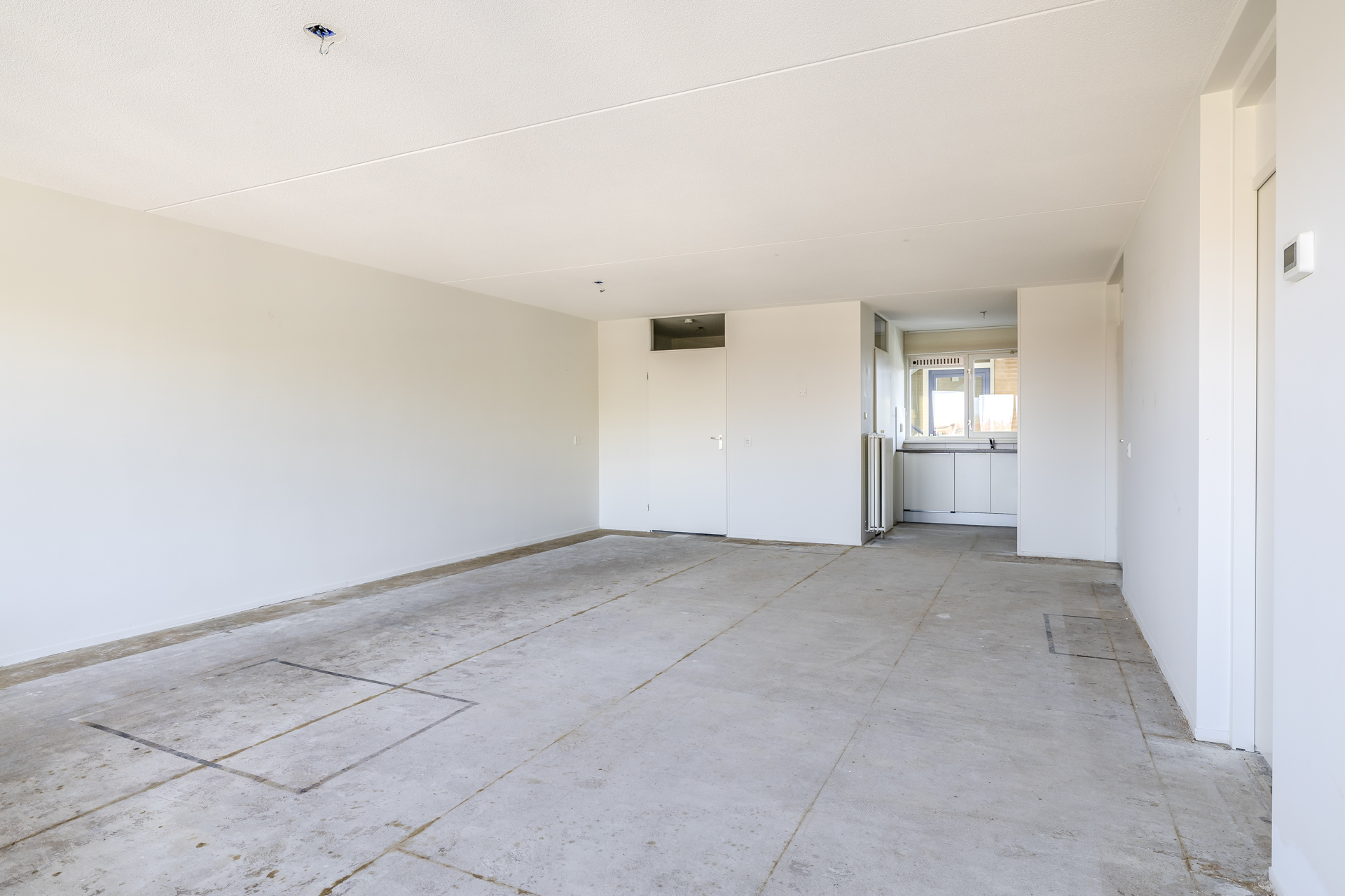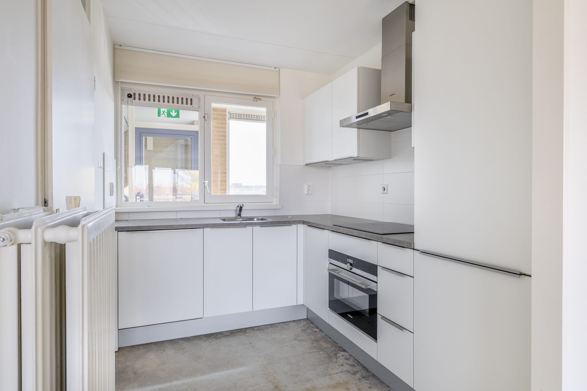 Het complex verwelkomt je met zowel een verzorgd trappenhuis als een lift, comfortabel en toegankelijk. Bij binnenkomst in de woning zelf ontvouwt zich een lichte woonkamer met open keuken, een ruimte die uitnodigt tot samenzijn en ontspanning. De brede raampartijen aan de achterzijde zorgen voor een prachtige lichtinval en leiden je naar het balkon, een zonnige plek waar je de dag stijlvol begint en ontspannen afsluit. De open keuken aan de voorzijde is praktisch ingericht en voorzien van diverse inbouwapparatuur, ideaal voor wie houdt van koken en genieten. Aangrenzend bevindt zich de bijkeuken, een waardevolle toevoeging voor extra gemak en bergruimte.