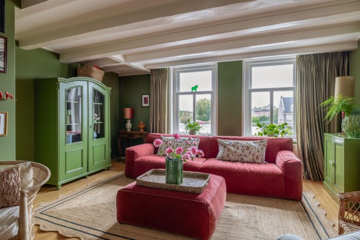 Via de keuken kom je in de hoger gelegen woonkamer. Ook hier is met liefde aan ieder detail gedacht. De grote ramen laten het daglicht zacht naar binnen stromen, terwijl het balkenplafond de ruimte een knusse en karaktervolle uitstraling geeft. Een woonkamer waar je tot rust komt, maar ook gezellige avonden met vrienden of fijne momenten met z’n tweeën beleeft.