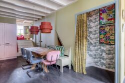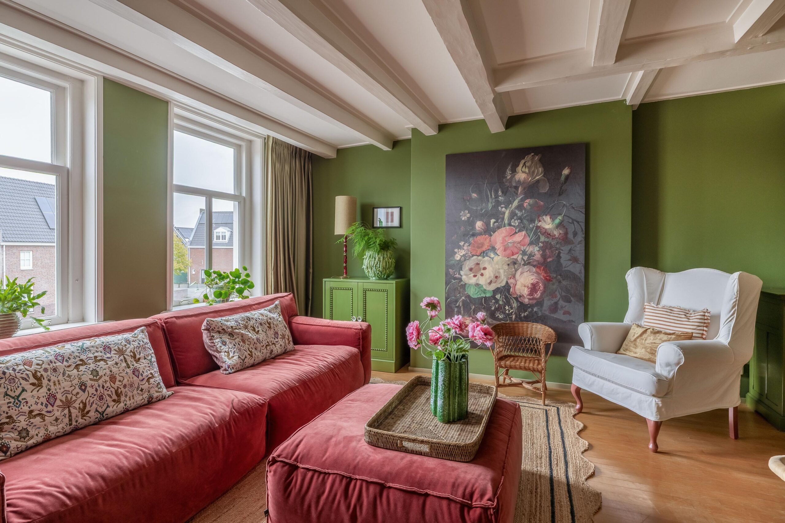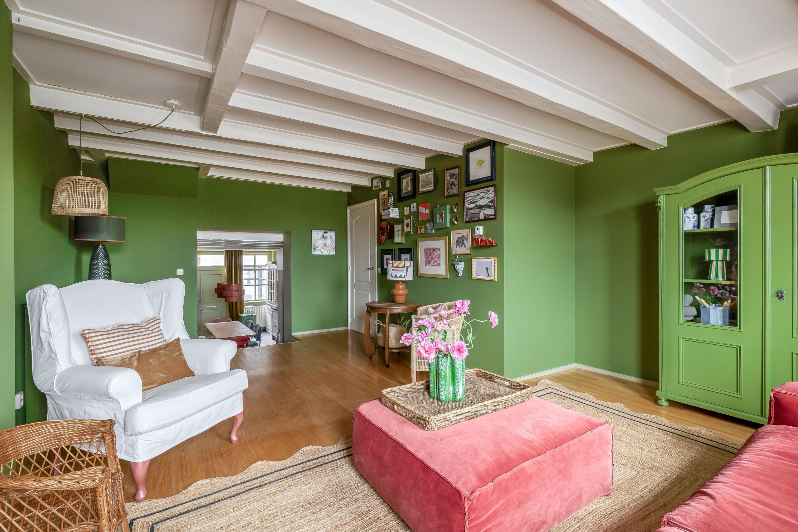 Via de keuken kom je in de hoger gelegen woonkamer. Ook hier is met liefde aan ieder detail gedacht. De grote ramen laten het daglicht zacht naar binnen stromen, terwijl het balkenplafond de ruimte een knusse en karaktervolle uitstraling geeft. Een woonkamer waar je tot rust komt, maar ook gezellige avonden met vrienden of fijne momenten met z’n tweeën beleeft.