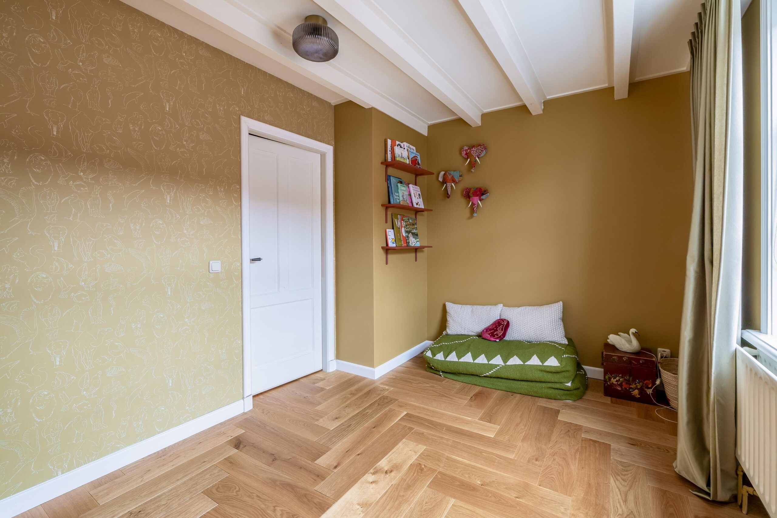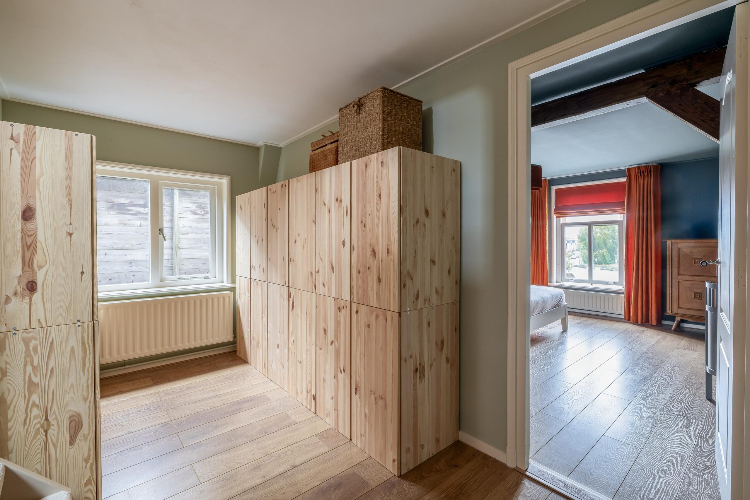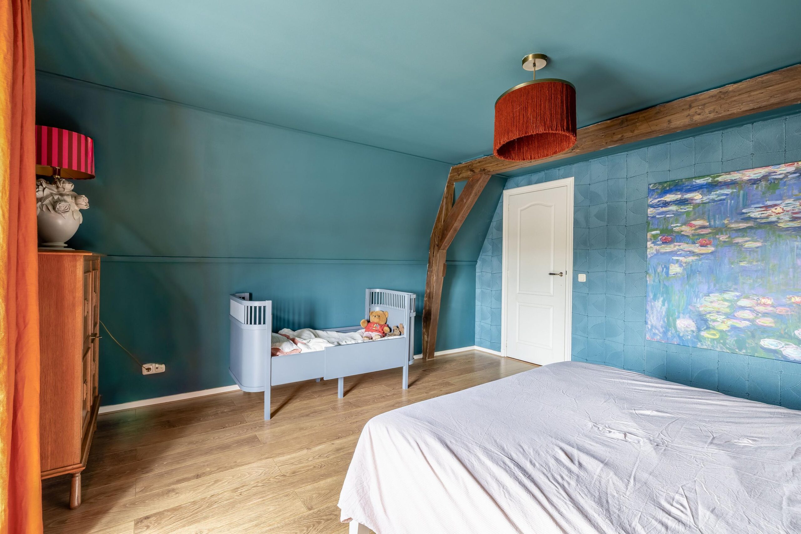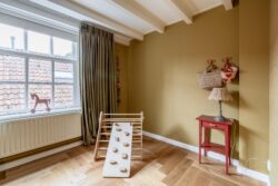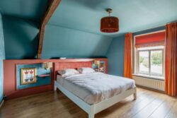 Via een kleine trap bereik je de hoger gelegen derde verdieping, waar zich nóg een sfeervolle slaapkamer bevindt. De ruime overloop biedt genoeg plek voor bijvoorbeeld een handige opbergkast. In de slaapkamer zorgen de authentieke houten balken voor karakter en warmte, terwijl het lage raam een charmant uitzicht over de omgeving geeft. Een plek die rust en geborgenheid ademt.