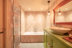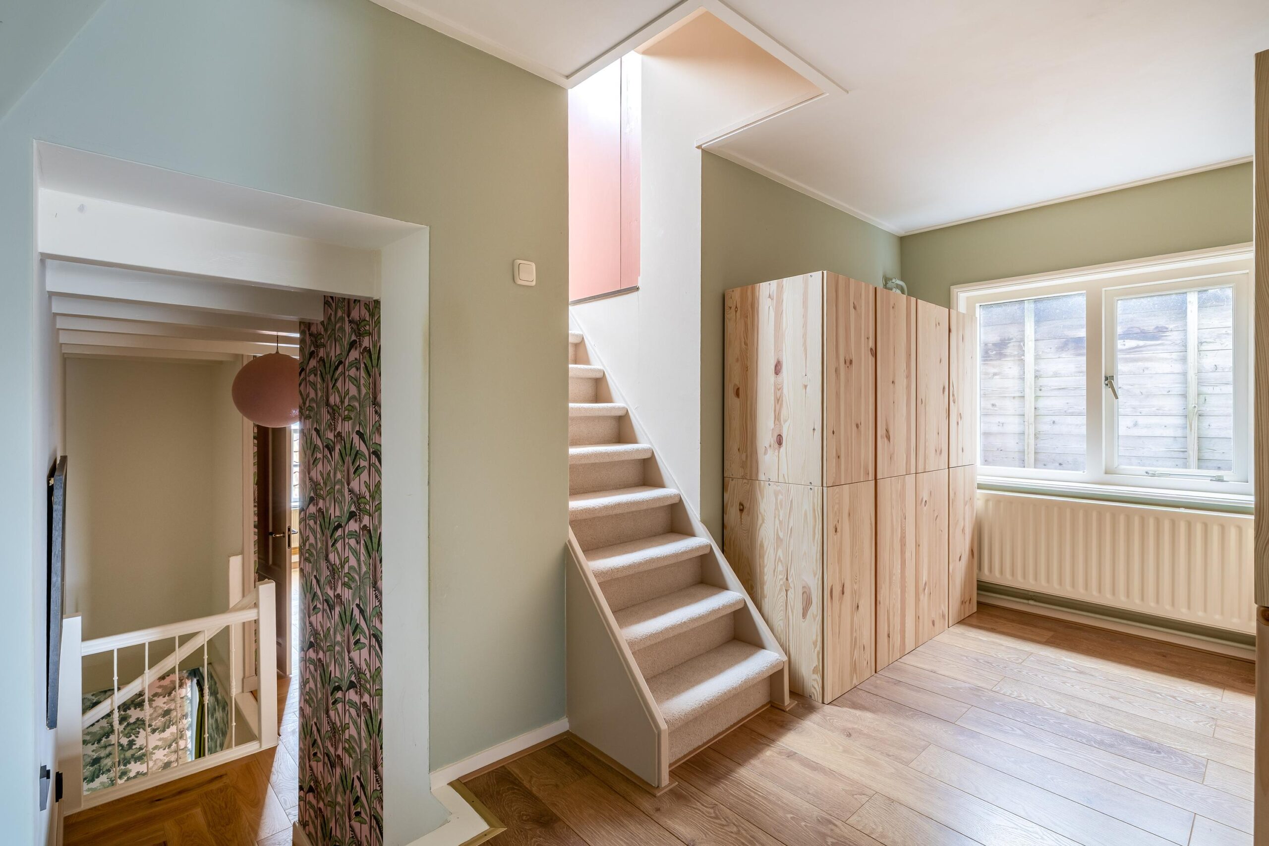 Vanuit de keuken bereik je de tweede verdieping. Op de overloop vind je de slaapkamer aan de voorzijde, de badkamer en een separaat toilet. De slaapkamer is met stijl ingericht, waardoor het een rustgevende plek is om je terug te trekken. Ook in de badkamer is niets aan het toeval overgelaten: een luxe inloopdouche met regendouche, een ruim badkamermeubel met elegante waskom, een ligbad om in weg te dromen en een stijlvolle designradiator. Dit is een badkamer waar ontspanning centraal staat – een plek om echt tot rust te komen.
