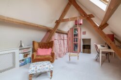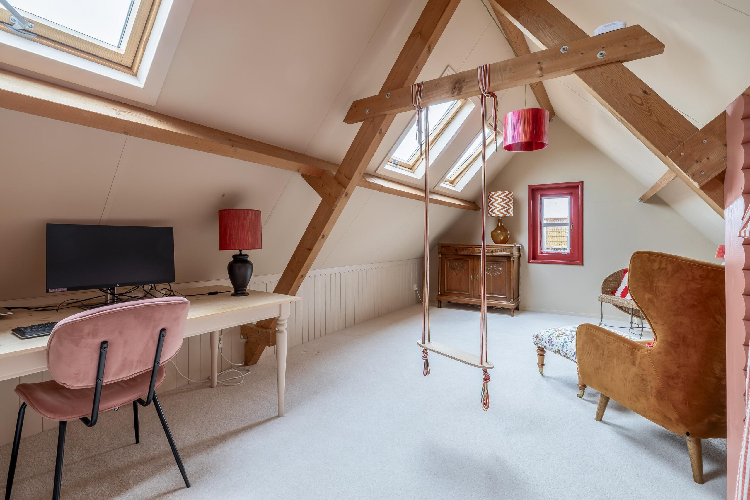 Op de hoogst gelegen verdieping, in de nok van het huis, bevindt zich de derde slaapkamer. Dankzij maar liefst drie dakramen en een zijraam wordt de ruimte overspoeld met natuurlijk licht, waardoor het een lichte en uitnodigende plek is om te ontspannen of dromen waar te maken.