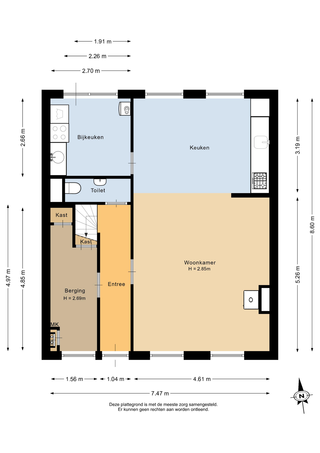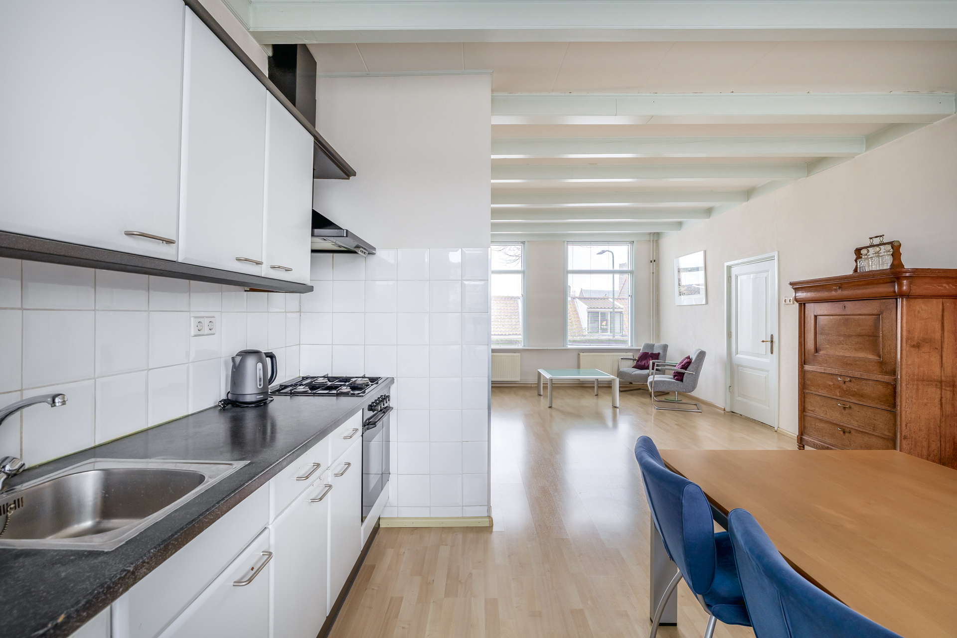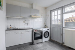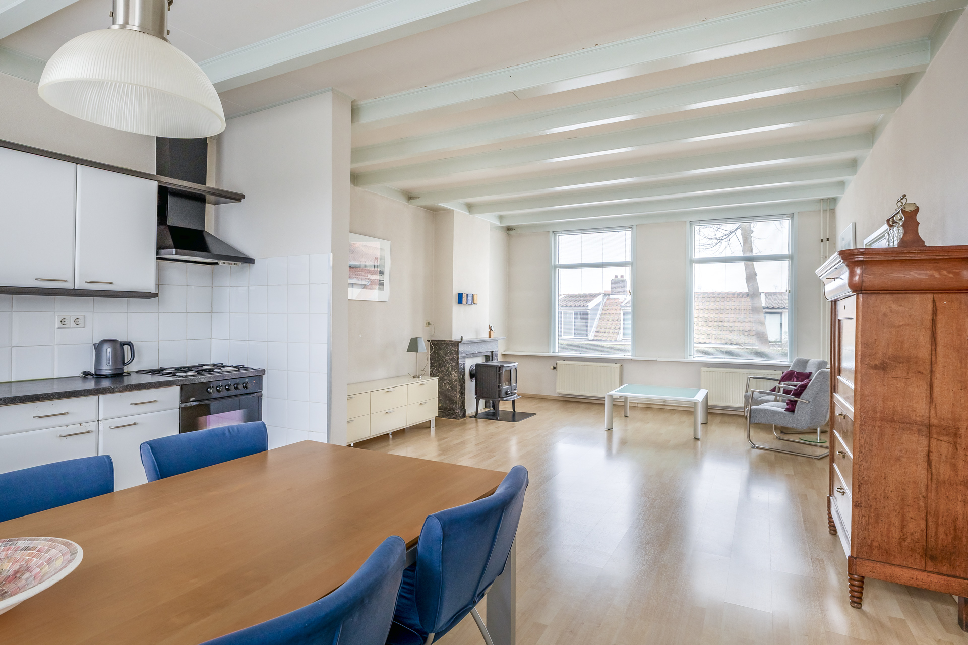 De begane grond verwelkomt u met een lichte woonkamer van circa 24 m², waar grote raampartijen zorgen voor een prettige en natuurlijke lichtinval. De open keuken staat in directe verbinding met de woonkamer en creëert een ruimtelijk geheel, ideaal voor comfortabel wonen en ontspannen samenzijn. De houtkachel in de woonkamer versterkt het authentieke karakter. Via de keuken bereikt u de bijkeuken met directe toegang tot de tuin. Daarnaast bevindt zich op de begane grond een praktische berging, perfect voor extra opslagruimte.