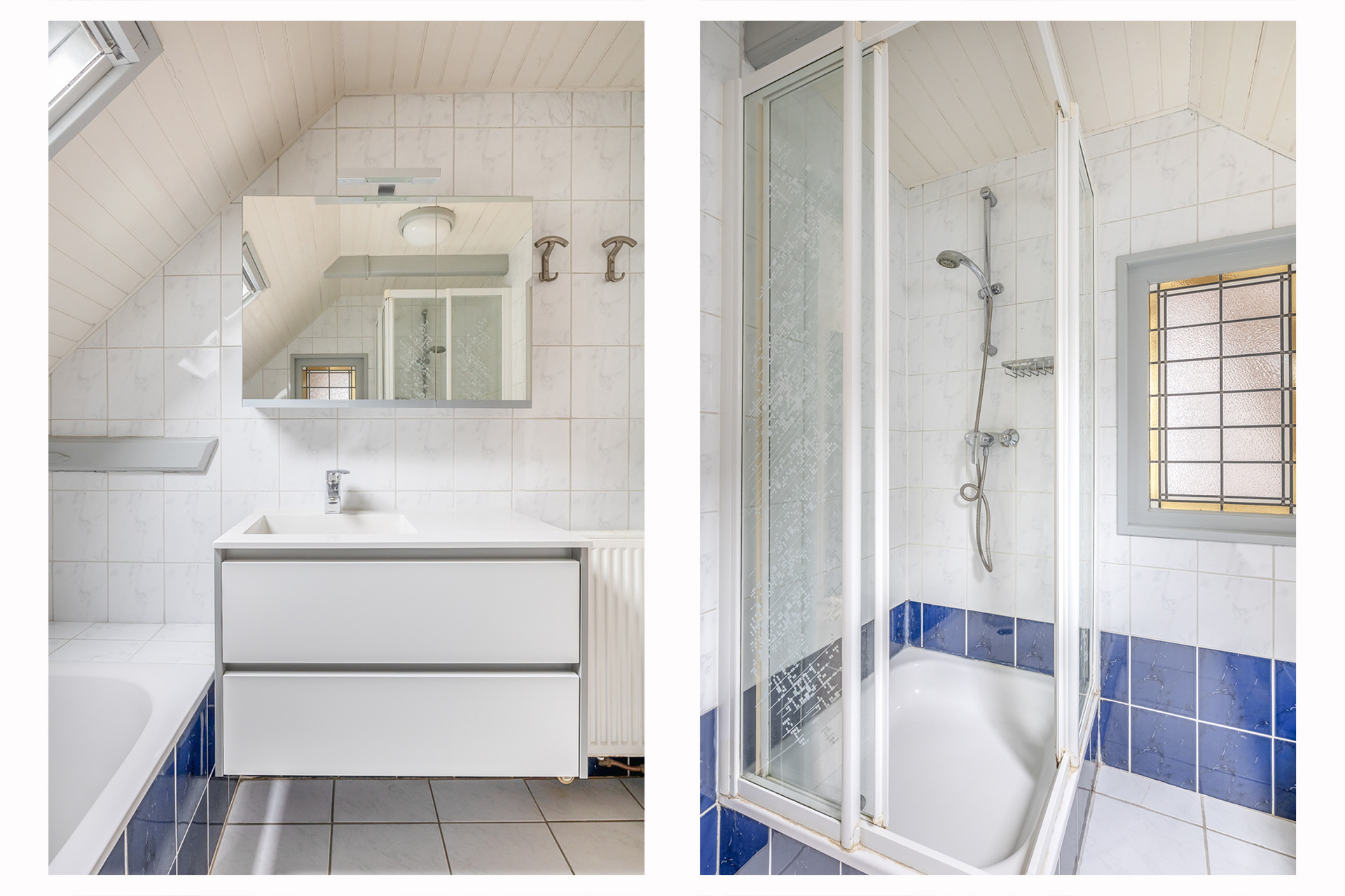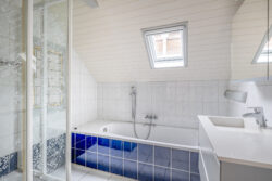 Op de eerste verdieping bevinden zich vier volwaardige slaapkamers en een volledig betegelde badkamer met een ligbad, douche en wastafelmeubel. Het authentieke balkenplafond, zichtbaar in zowel de woonkamer als op deze verdieping, onderstreept de historische charme en maakt het geheel bijzonder sfeervol.