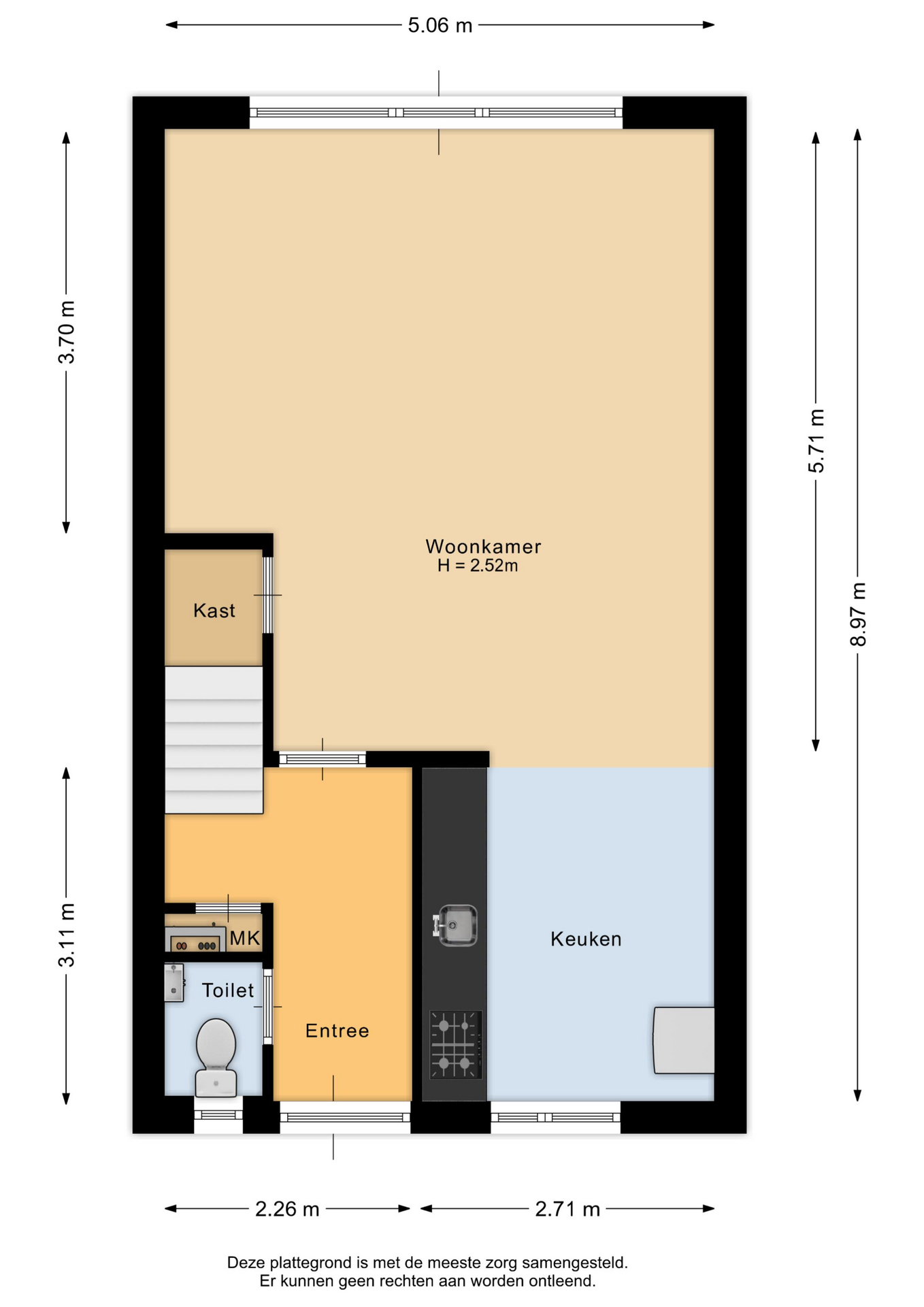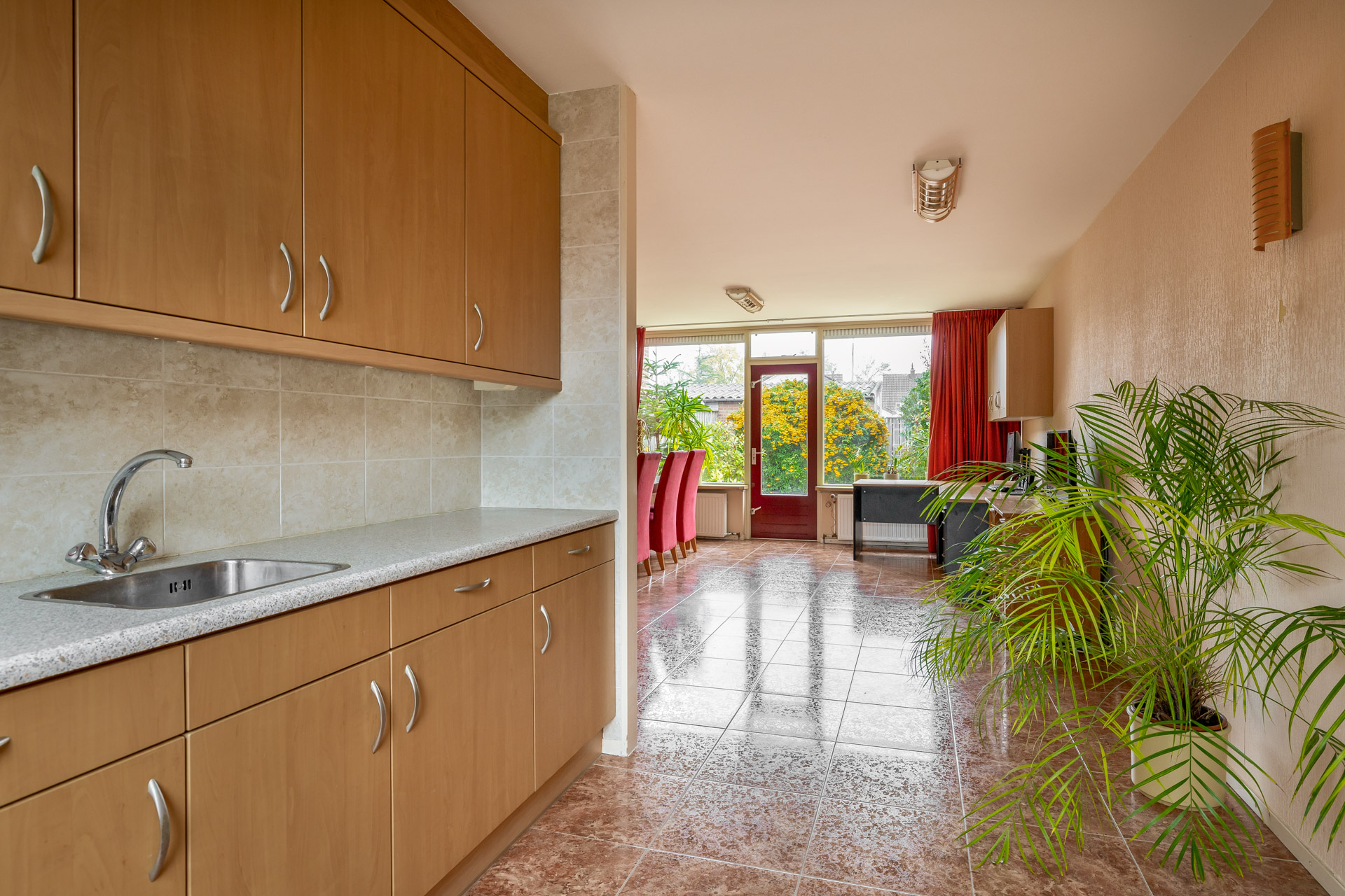 De entreehal, met toilet, meterkast en trapopgang, geeft toegang tot de woon-/eetkamer en de keuken. De woon-/eetkamer is voorzien van een plavuizen vloer met vloerverwarming, een vaste kast onder de trap en een deur naar de achtertuin. De grote raampartijen zorgen voor veel natuurlijke lichtinval. Aan de voorzijde is de open keuken gesitueerd. De keuken, met vloerverwarming, is voorzien van opbergruimte en diverse apparatuur: kookplaat, afzuigkap, combi-oven en koelkast.